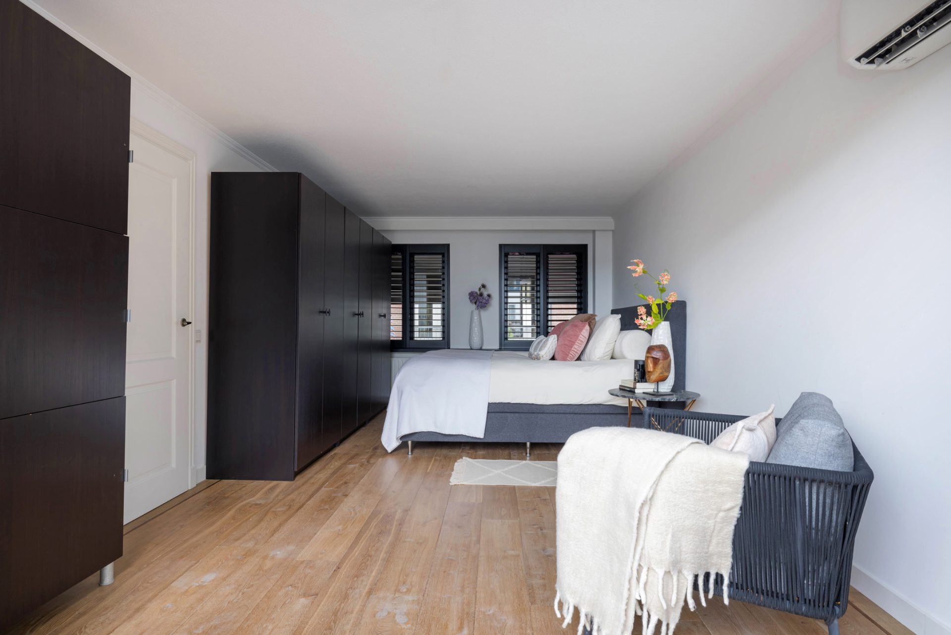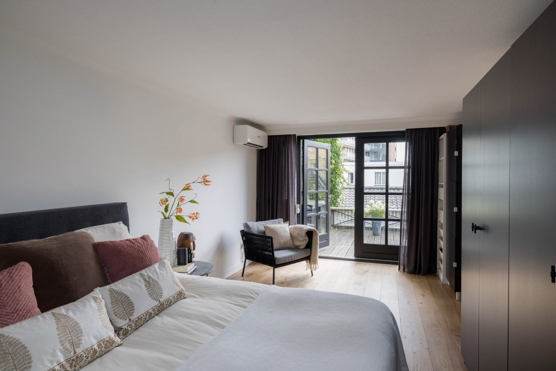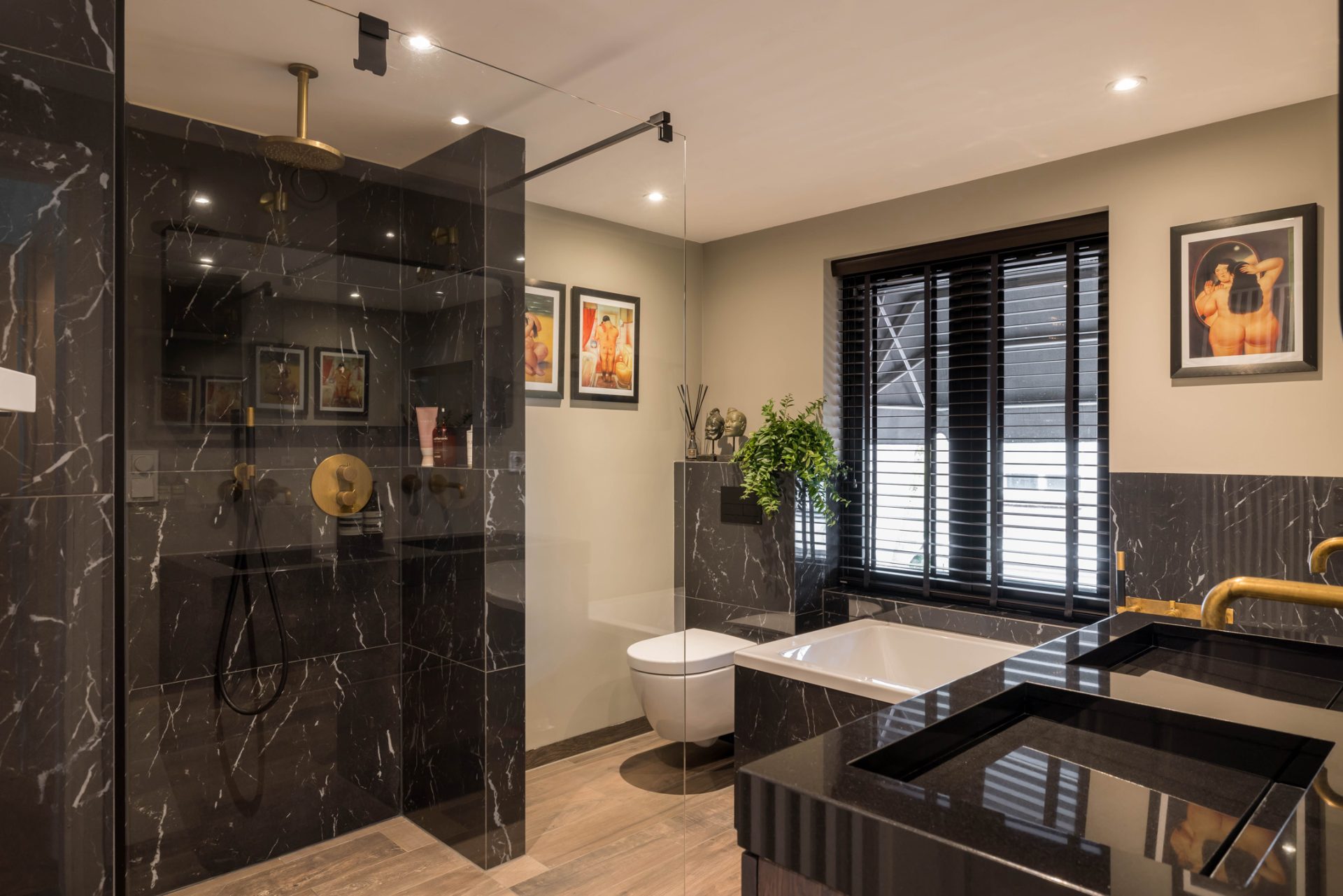 De master bedroom met openslaande deuren naar het dakterras biedt, gezien de oppervlakte, de mogelijkheid om een extra (slaap)kamer te realiseren. De badkamer met zwart marmer, goudkleurige kranen en luxe sanitair is een lust voor het oog. Zowel voor bad- als doucheliefhebbers is dit een droombadkamer.
