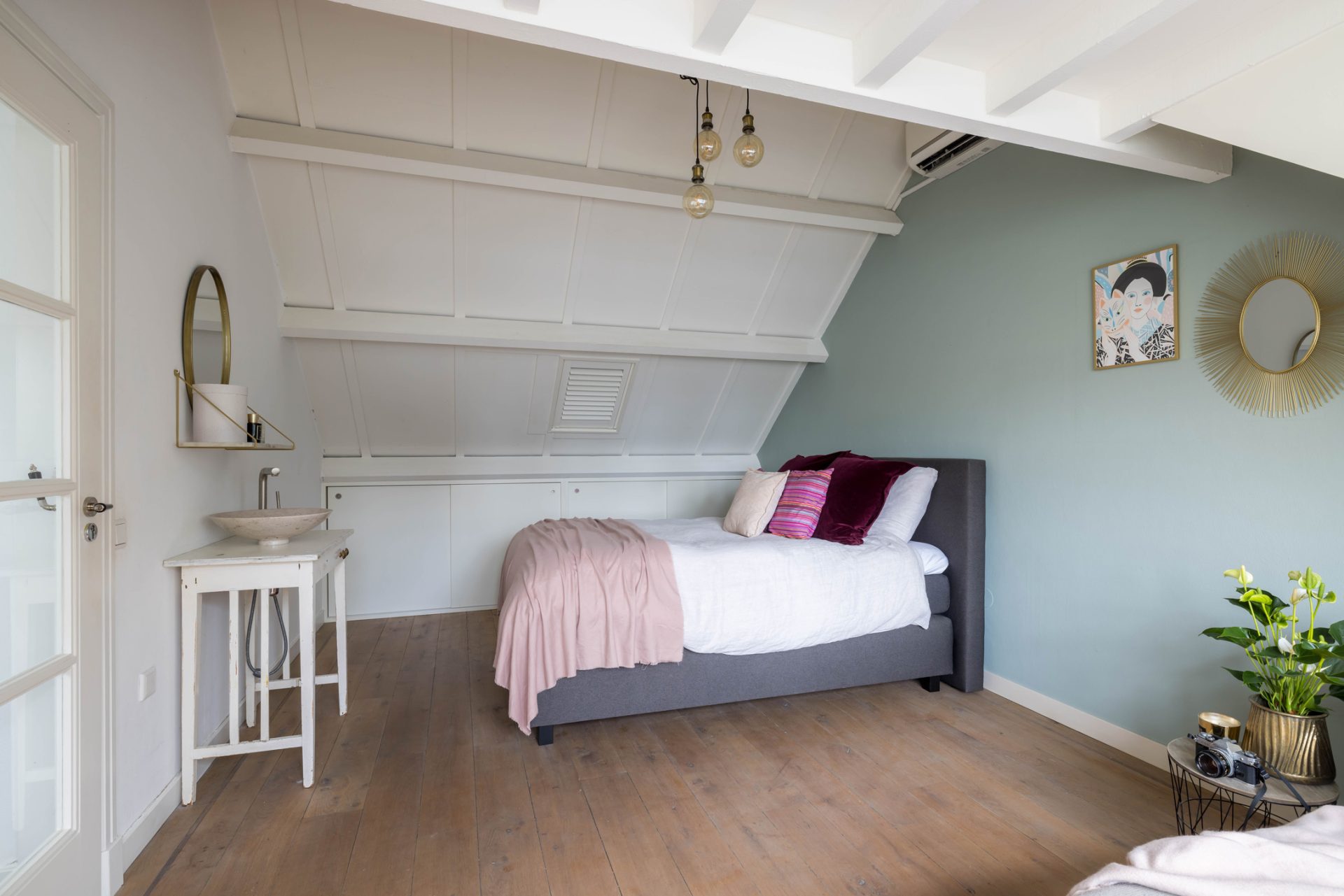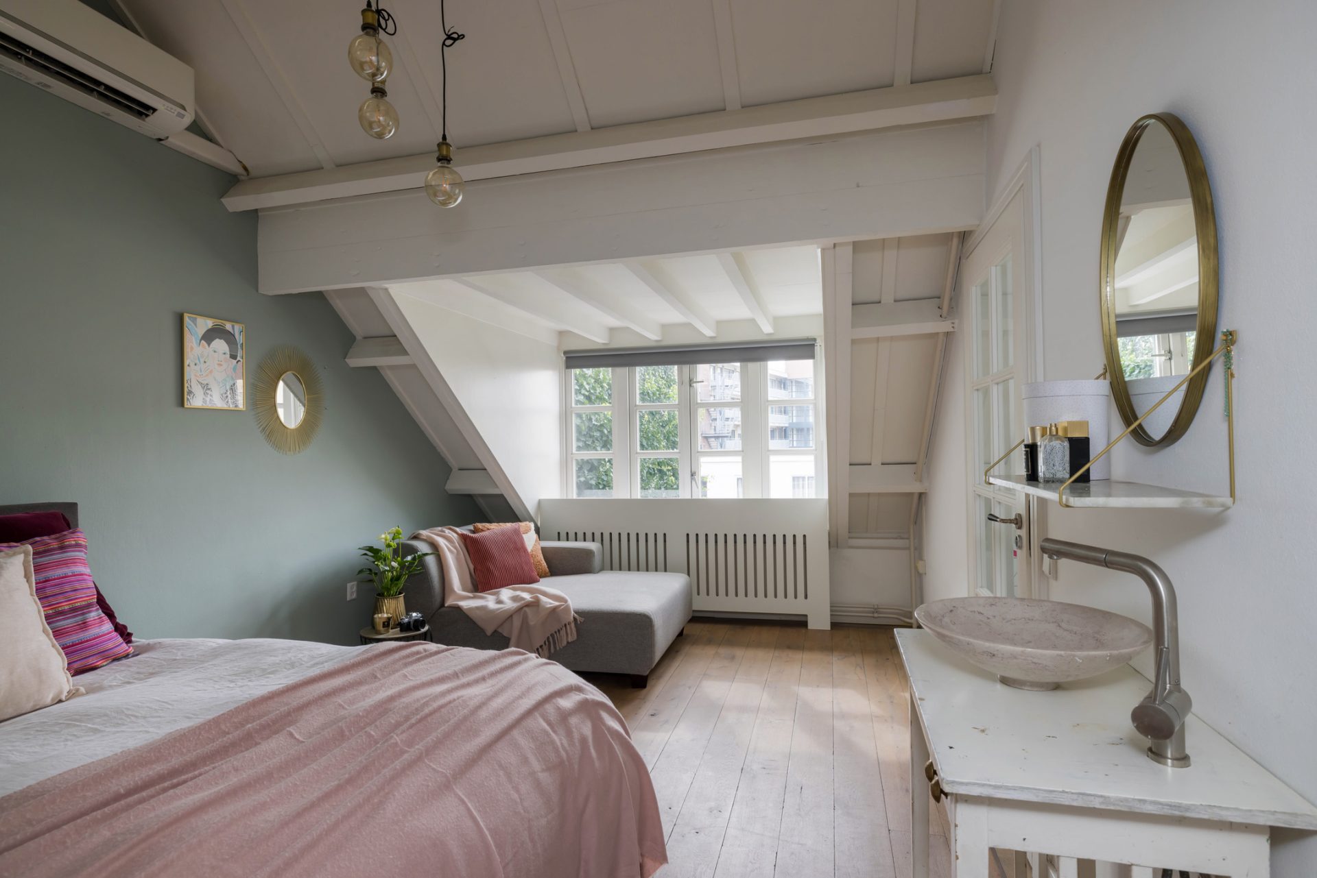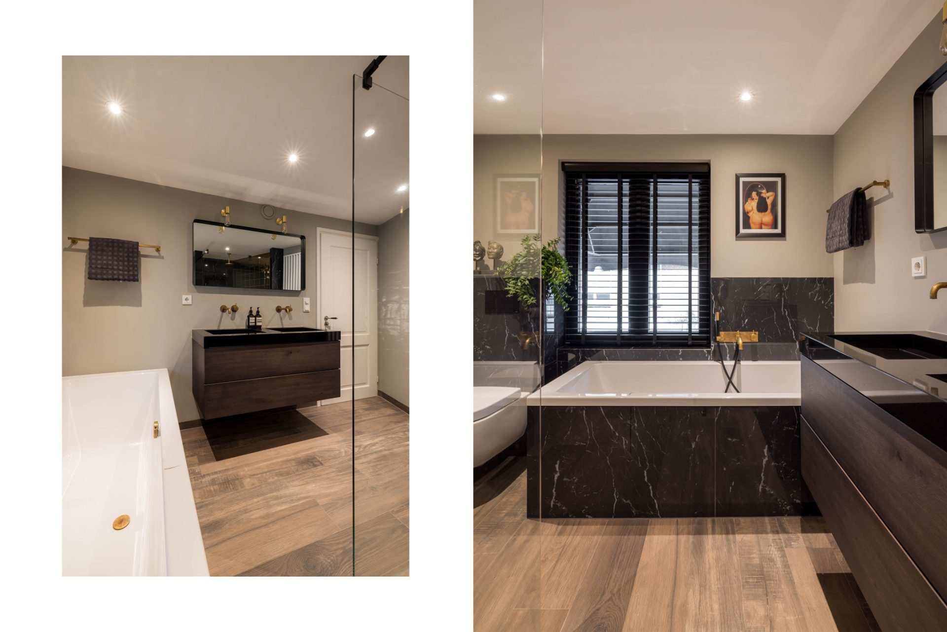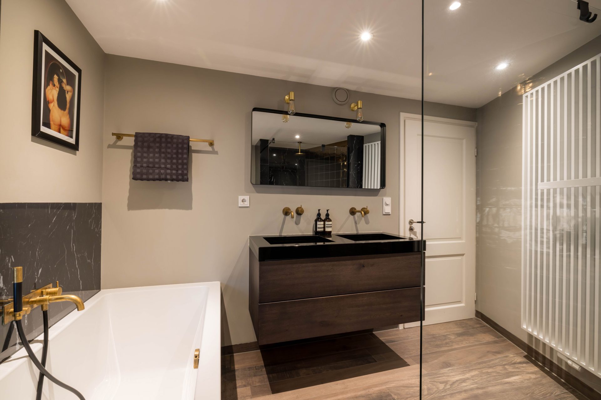 De master bedroom met openslaande deuren naar het dakterras biedt, gezien de oppervlakte, de mogelijkheid om een extra (slaap)kamer te realiseren. De badkamer met zwart marmer, goudkleurige kranen en luxe sanitair is een lust voor het oog. Zowel voor bad- als doucheliefhebbers is dit een droombadkamer.