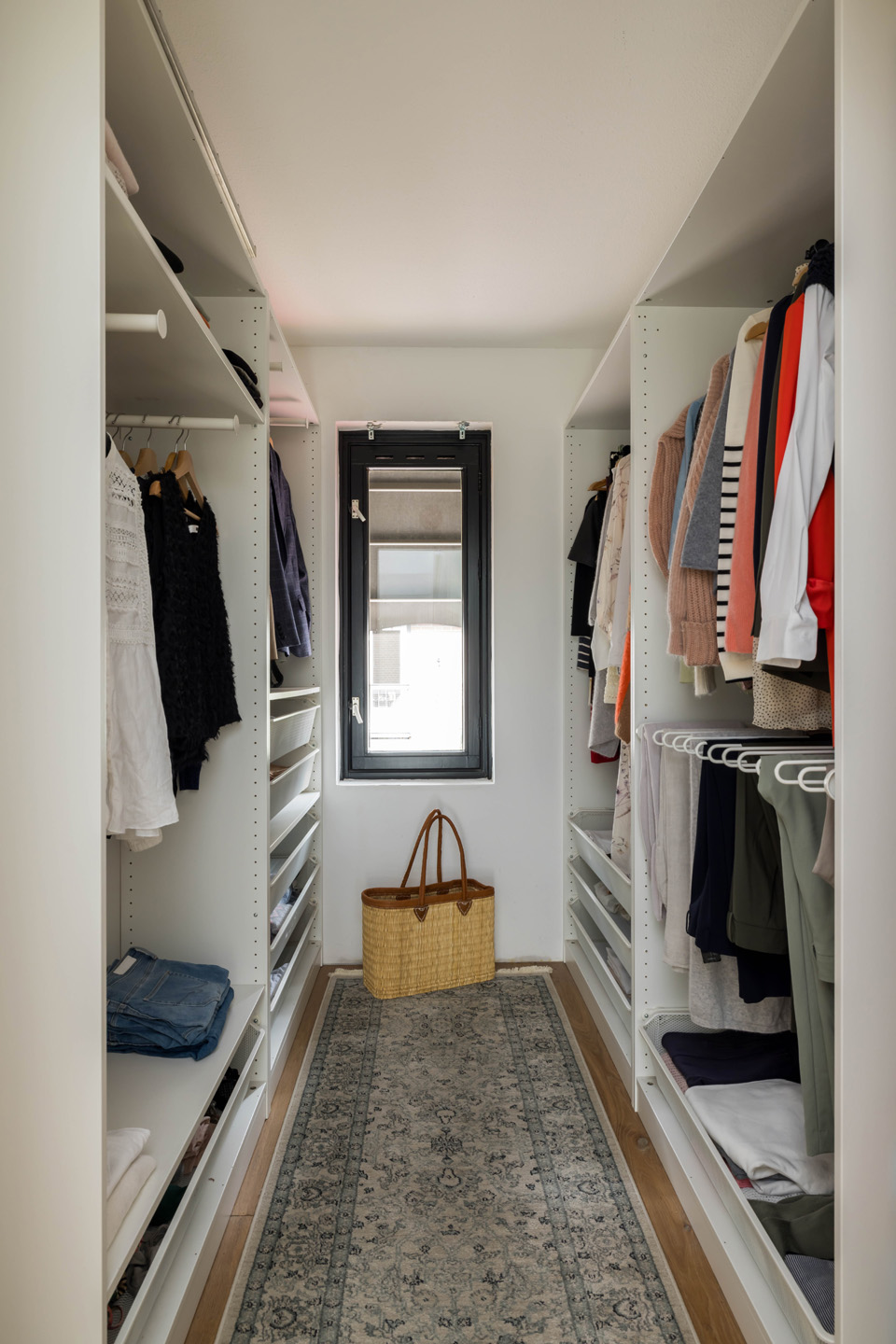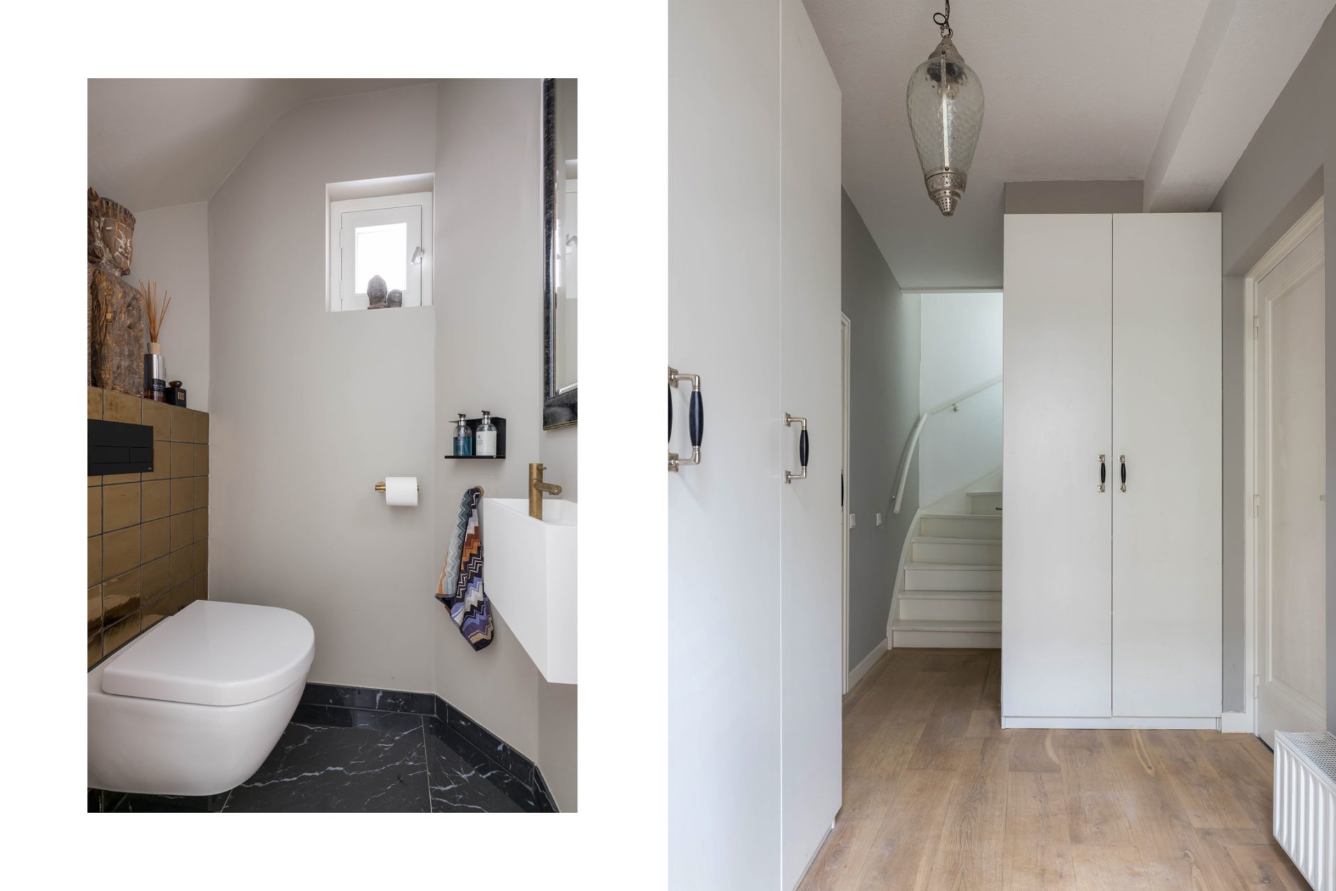 De hal met houten vloer en op maat gemaakte kasten staat in verbinding met de woonkamer en de stijlvolle toiletruimte (2019). Ook zie je, aan het einde van de hal, de trap naar de eerste verdieping.