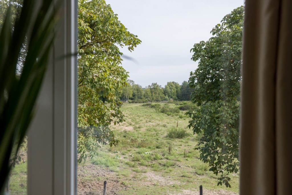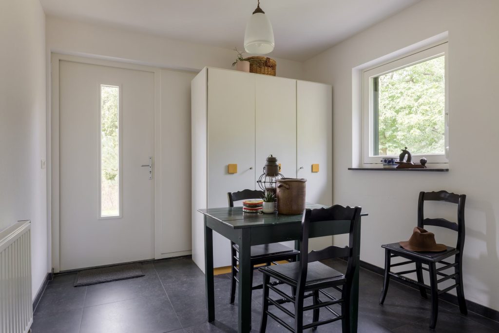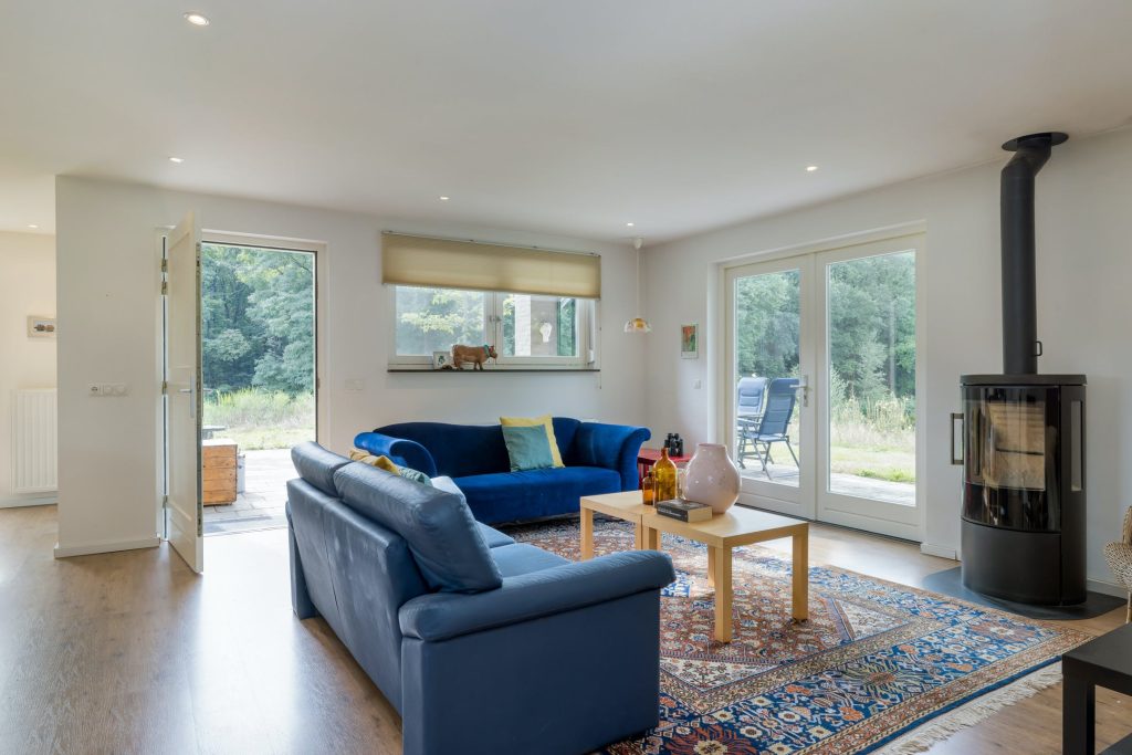 De woonkamer met open keuken is een mooie leefruimte rondom een houtkachel en heeft een prachtig uitzicht over het landgoed en het ven. Vanuit de woonkamer is er toegang tot een overdekt terras.