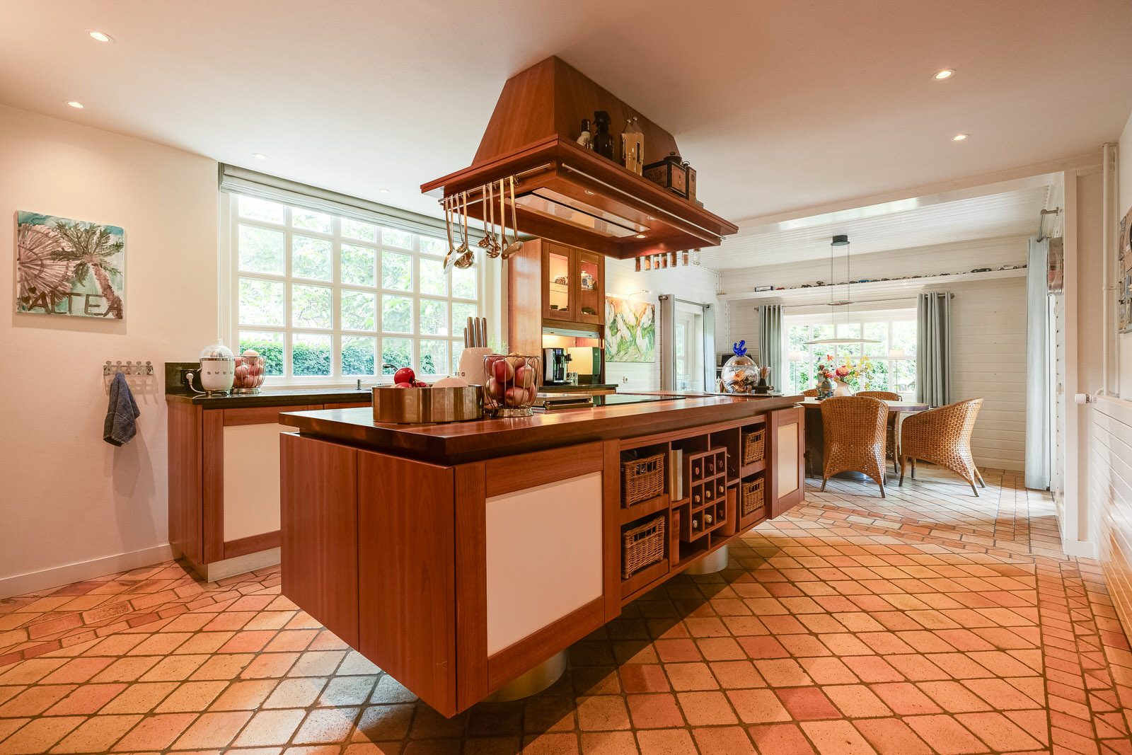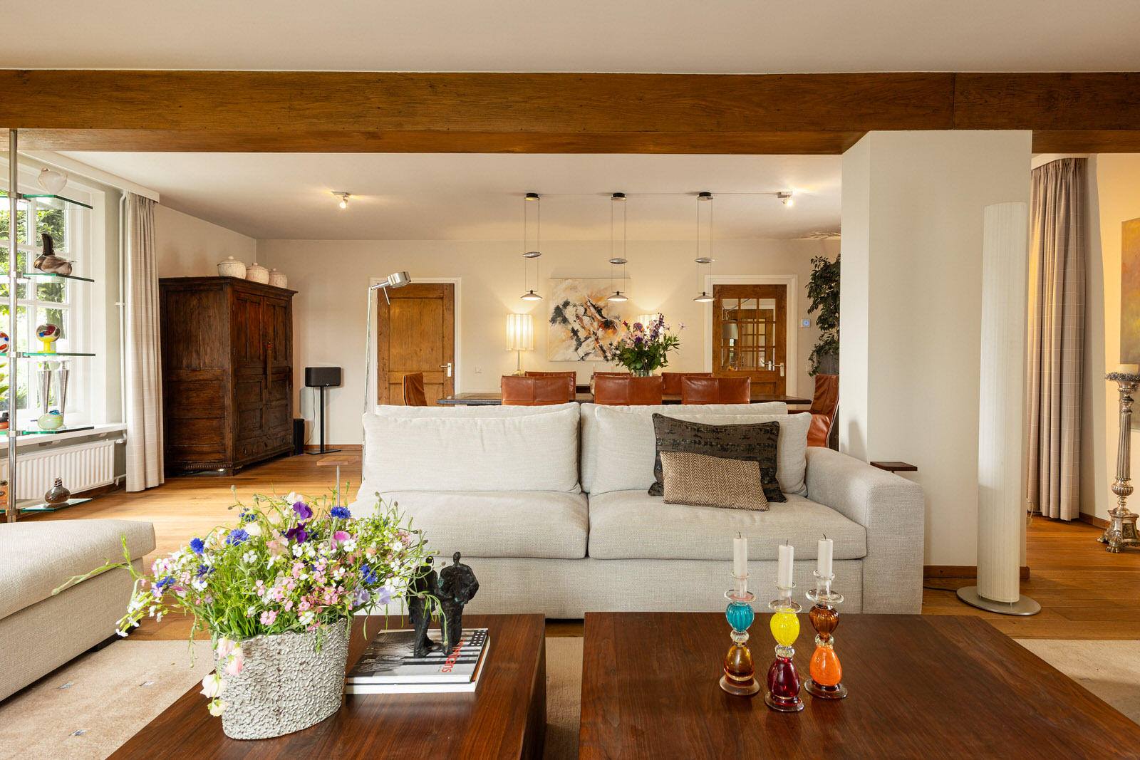 De woonkamer is royaal en verdeeld in een zithoek, met openslaande deuren naar de tuin en aangrenzend een sfeervolle tuinkamer. De moderne woonkeuken met kookeiland is een droom voor culinaire liefhebbers en biedt ruimte aan een grote eettafel. Deze ruimte staat direct in verbinding met het buitenterras en de tuin.