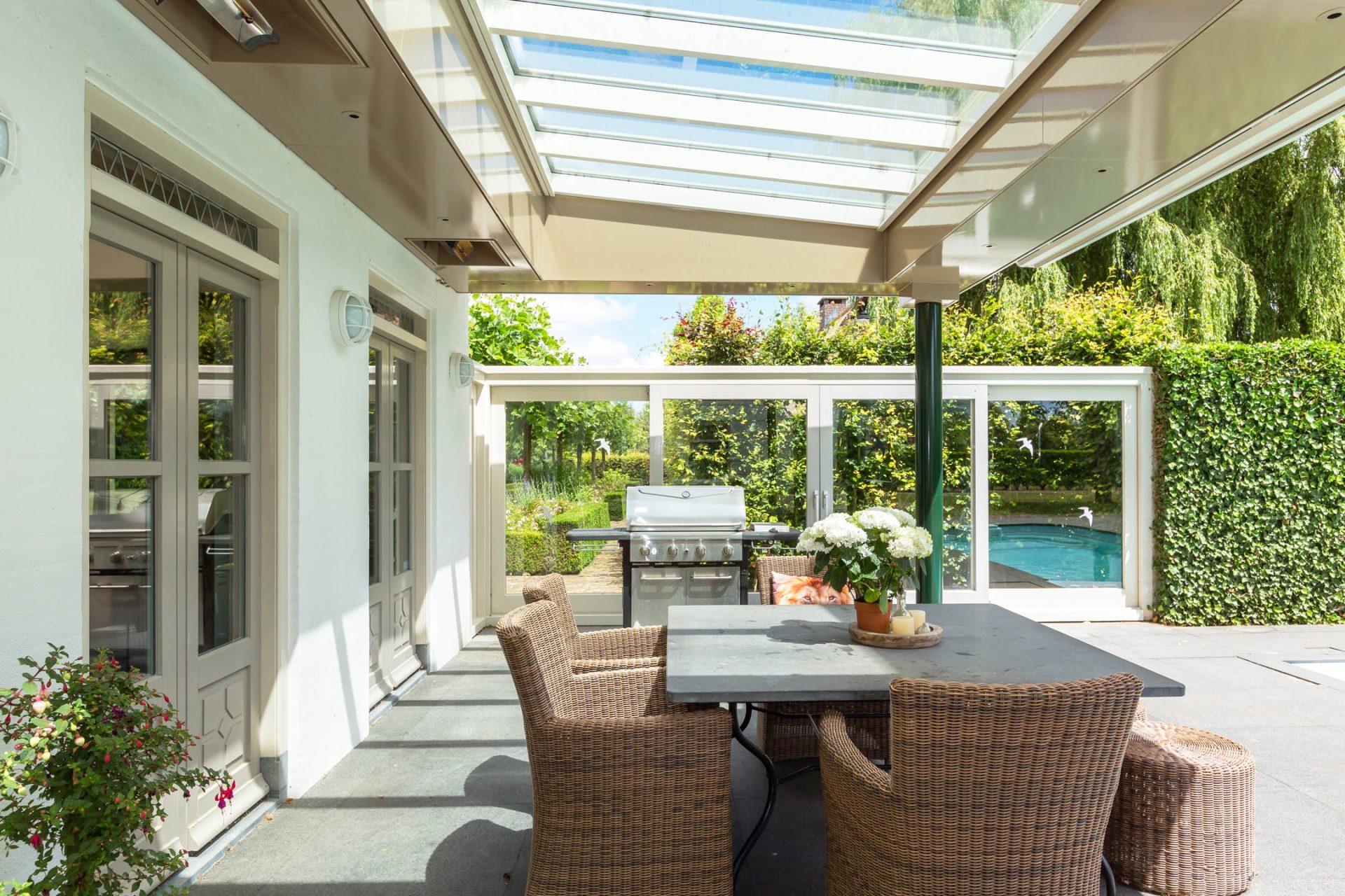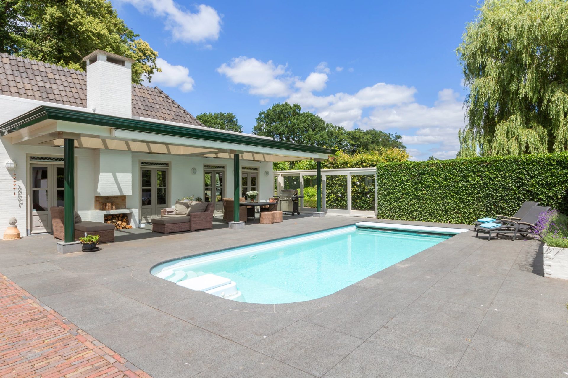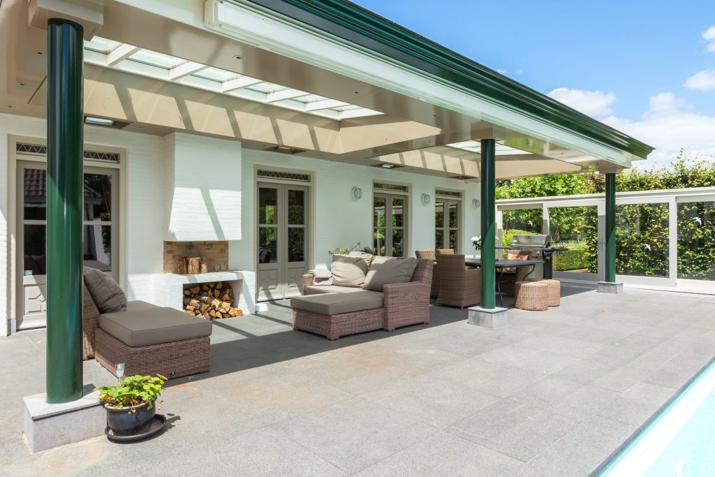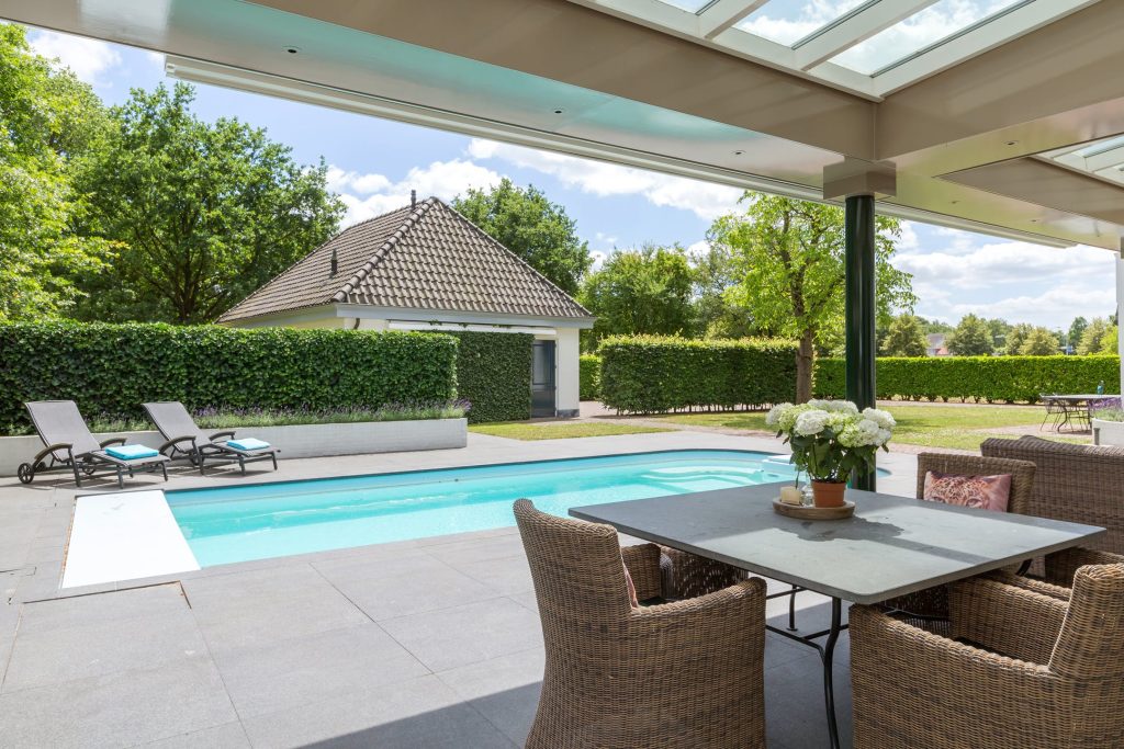 Het grote terras grenzend aan de villa is overdekt en voorzien van een gashaard en elektrische terrasverwarmers. Het grote buitenterras heeft een natuurstenen vloer en grenst aan het verwarmde buitenzwembad met jetstream en bubbelbank.