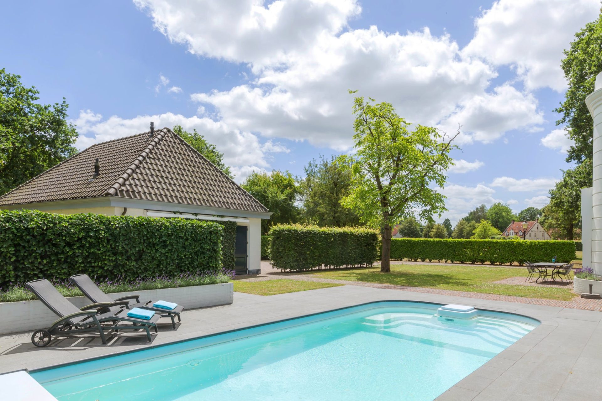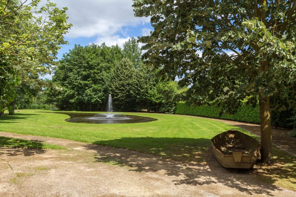 Tenslotte is er nog de jachtkamer; een sfeervolle (zit)kamer met een natuurstenen vloer, schouw met open haard, dubbele deuren naar het terras en een prachtige halfronde erker met uitzicht op het park. Airconditioning maakt deze kamer tijdens de warmste zomerdagen tot ‘the place to be’.