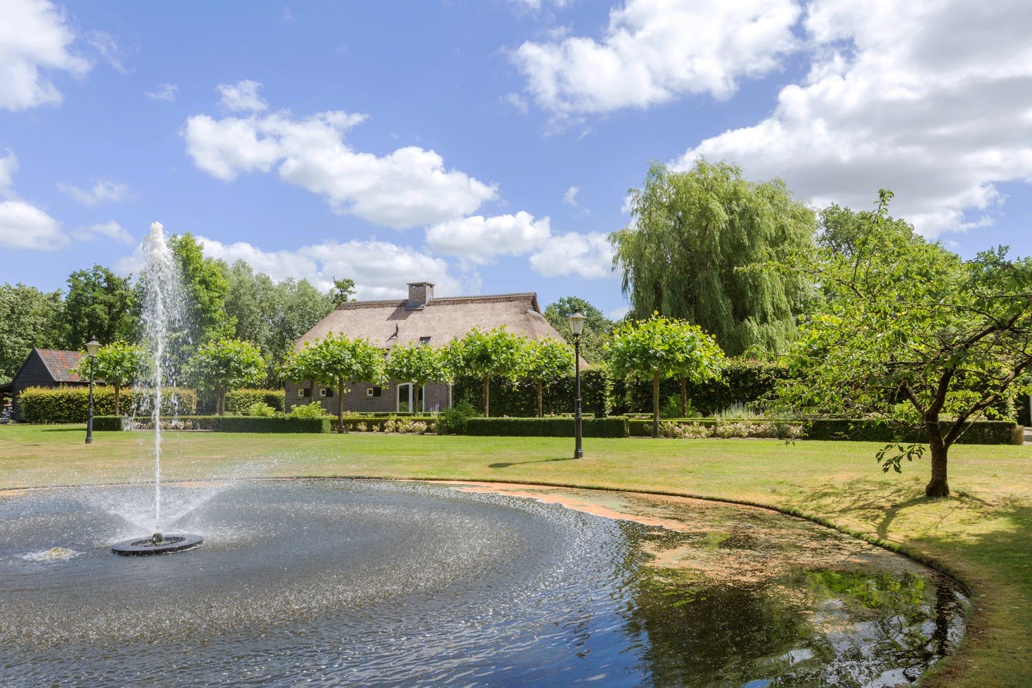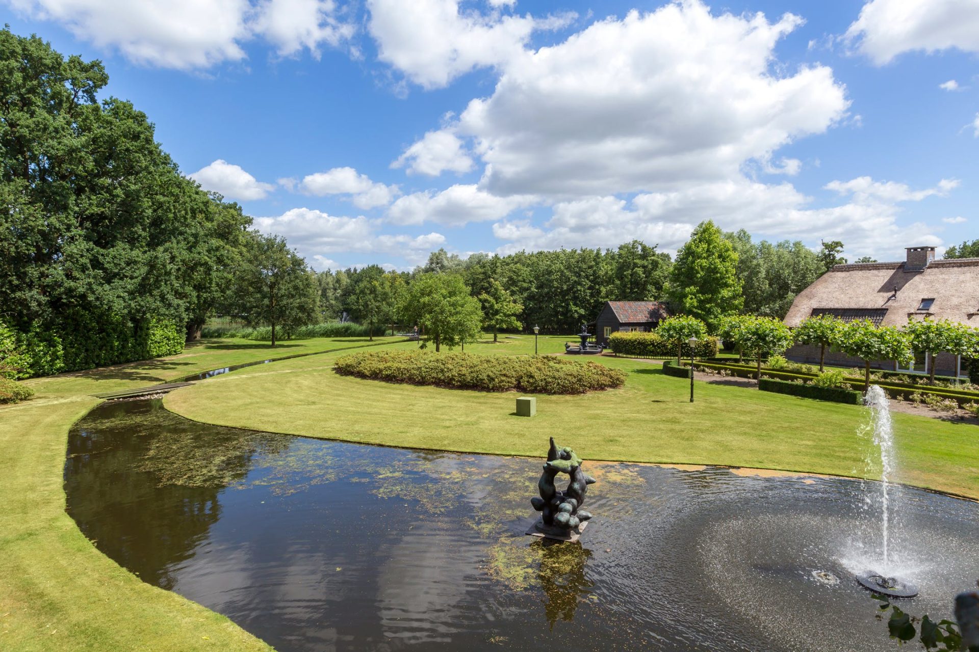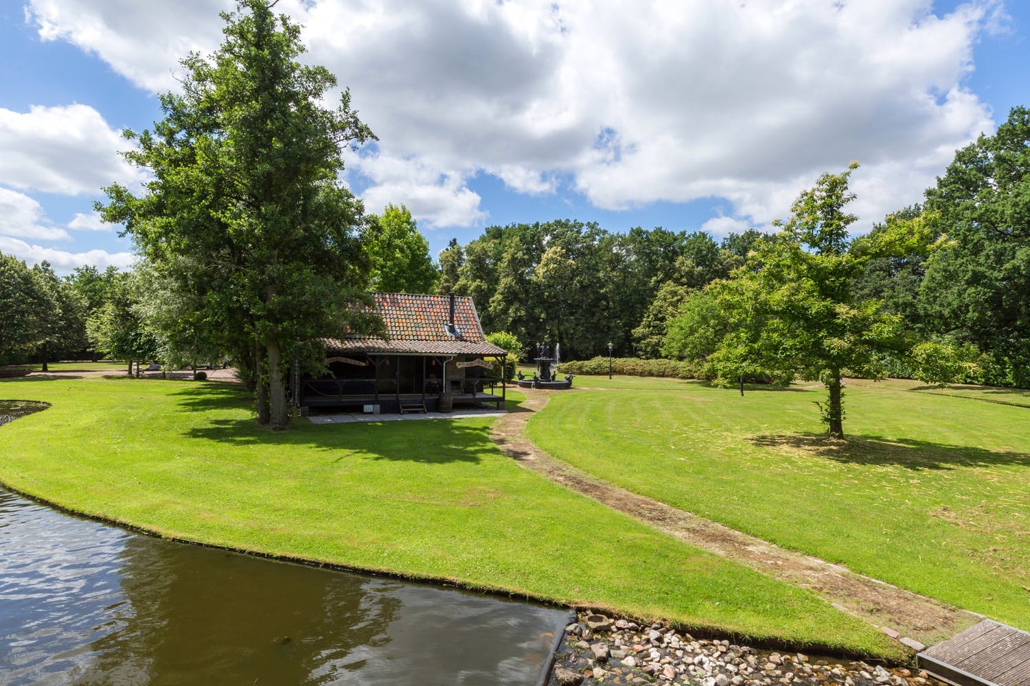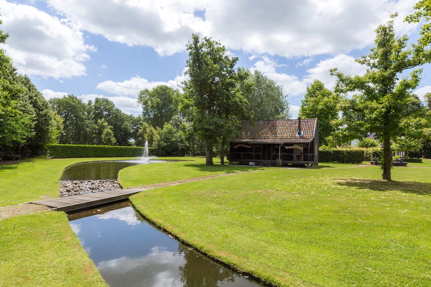 Dit houten bijgebouw ligt midden in het park en kijkt uit over de grote vijver en is ingericht als stijlvol bruincafé. Op de overdekte veranda geniet je in de zomer van je ijskoude biertje en in de winter van een knapperend haardvuur en in beide gevallen ook van het magnifieke uitzicht op het privédomein; binnen bevinden zich nog een klassieke bar, openhaard, beamer met filmscherm, Amerikaanse koelkast en een toilet met portaal. Kortom een topplek voor feestjes of juist een moment van helemaal niets doen.