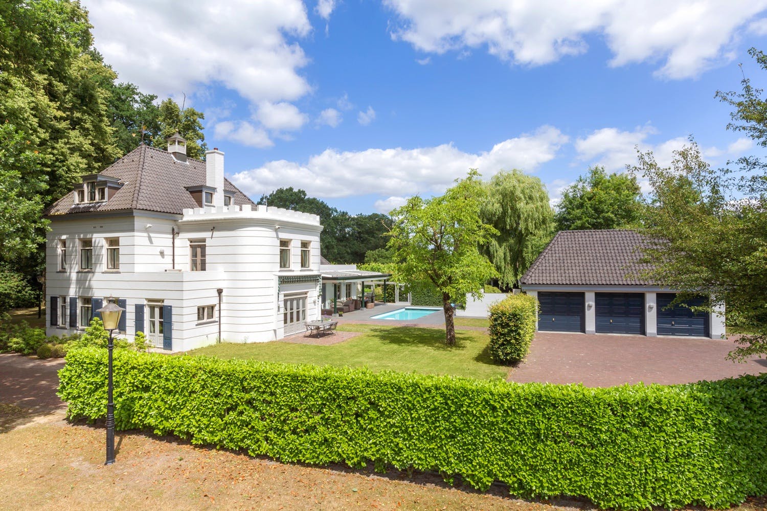 In het koetshuis kunt u uw auto’s en andere voertuigen een veilig onderdak bieden. Drie elektrisch bedienbare garagedeuren zorgen voor een goede toegankelijkheid. Tevens bevind zich hier de technische ruimte ten behoeve van het buitenzwembad; op de bovenverdieping staat nog een royale zolderruimte ter beschikking voor opslag.