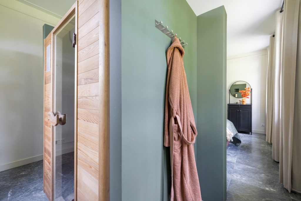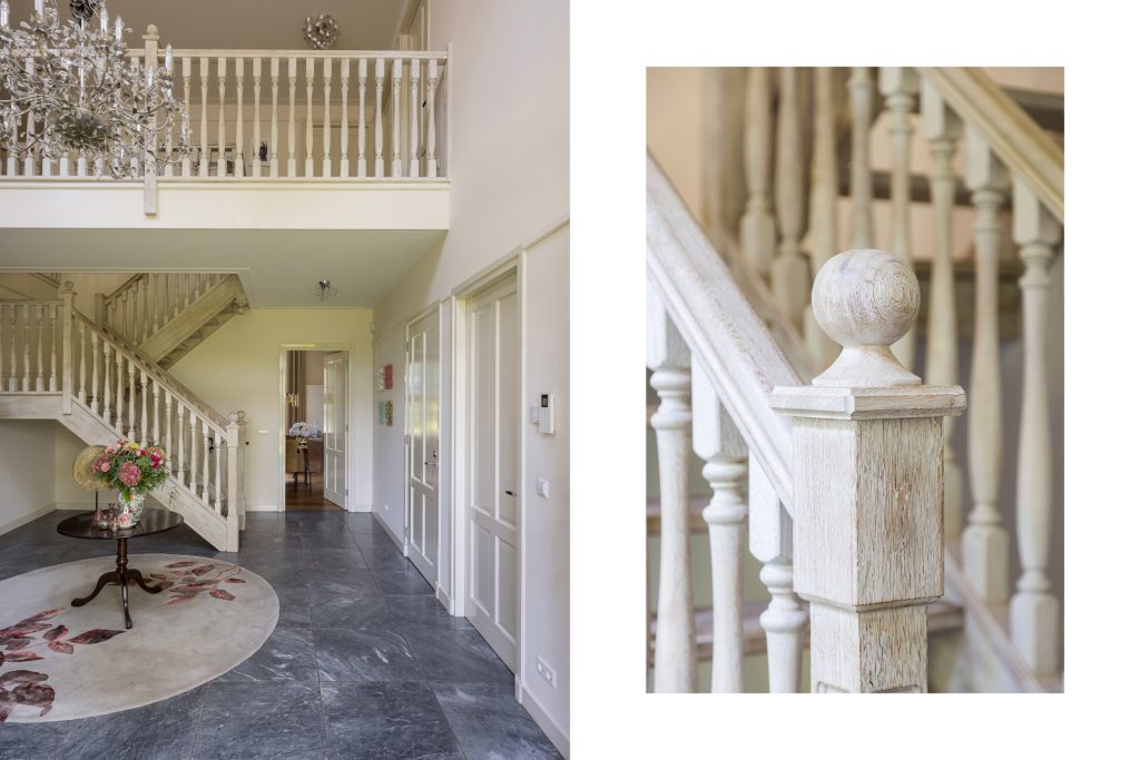 Ruime hal met indrukwekkende trap geeft toegang tot de living, woonkeuken, kantoorruimte en de hoofdslaapkamer. De slaapkamer heeft een eigen badkamer met ligbad en inloopdouche. Daarnaast is er een walk-in-closet en een infraroodsauna.