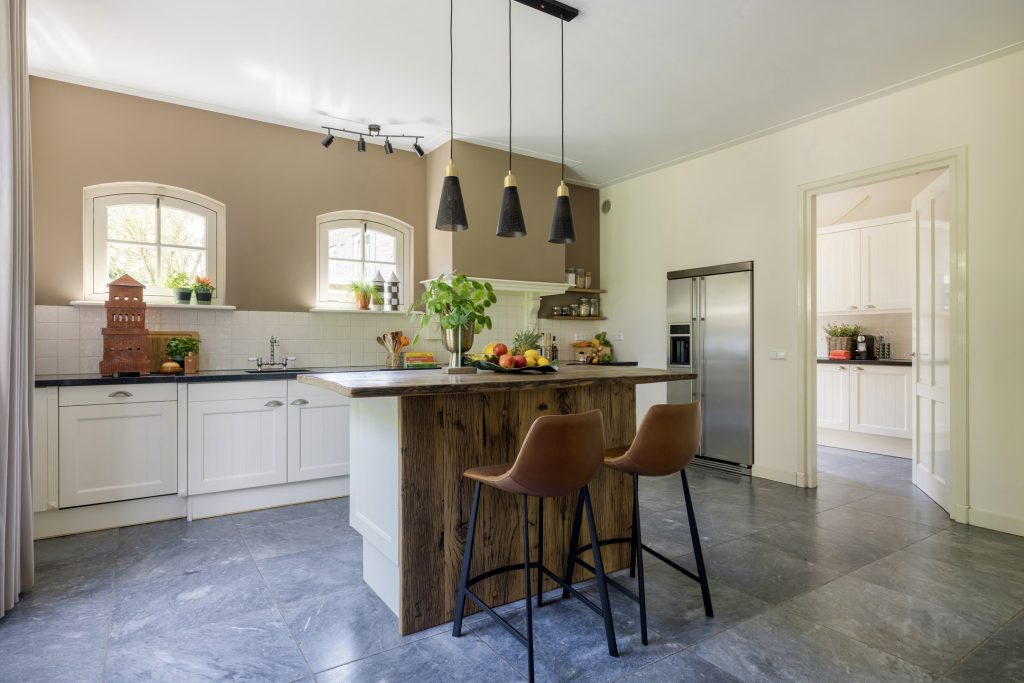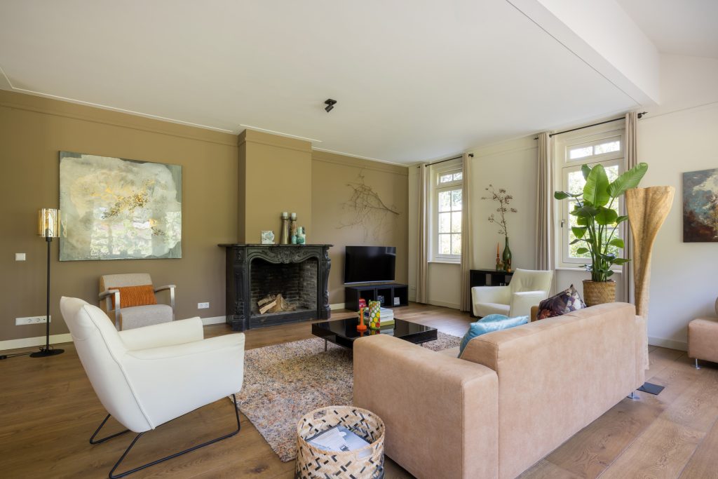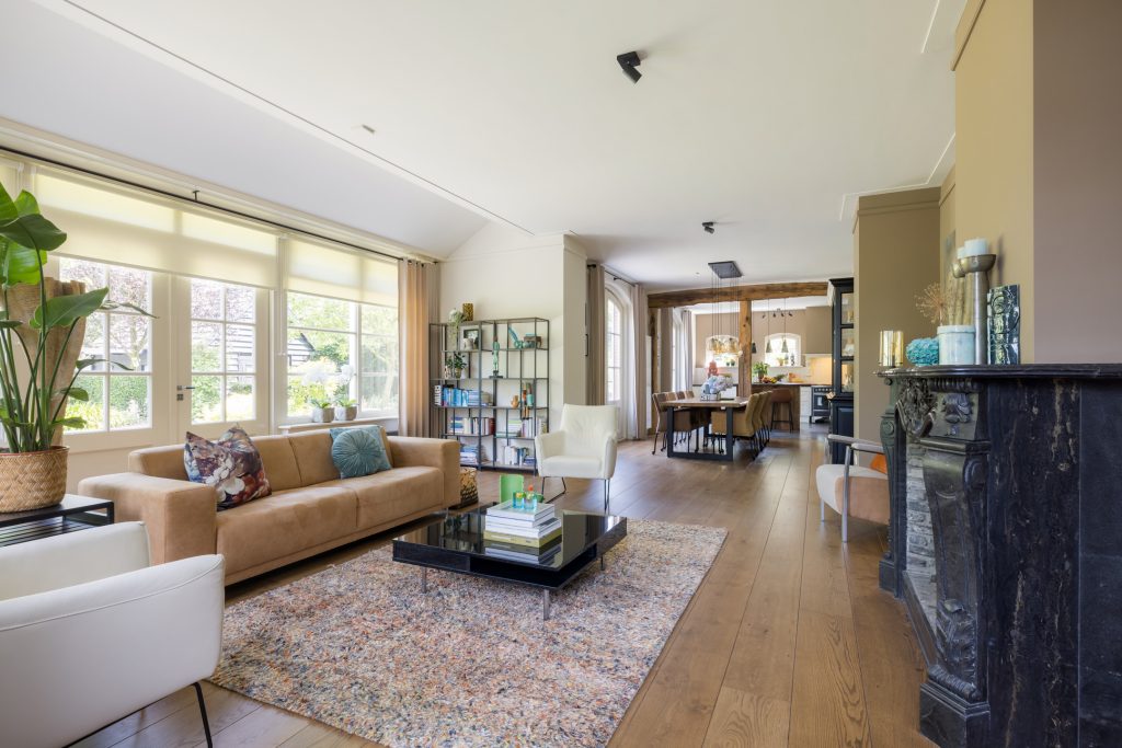 De living heeft een prettige lichtinval en via de openslaande deuren loopt u naar buiten richting de diverse terrassen. De open keuken is voorzien van diverse moderne inbouw-apparatuur, waaronder een Amerikaanse koelkast en een Boretti-gasfornuis.