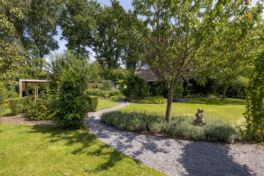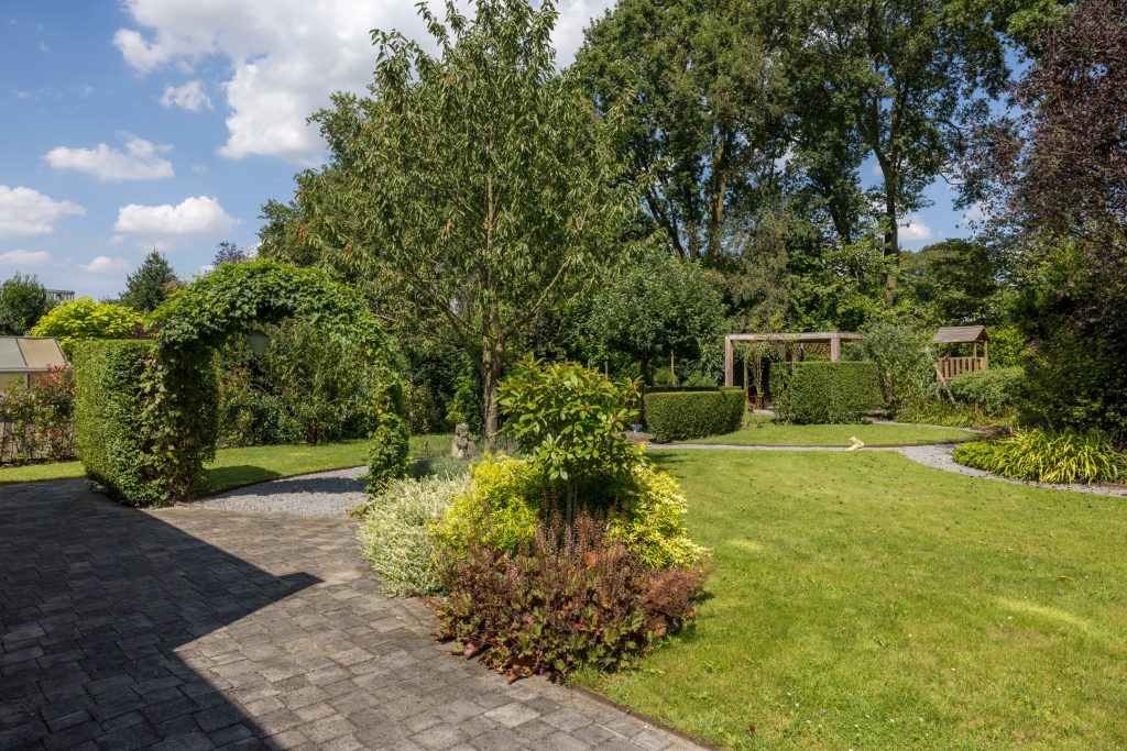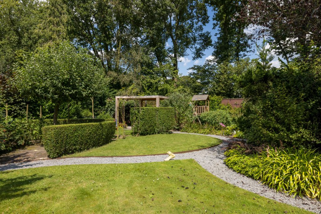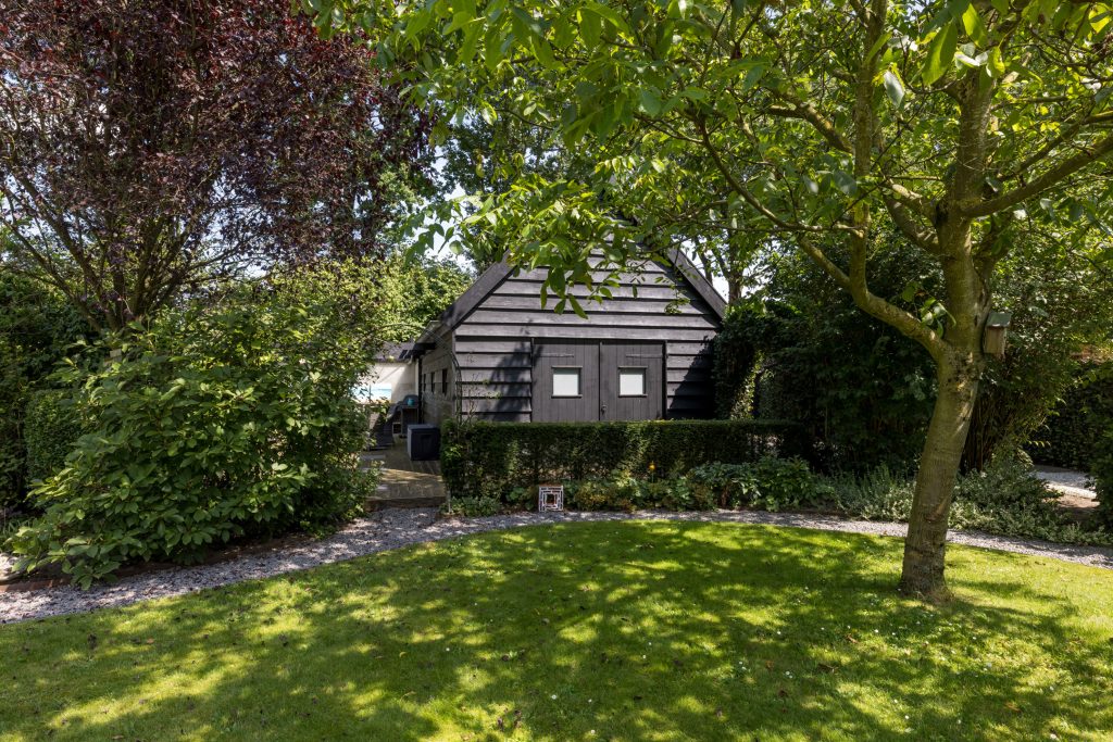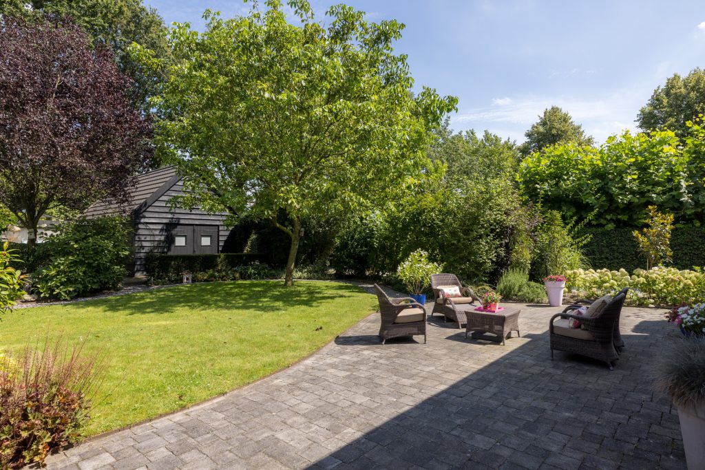 Ruime tuin met meerdere terrassen waarvan één met een pergola en buitenkeuken en een ander overdekt terras waar de jacuzzi onderstaat. Een ruime garage en een aparte fietsenberging maakt het geheel compleet. De oprit biedt plaats voor meerdere auto’s en heeft tevens een oplaadpunt voor elektrische auto.