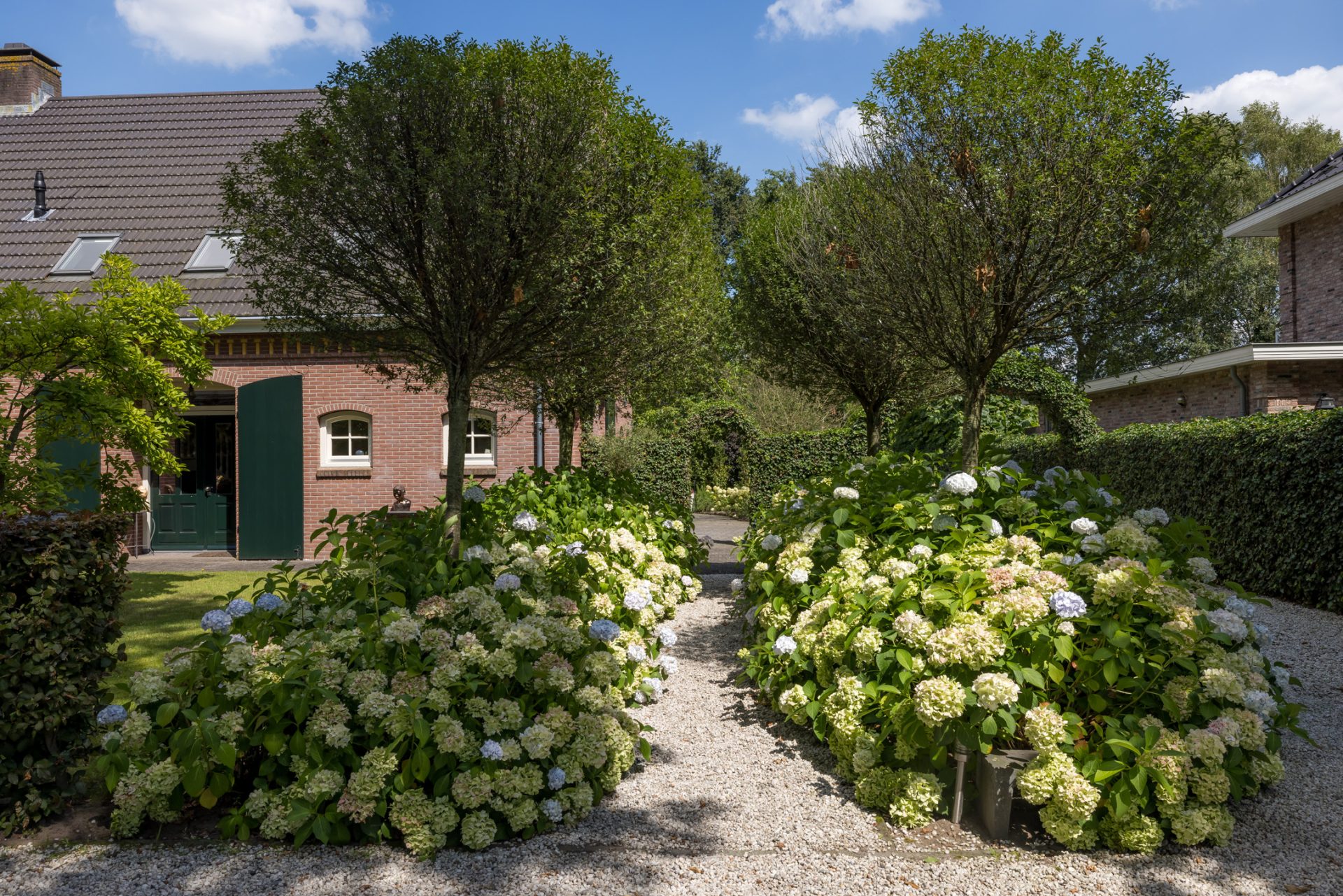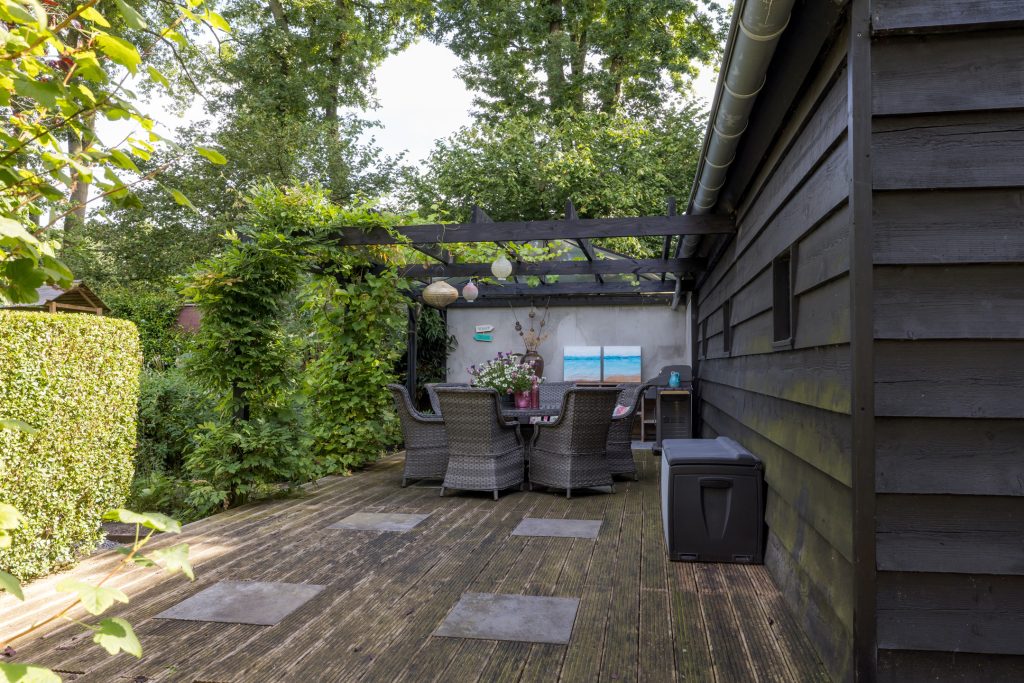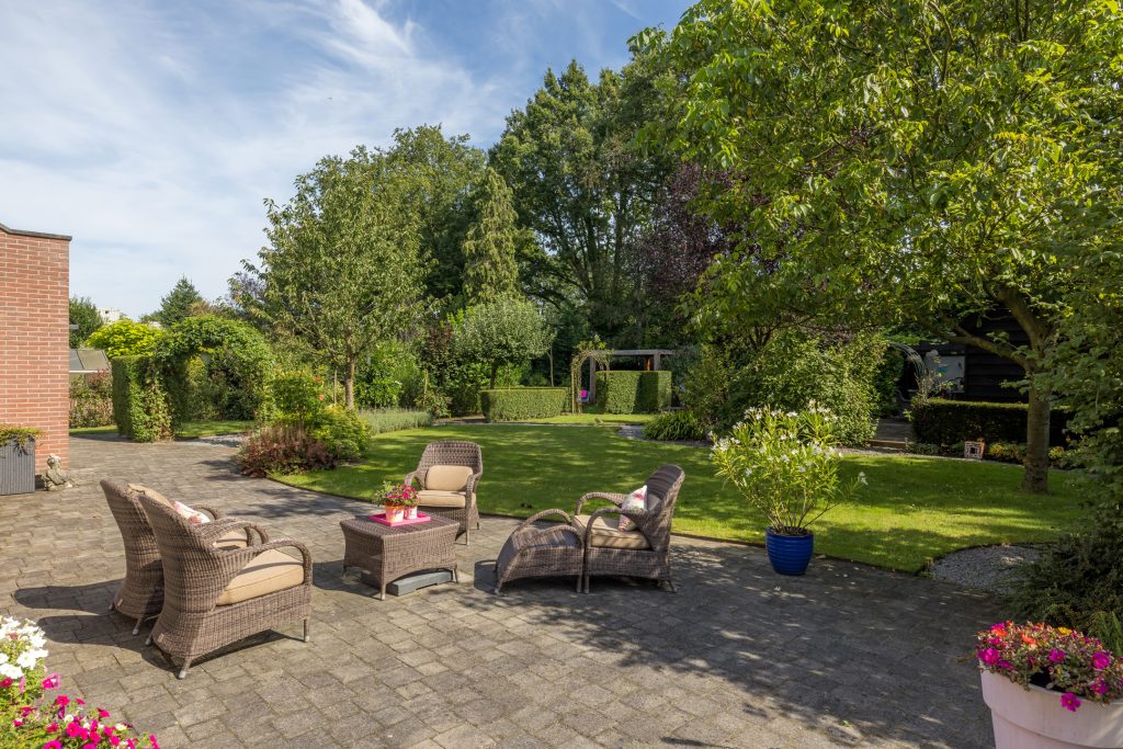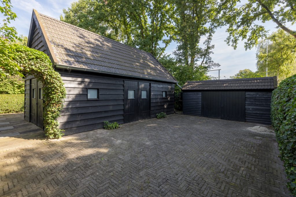 Ruime tuin met meerdere terrassen waarvan één met een pergola en buitenkeuken en een ander overdekt terras waar de jacuzzi onderstaat. Een ruime garage en een aparte fietsenberging maakt het geheel compleet. De oprit biedt plaats voor meerdere auto’s en heeft tevens een oplaadpunt voor elektrische auto.