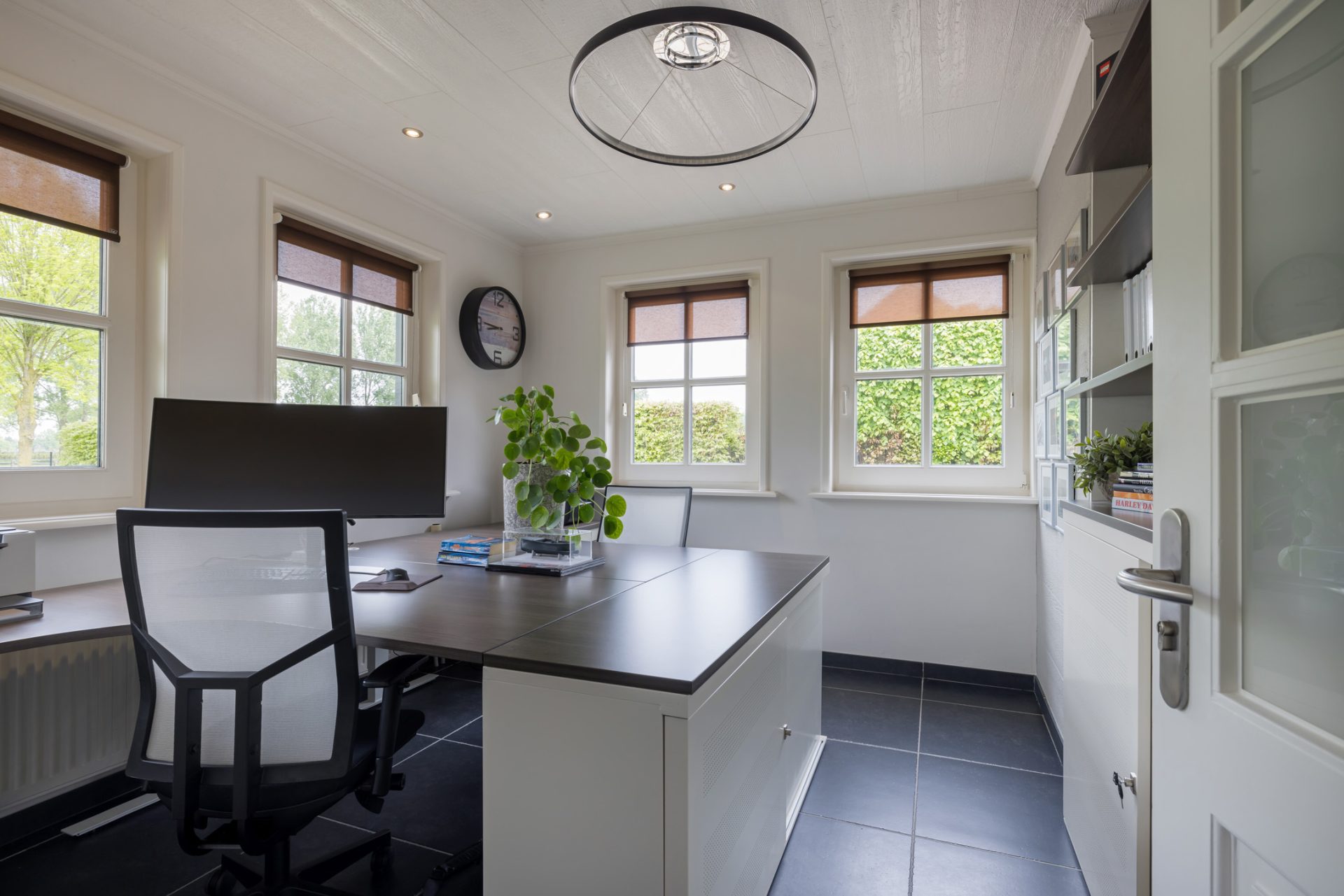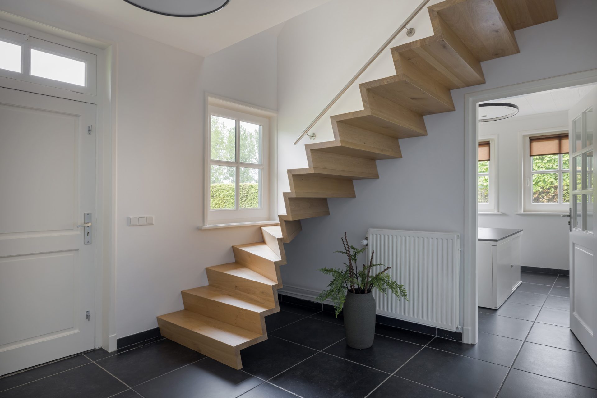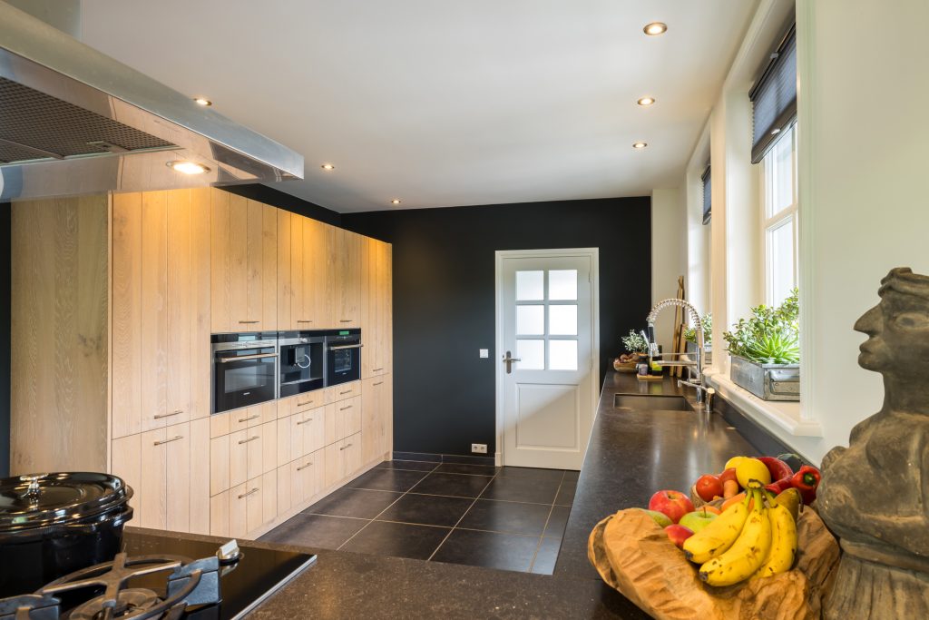 Om het landhuis van binnen te bewonderen, kun je kiezen voor de entree aan de voorzijde en de zijdeur naar een tweede hal. In de hal aan de voorzijde zie je een prachtige designtrap en de garderobe. Aan deze hal grenzen een lichte werkkamer en de keuken, met alle benodigde luxe en inbouwapparatuur van topkwaliteit.