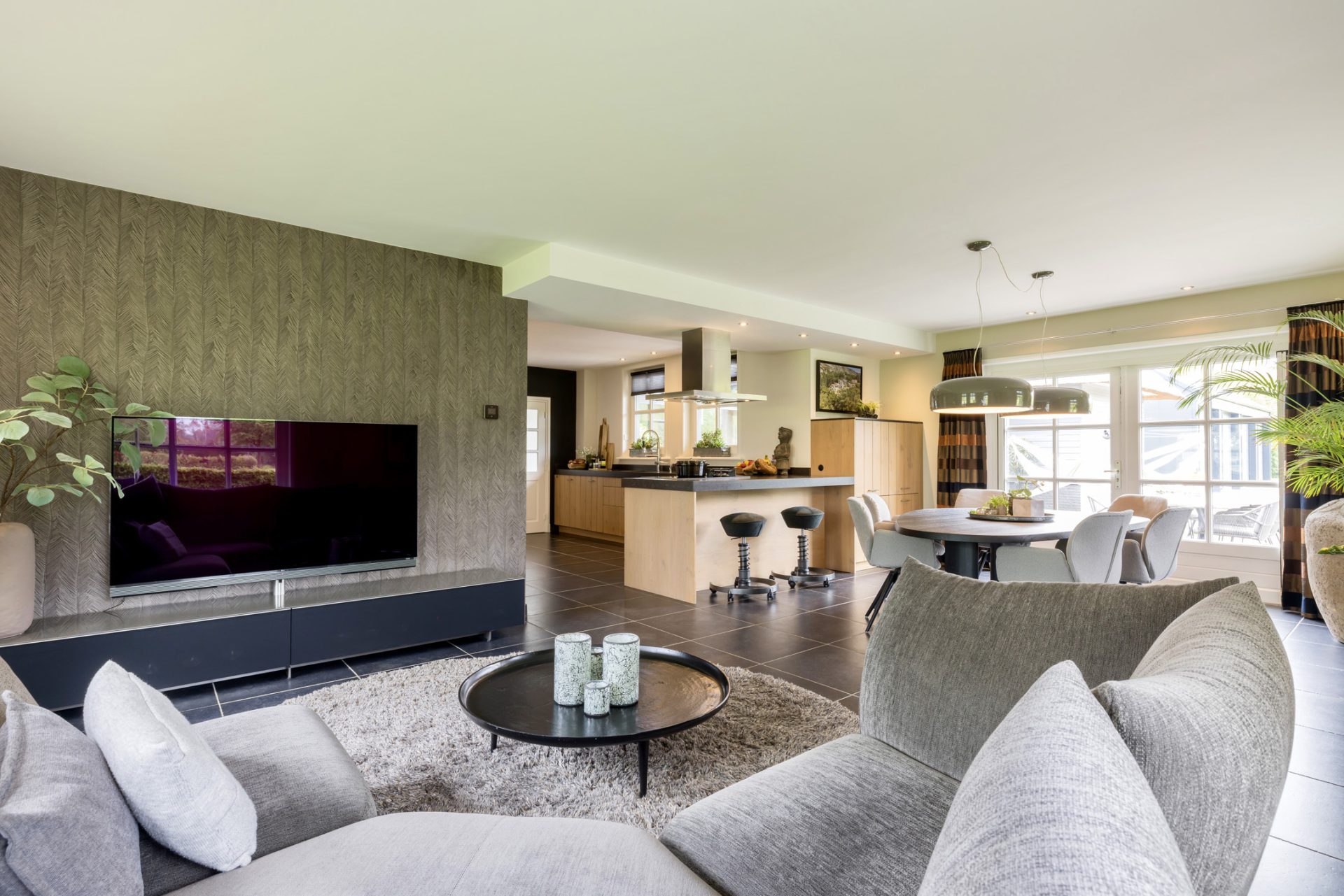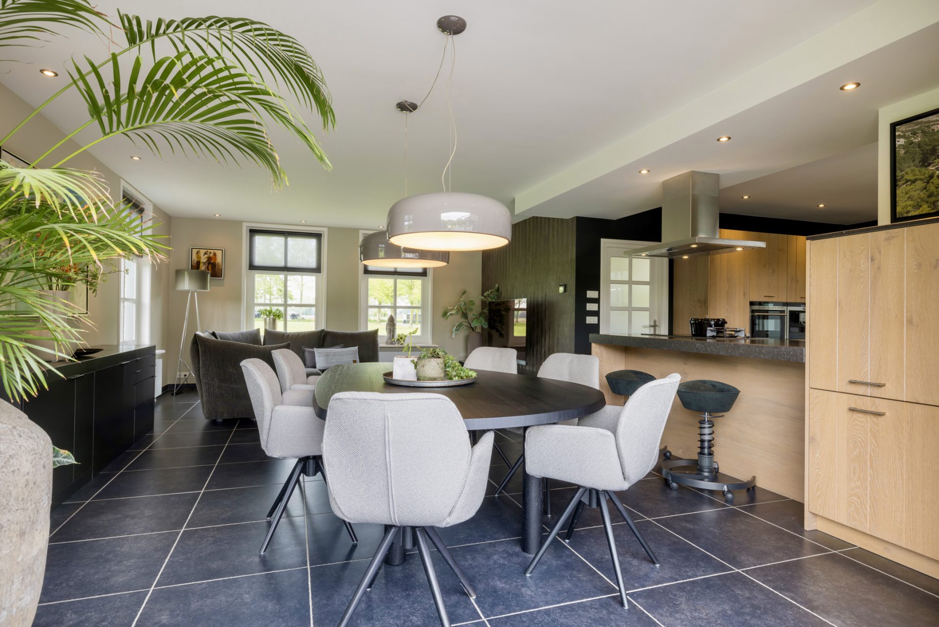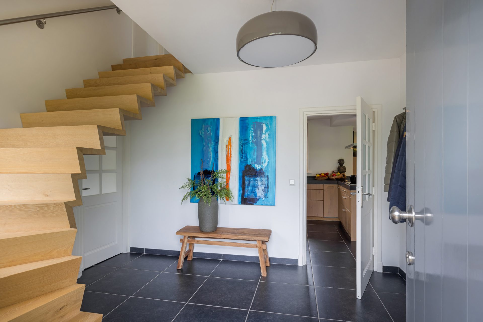 Om het landhuis van binnen te bewonderen, kun je kiezen voor de entree aan de voorzijde en de zijdeur naar een tweede hal. In de hal aan de voorzijde zie je een prachtige designtrap en de garderobe. Aan deze hal grenzen een lichte werkkamer en de keuken, met alle benodigde luxe en inbouwapparatuur van topkwaliteit.