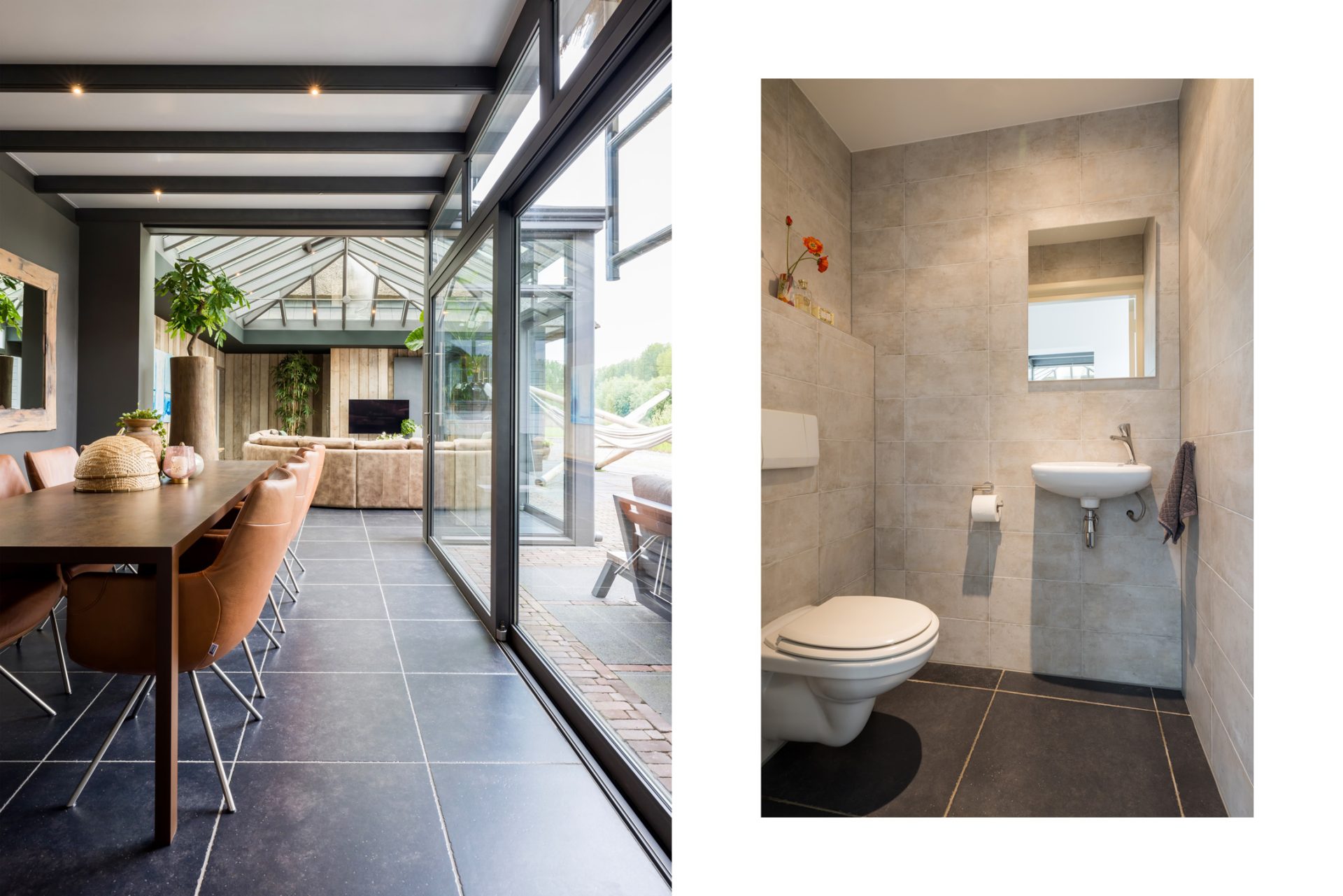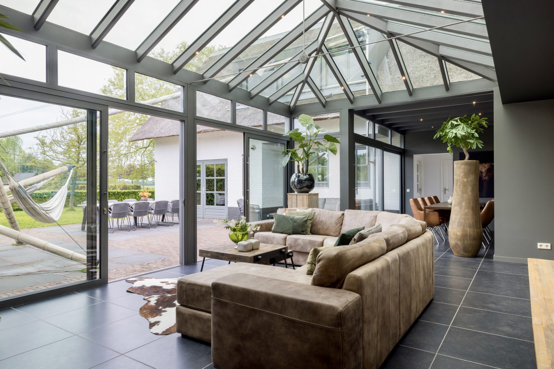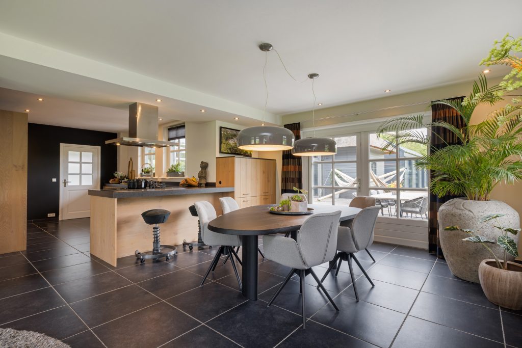 De keuken staat in open verbinding met de sfeervolle woonkamer, waar je aan drie zijden van het uitzicht naar de tuin en de wei geniet. Openslaande deuren geven toegang tot de achtertuin.
