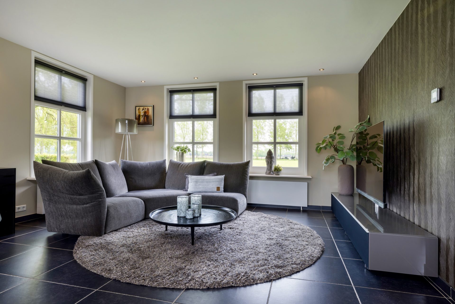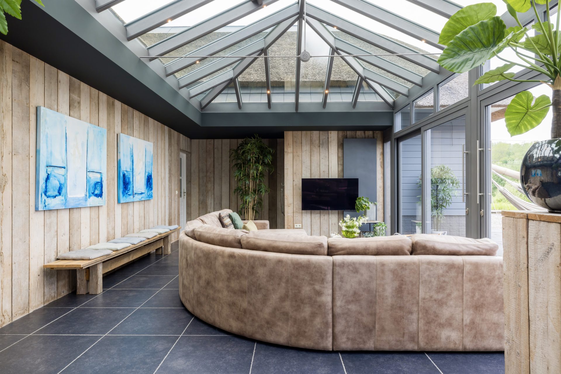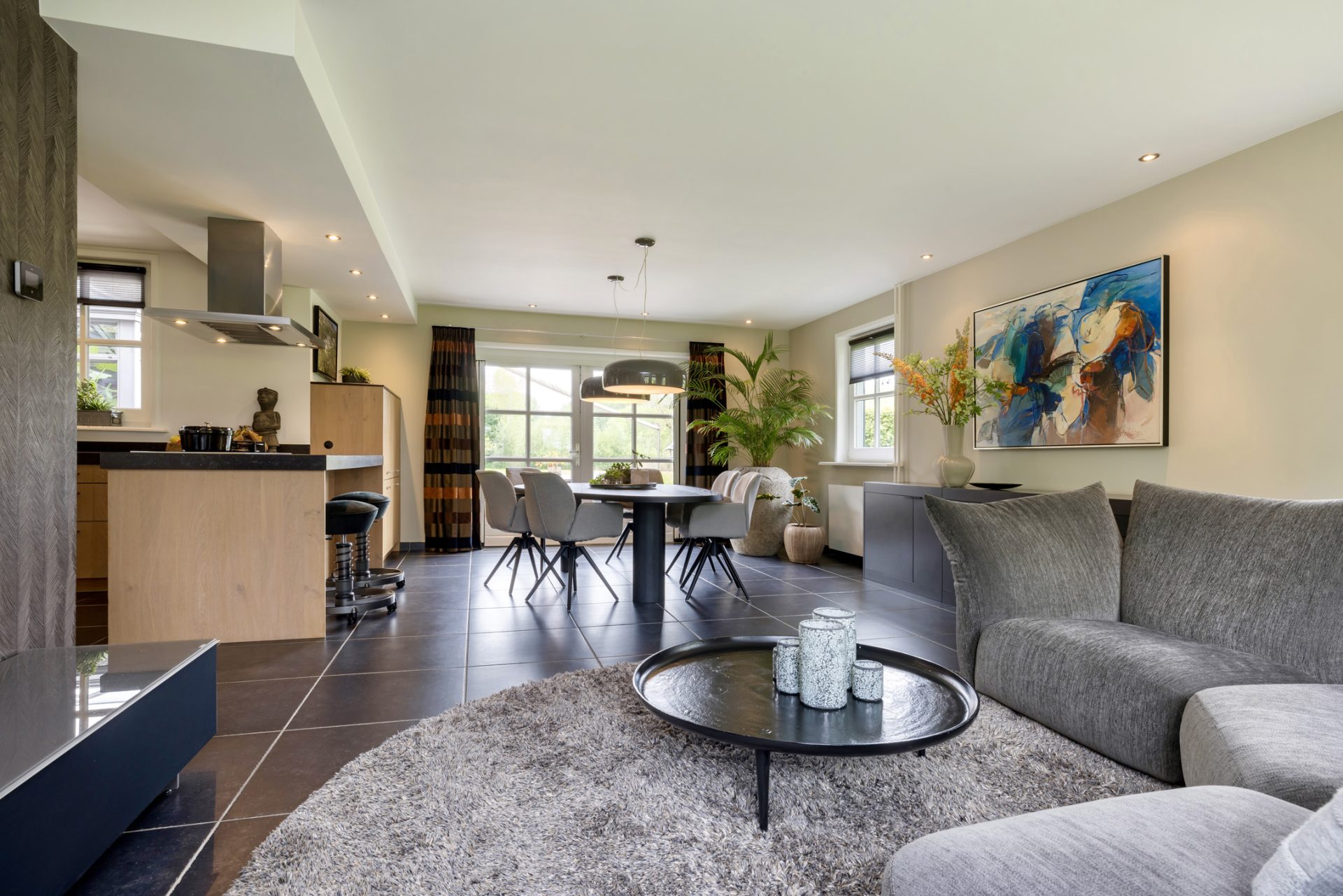 De keuken staat in open verbinding met de sfeervolle woonkamer, waar je aan drie zijden van het uitzicht naar de tuin en de wei geniet. Openslaande deuren geven toegang tot de achtertuin.