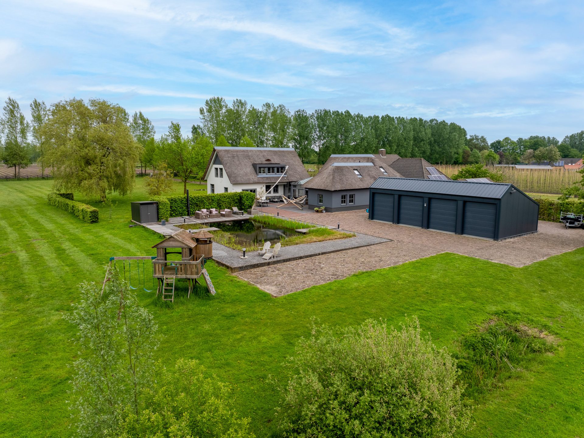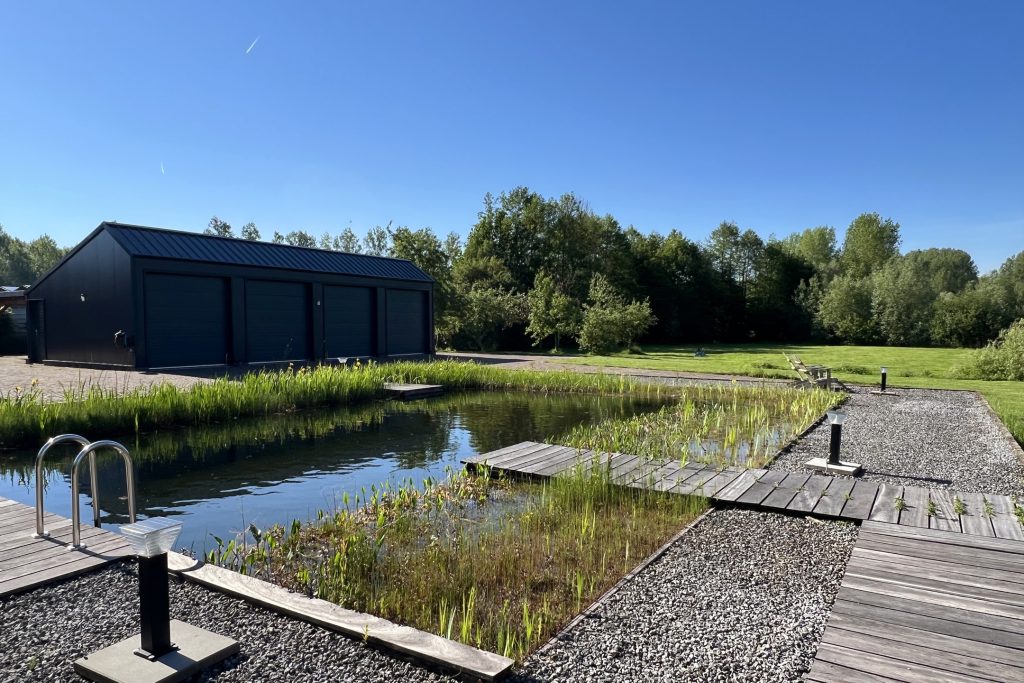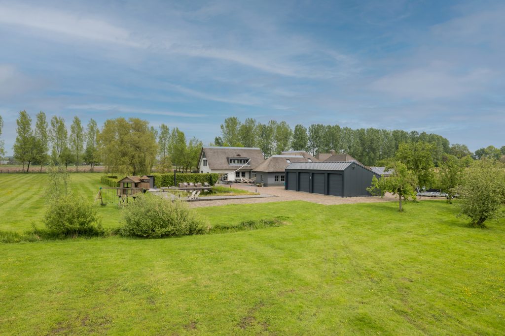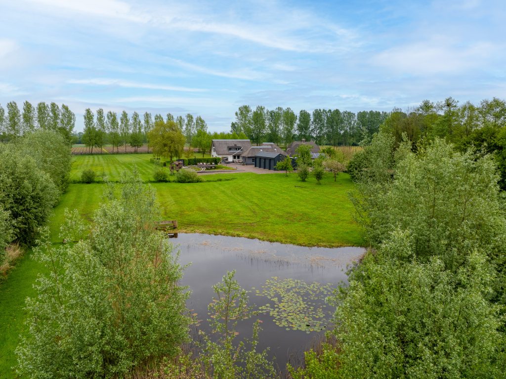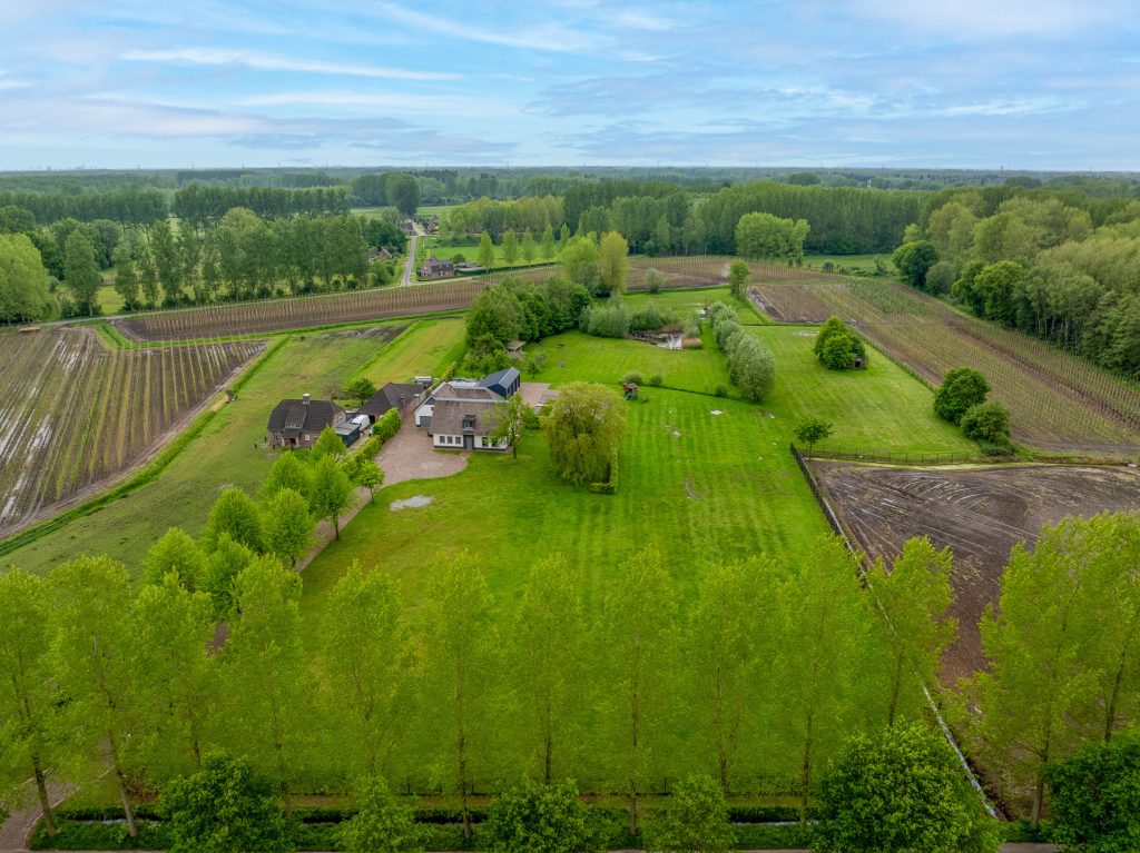 Dankzij de omheining zijn de percelen zeer geschikt voor het houden van dieren. In de achterste wei bevindt zich een grote natuurvijver met waterlelies, waar het bankje heel aanlokkelijk is om even te gaan zitten. Enigszins verstopt achter bomen en struiken staat een oude paardenstal en vlak achter het landhuis staat een stijlvol bijgebouw van circa 100 m² met vier grote sectionaalpoorten, klaar voor een nieuwe invulling. Komen hier prachtige auto’s te staan of wordt deze prachtige ruimte verbouwd tot paardenstallen?