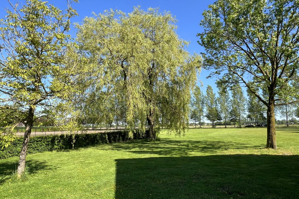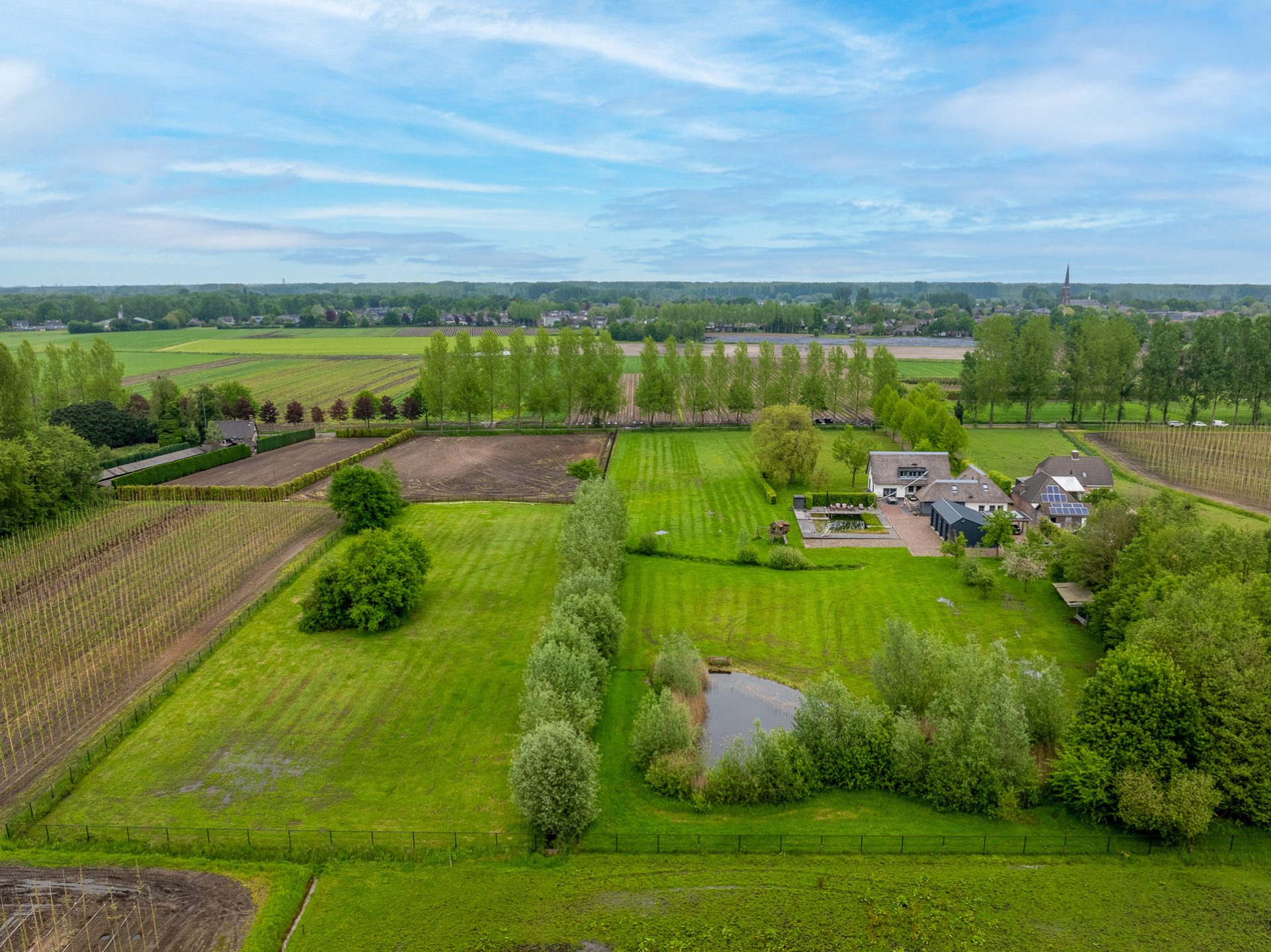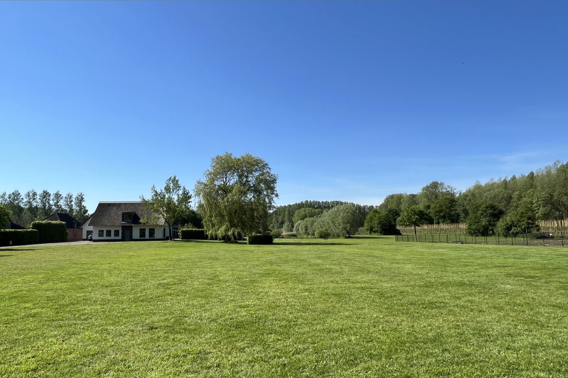 Dankzij de omheining zijn de percelen zeer geschikt voor het houden van dieren. In de achterste wei bevindt zich een grote natuurvijver met waterlelies, waar het bankje heel aanlokkelijk is om even te gaan zitten. Enigszins verstopt achter bomen en struiken staat een oude paardenstal en vlak achter het landhuis staat een stijlvol bijgebouw van circa 100 m² met vier grote sectionaalpoorten, klaar voor een nieuwe invulling. Komen hier prachtige auto’s te staan of wordt deze prachtige ruimte verbouwd tot paardenstallen?