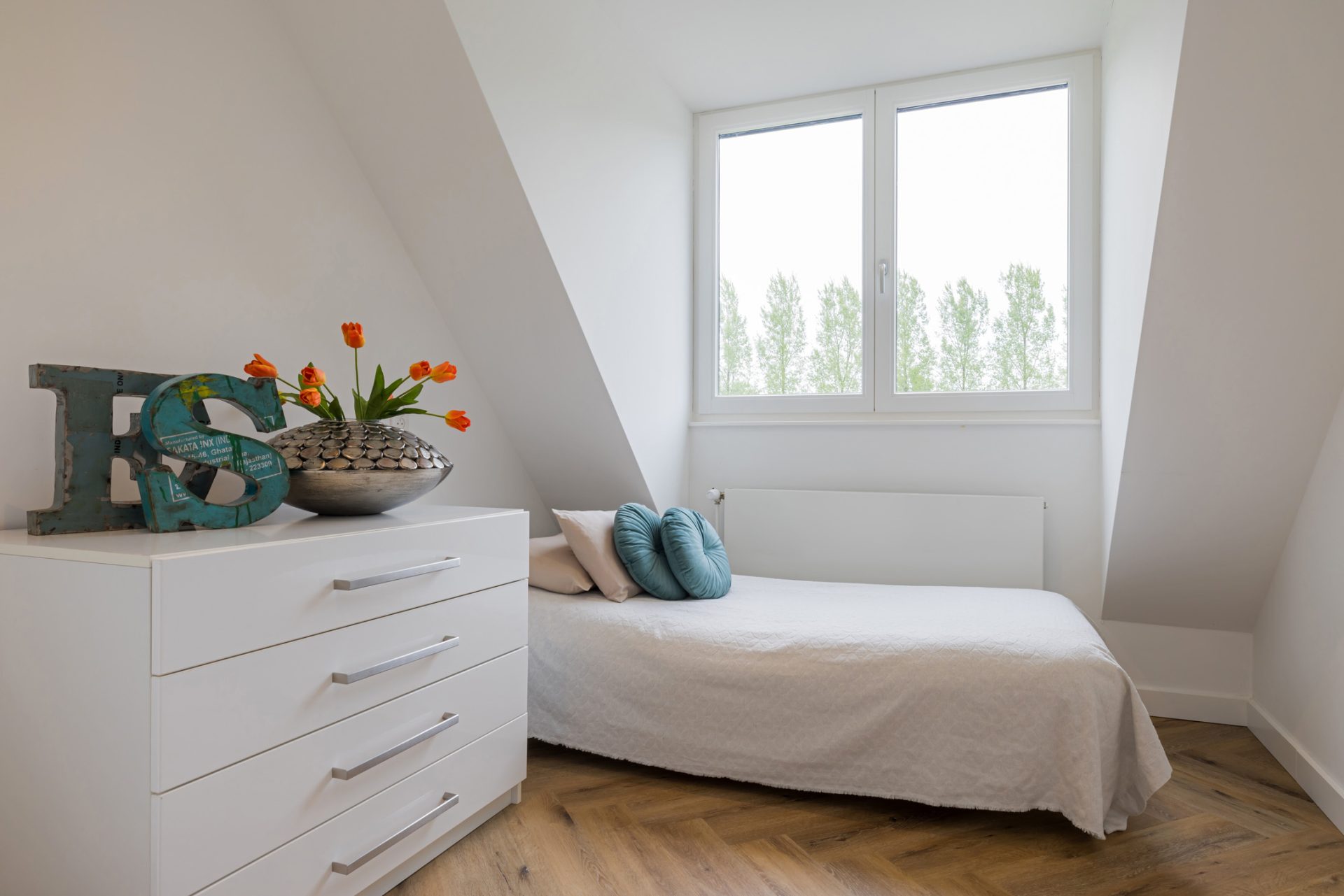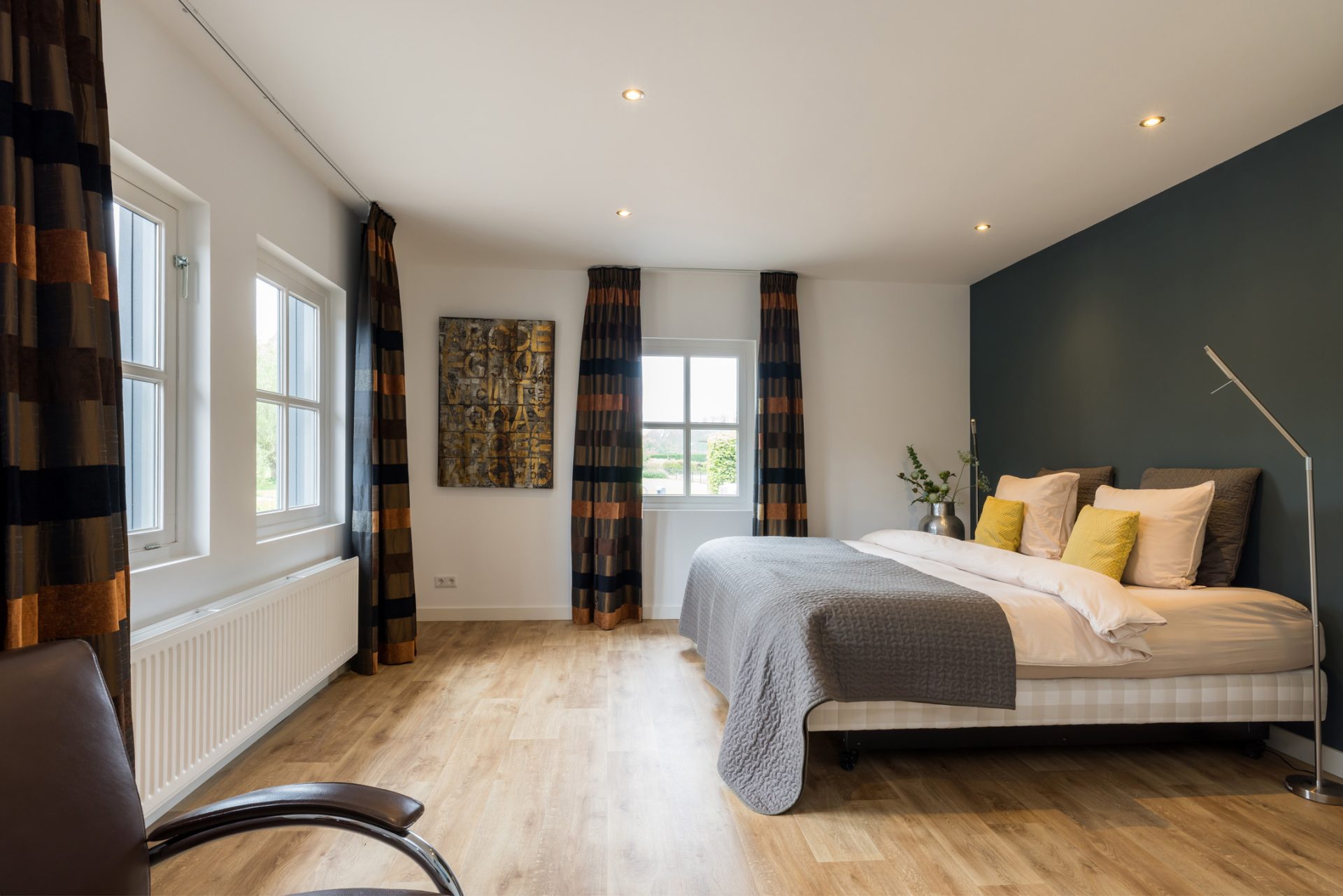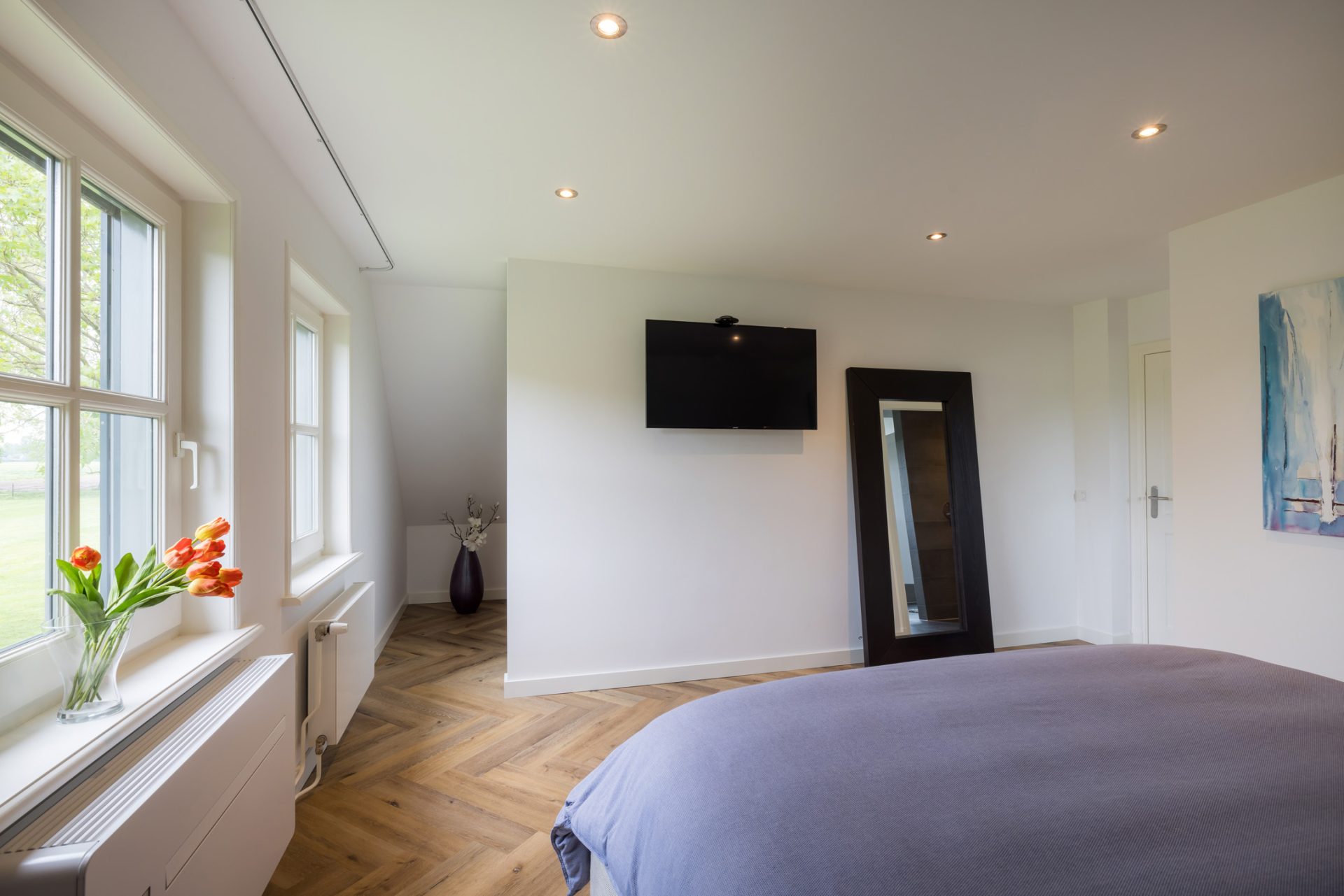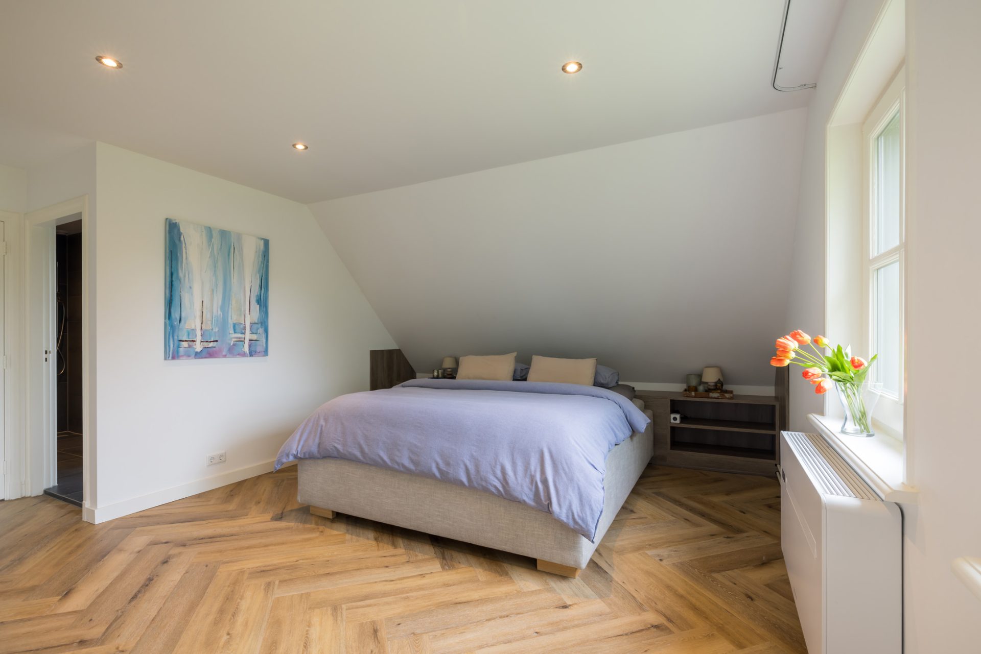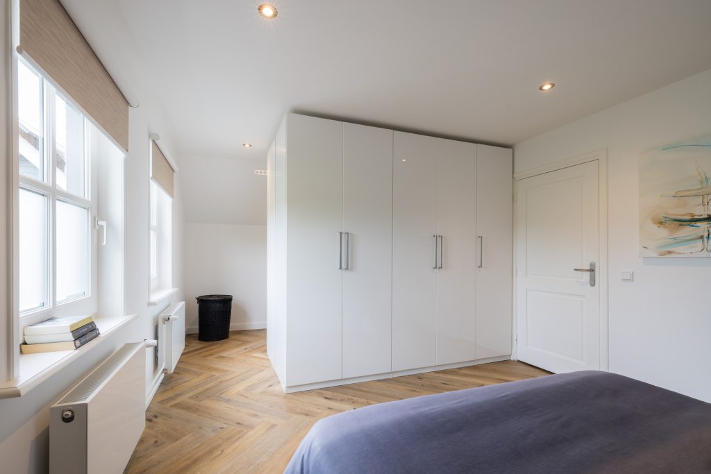 De slaapkamer aan de linkerzijde biedt de mogelijkheid om te splitsen in twee kamers en de slaapkamer met inloopkast aan de rechterzijde is ingericht als master bedroom.