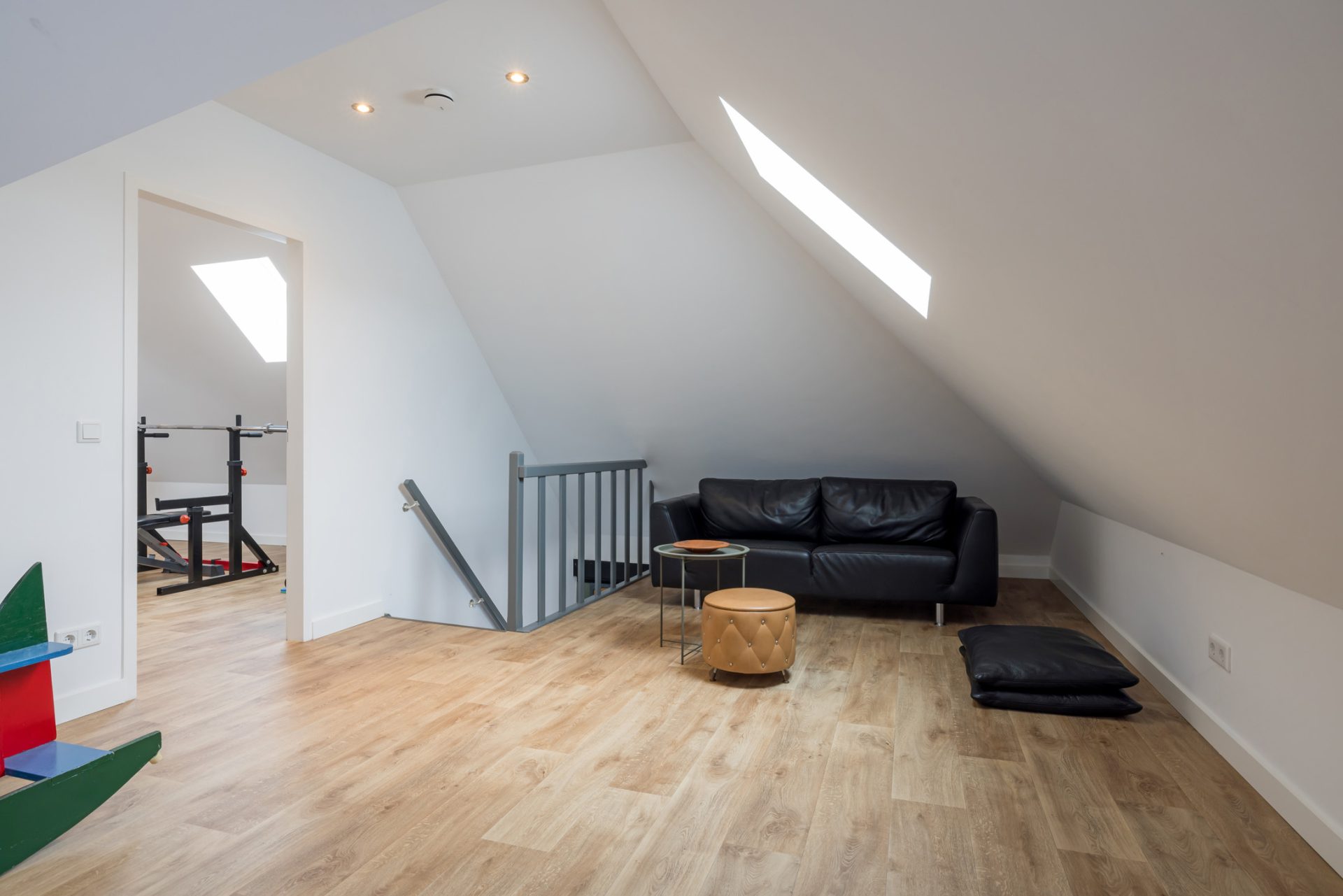 Via de trap in de mancave bereik je een tweede bovenverdieping met drie grote ruimtes die als slaapkamer, relaxruimte, fitnessruimte of speelkamer gebruikt kunnen worden.