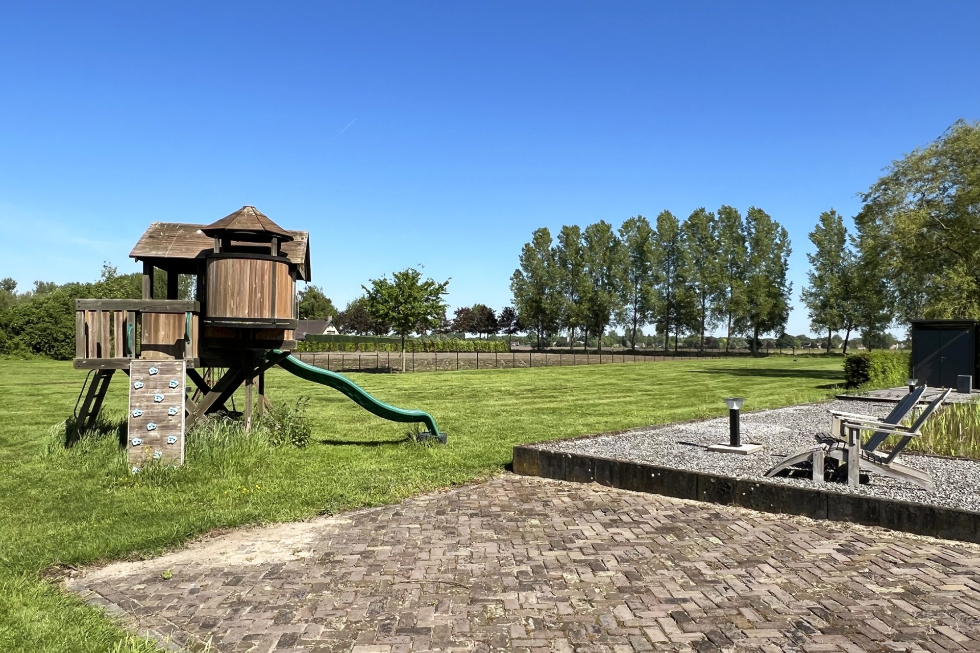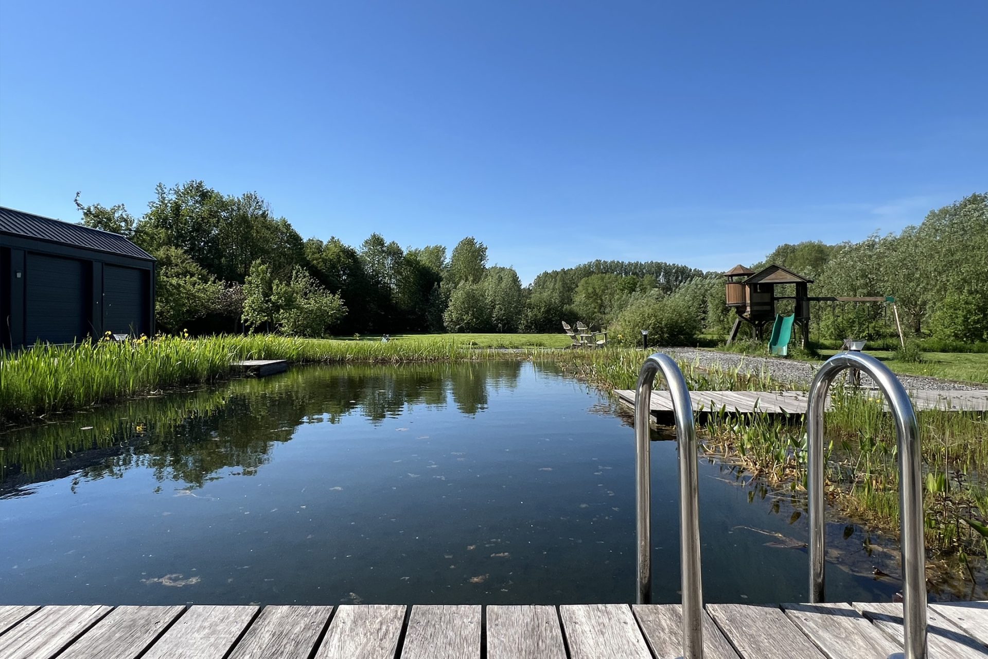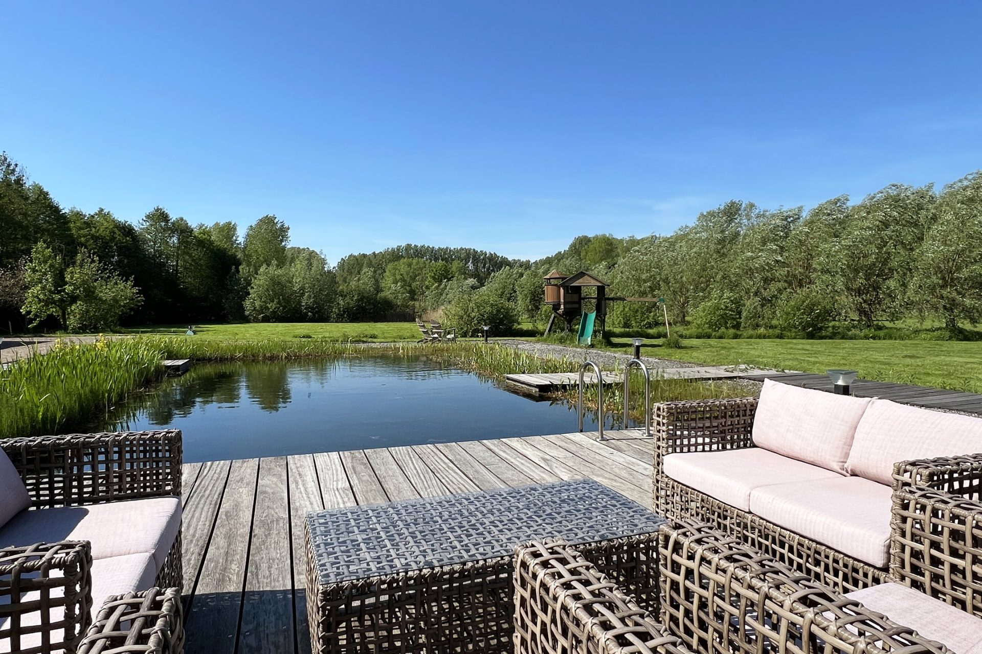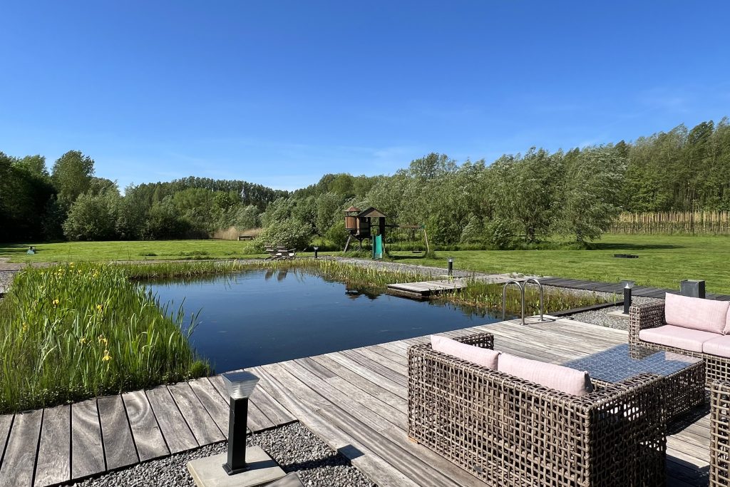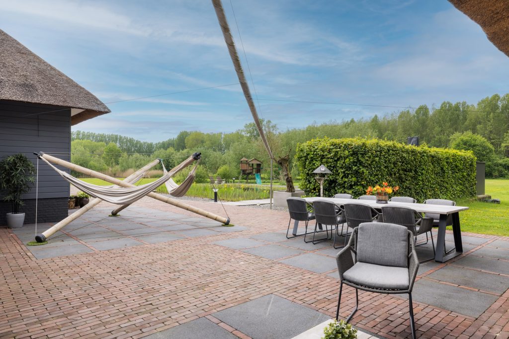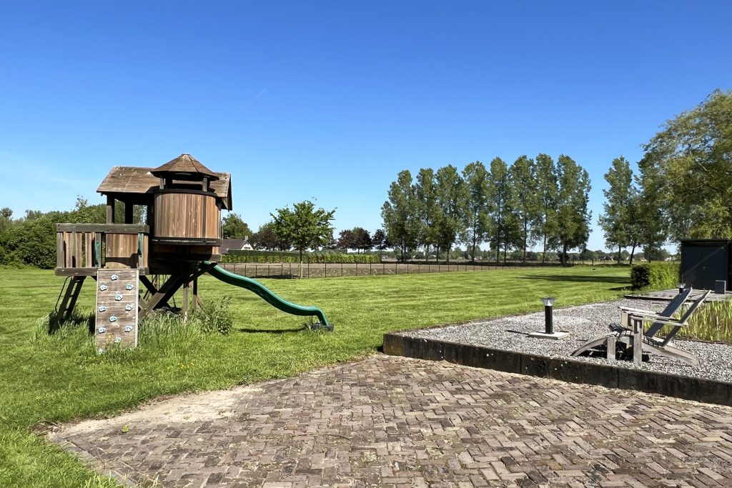 Het exclusieve landhuis wordt omringd door een prachtige tuin met meerdere terrassen, waarvan een naast de grote vijver. Gevarieerde beplanting, groene hagen en sierbestrating vormen een fraai geheel. Iets verder in de tuin staat een groot speeltoestel voor de (klein)kinderen.