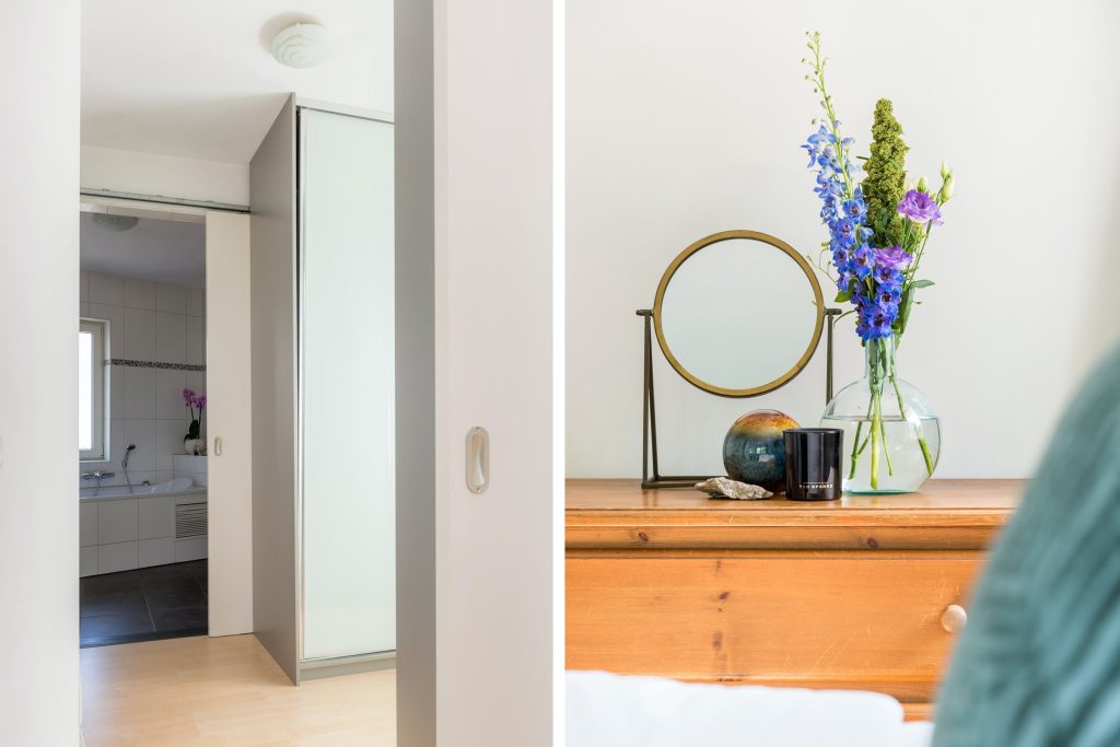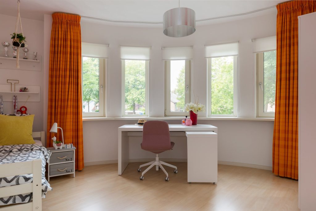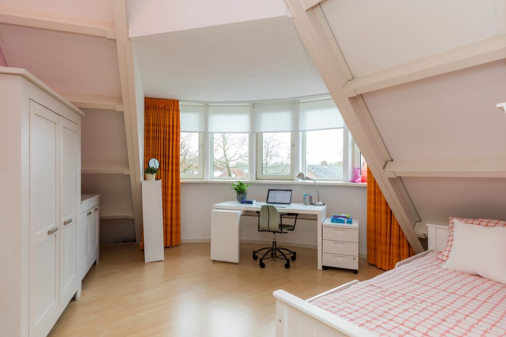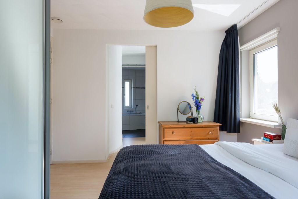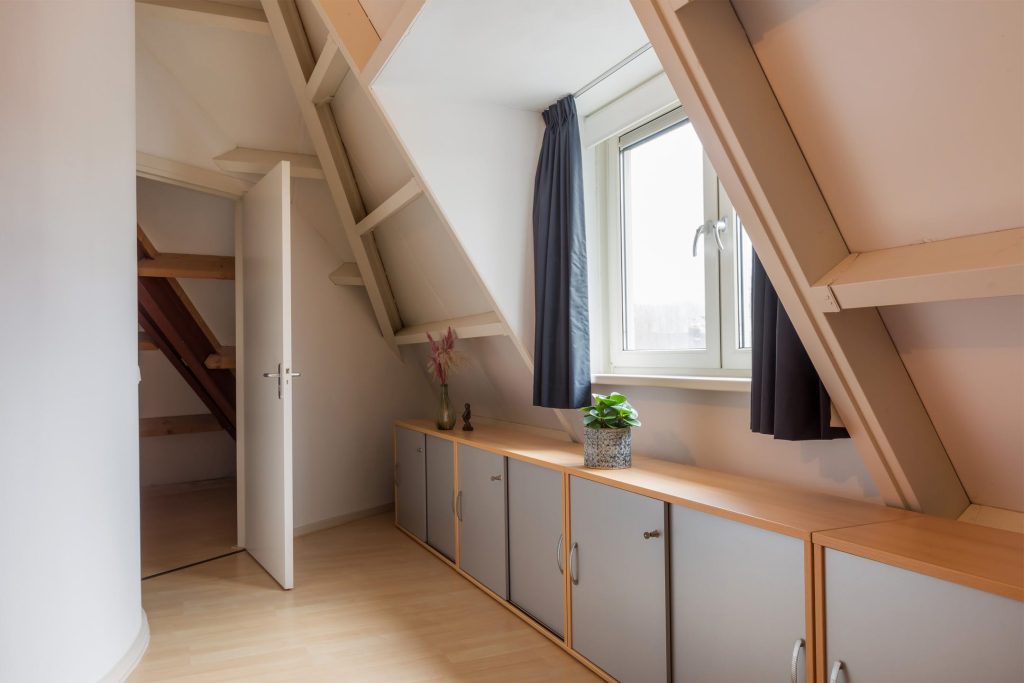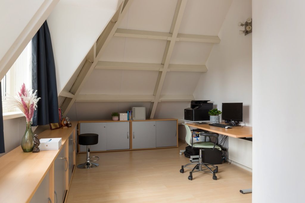 De tweede verdieping biedt ruimte aan een ruime voorzolder met dakraam en voldoende bergingsmogelijkheden en twee slaapkamers met dakkapel. Één slaapkamer is momenteel in gebruik als werkkamer/thuiswerkplek.