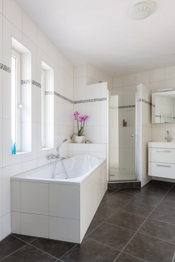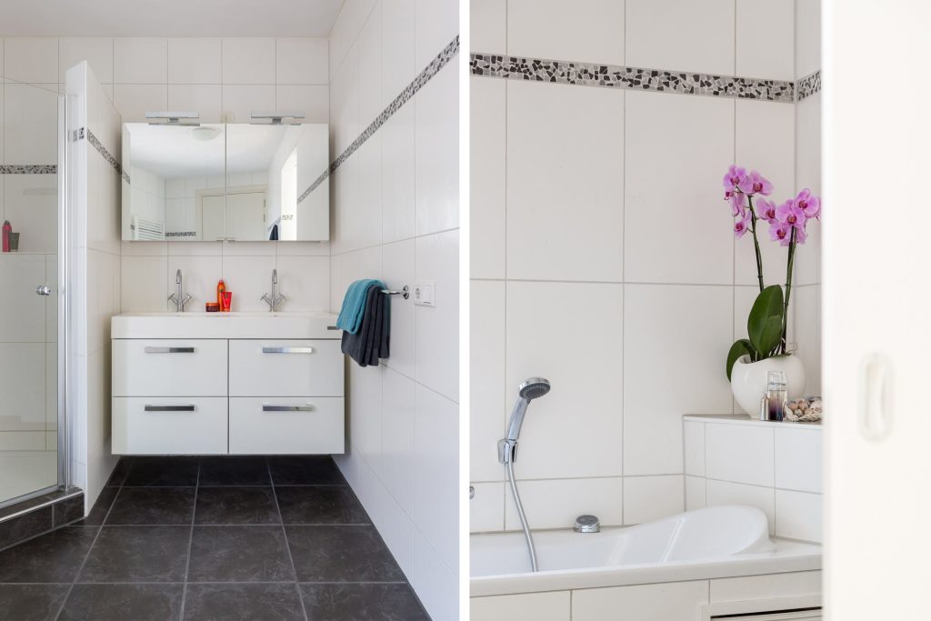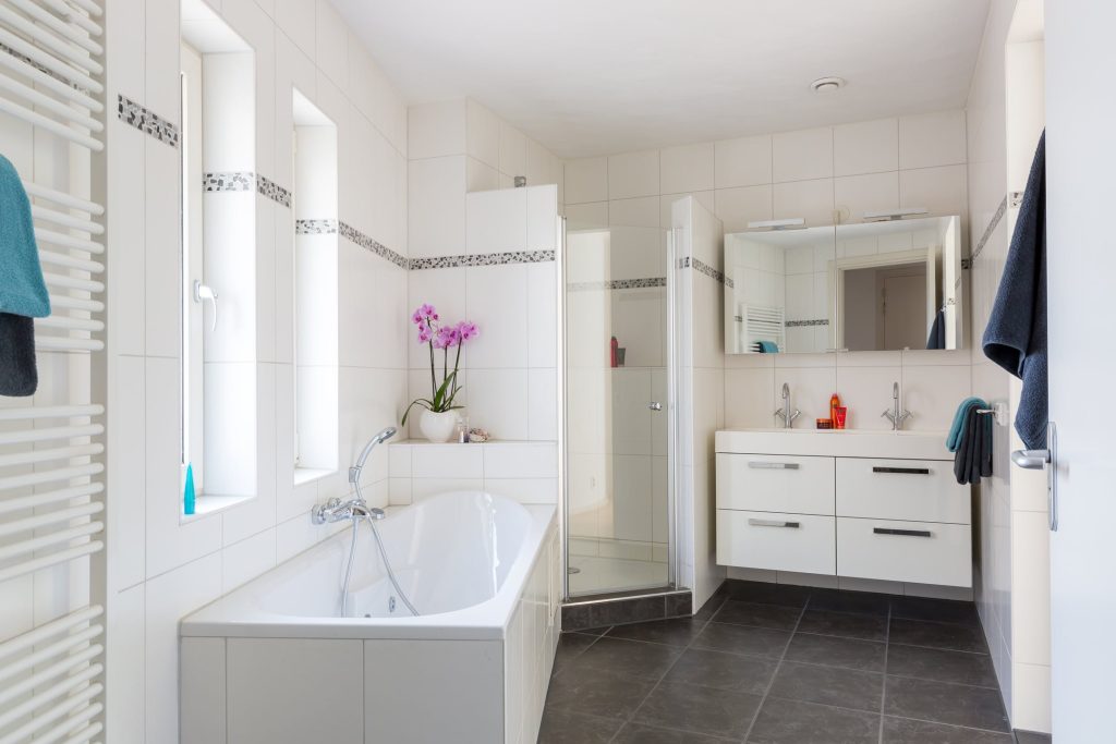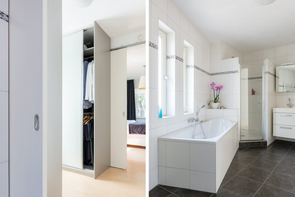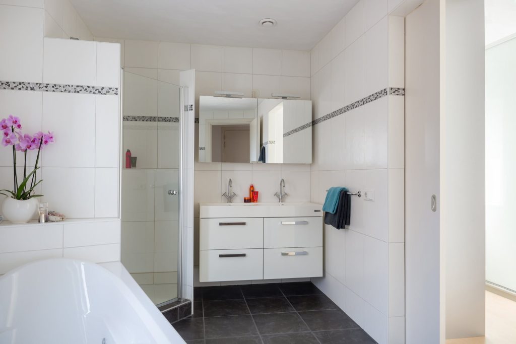 Op de eerste verdieping bevinden zich drie slaapkamers, een walk-in closet met dubbele kastenwand, aansluitend de badkamer en een separaat toilet. De ouderslaapkamer is uitgerust met vaste kledingkasten. Rechtstreeks vanuit de hoofdslaapkamer bereikt men via de walk-in closet (deze ruimte is af te sluiten met 2 schuifdeuren) de badkamer met bubbelbad, douchecabine en wastafelmeubel met dubbele wastafel.