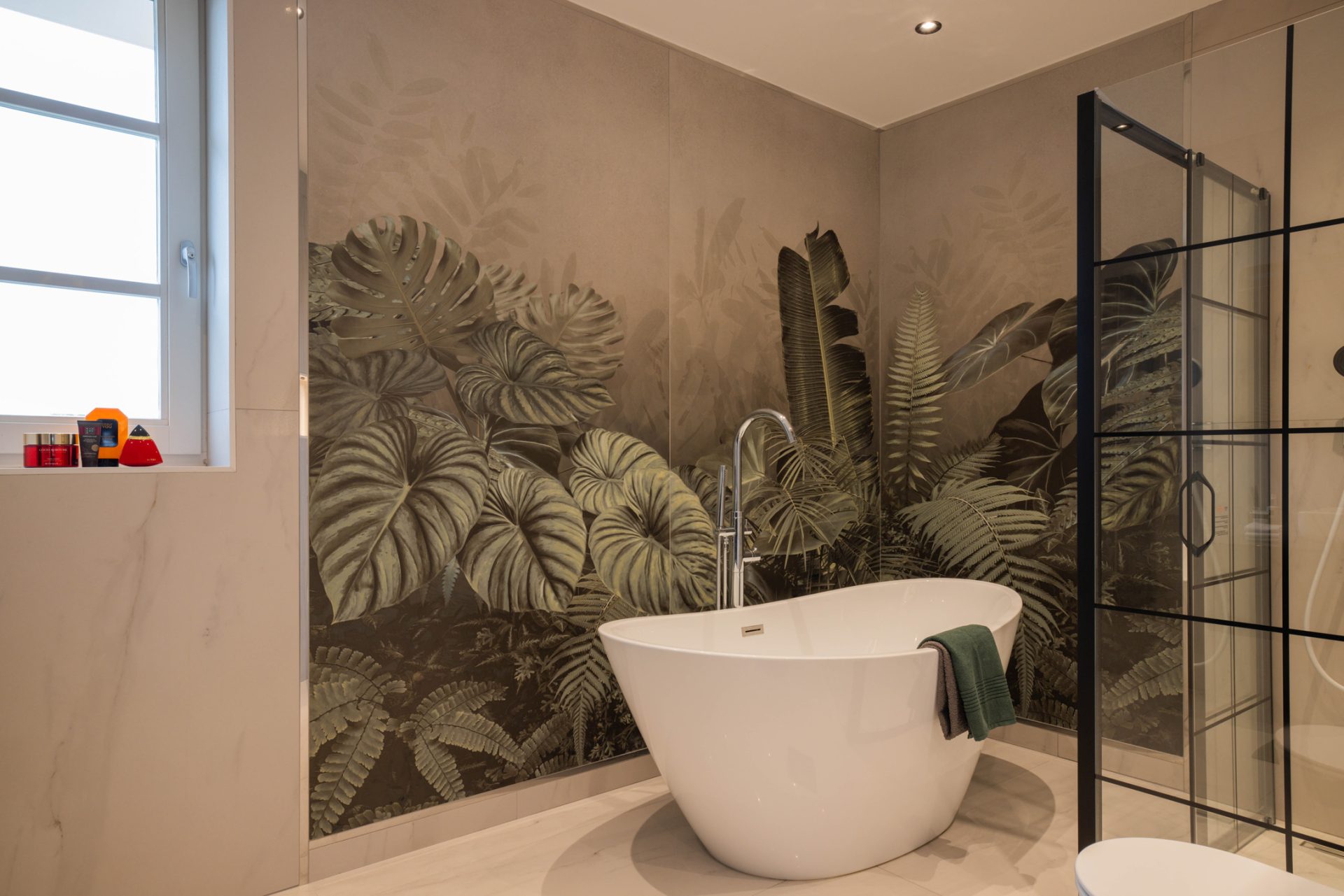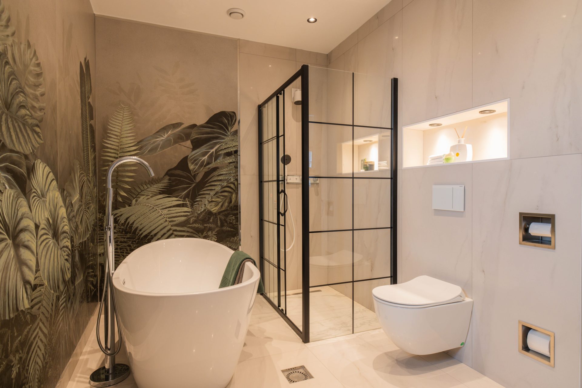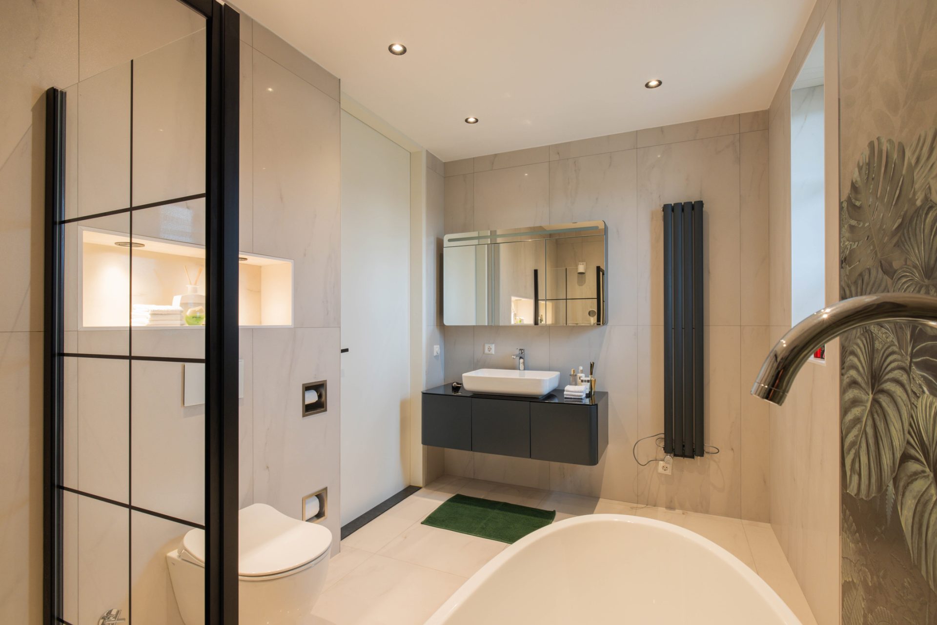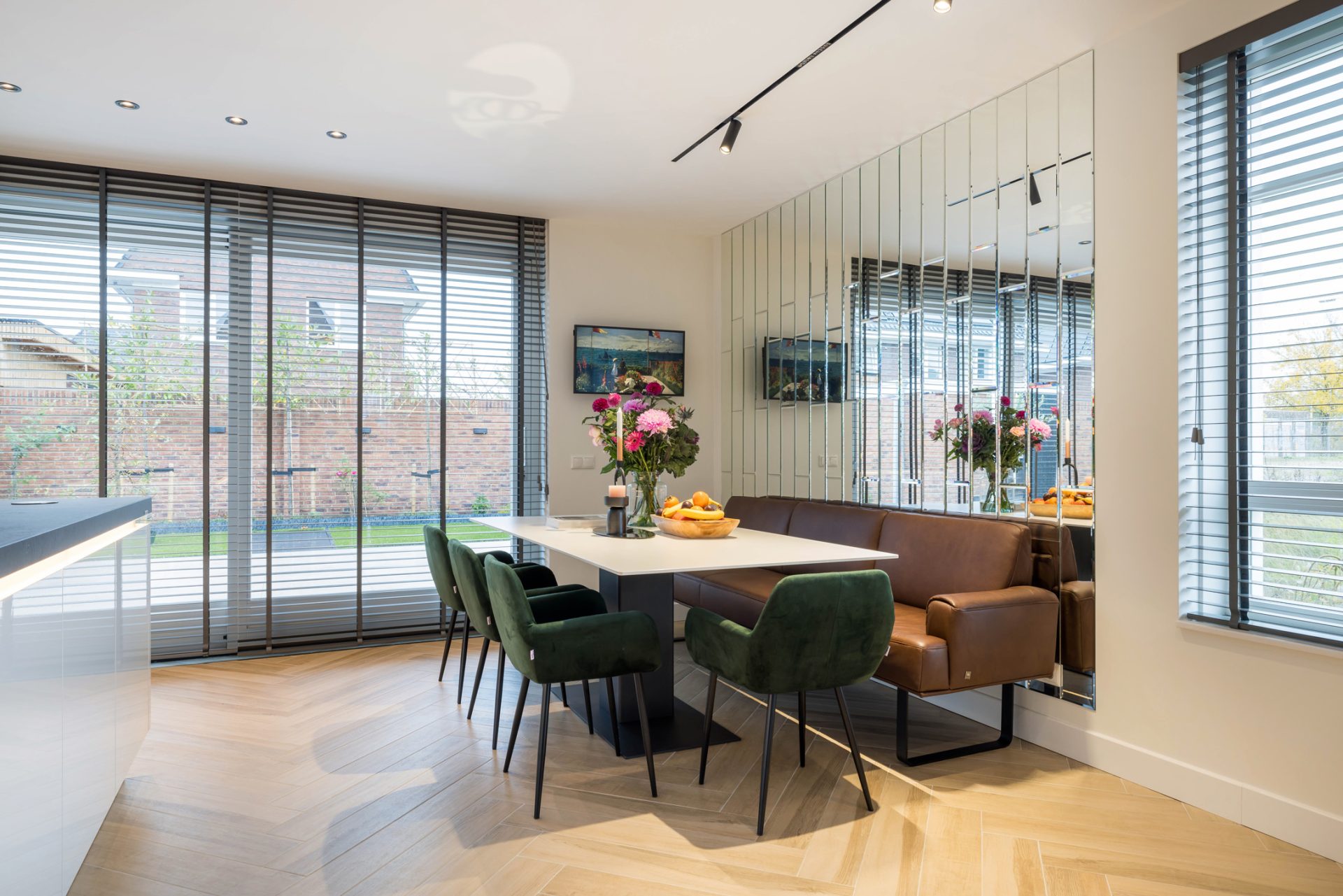 Verrassend is de indeling op de eerste verdieping met drie ruime slaapkamers, een luxe badkamer en een aparte toiletruimte. Er ligt, net als op de begane grond, een visgraatvloer met vloerverwarming en de plafonds zijn fraai afgewerkt met inbouwverlichting.