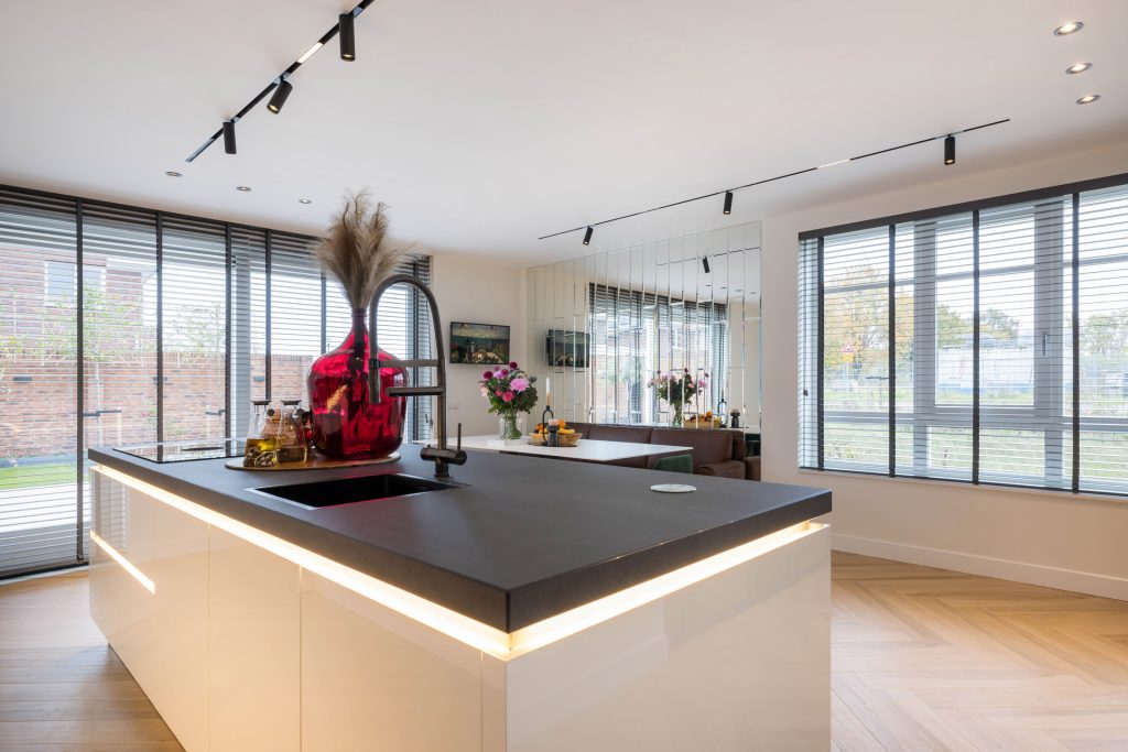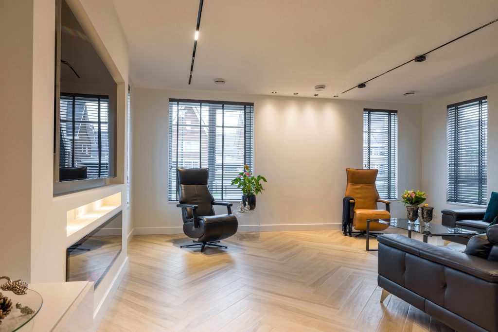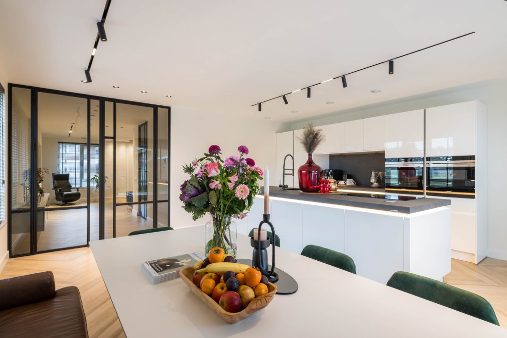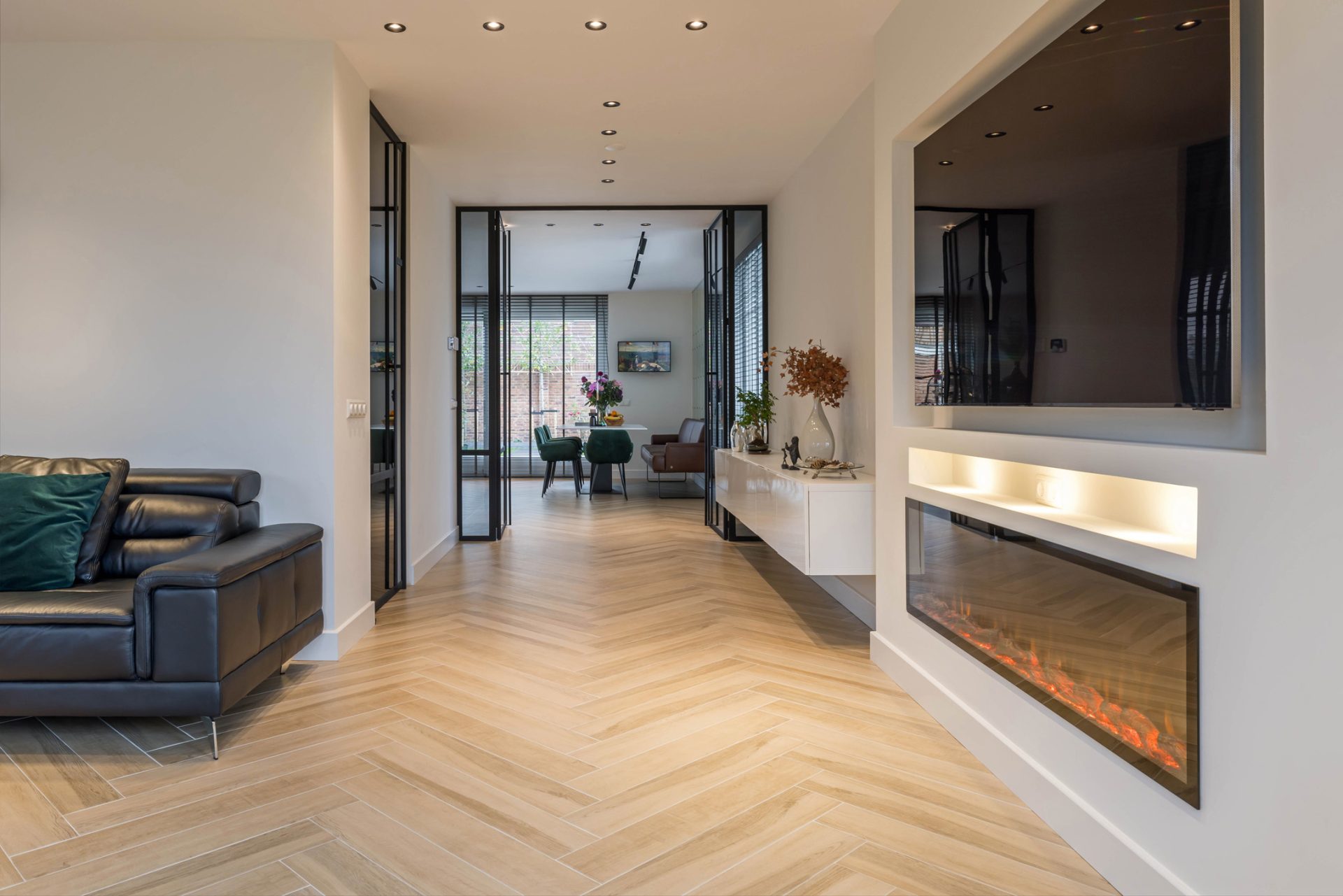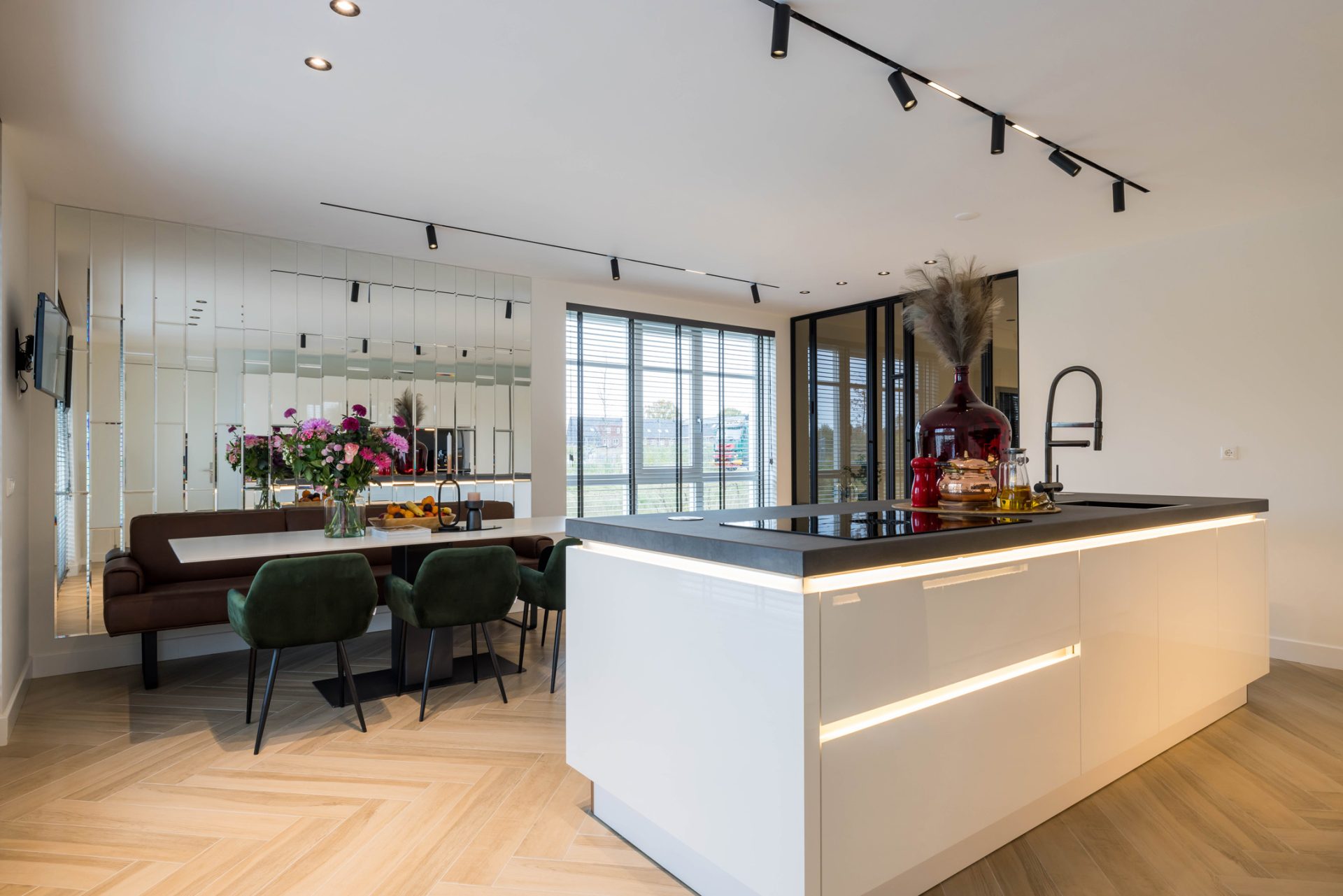 De L-vormige woonkamer met uitzicht aan drie zijden is een lichte leefruimte die in open verbinding staat met de luxe keuken. Het stucwerk, de visgraatvloer met vloerverwarming, de stalen deuren met glas en de cinewall met sierhaard trekken direct de aandacht. In de keuken staat een prachtige keukenopstelling met een groot eiland en alle benodigde inbouwapparatuur van topkwaliteit.