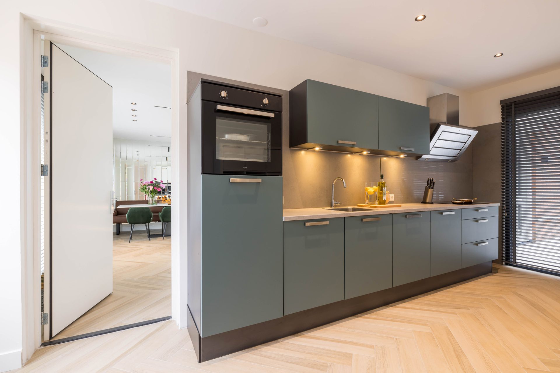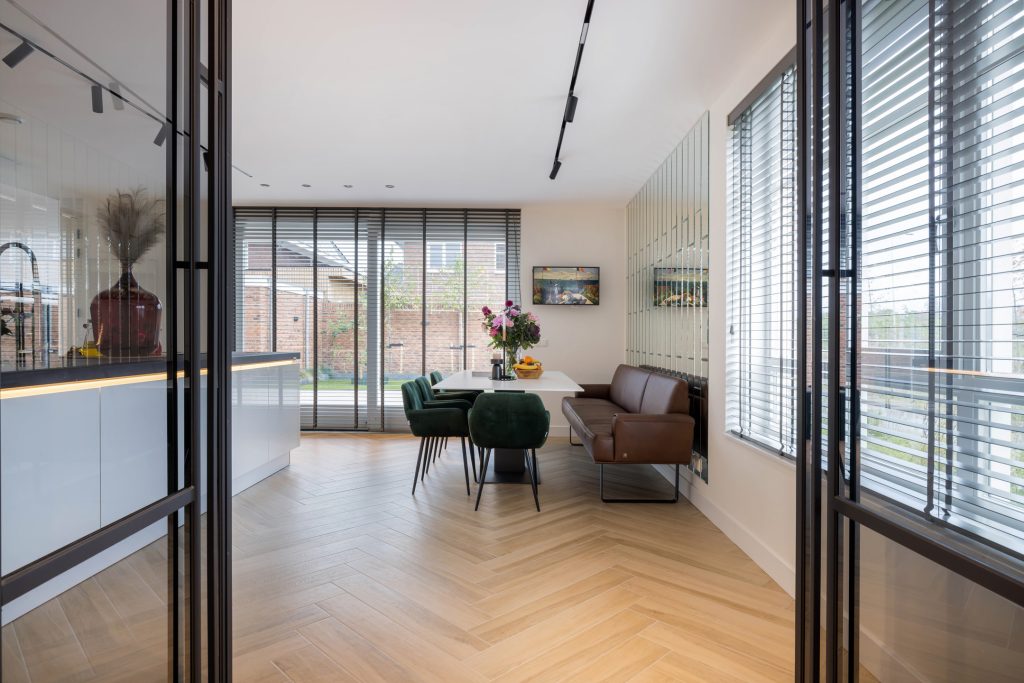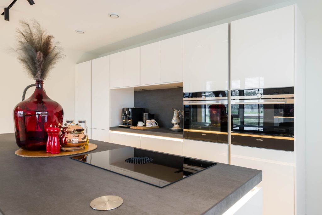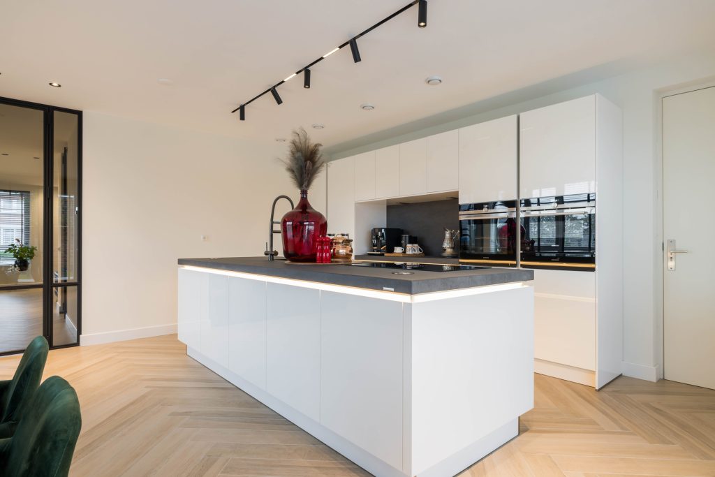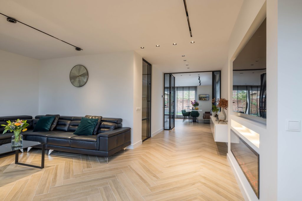 De L-vormige woonkamer met uitzicht aan drie zijden is een lichte leefruimte die in open verbinding staat met de luxe keuken. Het stucwerk, de visgraatvloer met vloerverwarming, de stalen deuren met glas en de cinewall met sierhaard trekken direct de aandacht. In de keuken staat een prachtige keukenopstelling met een groot eiland en alle benodigde inbouwapparatuur van topkwaliteit.