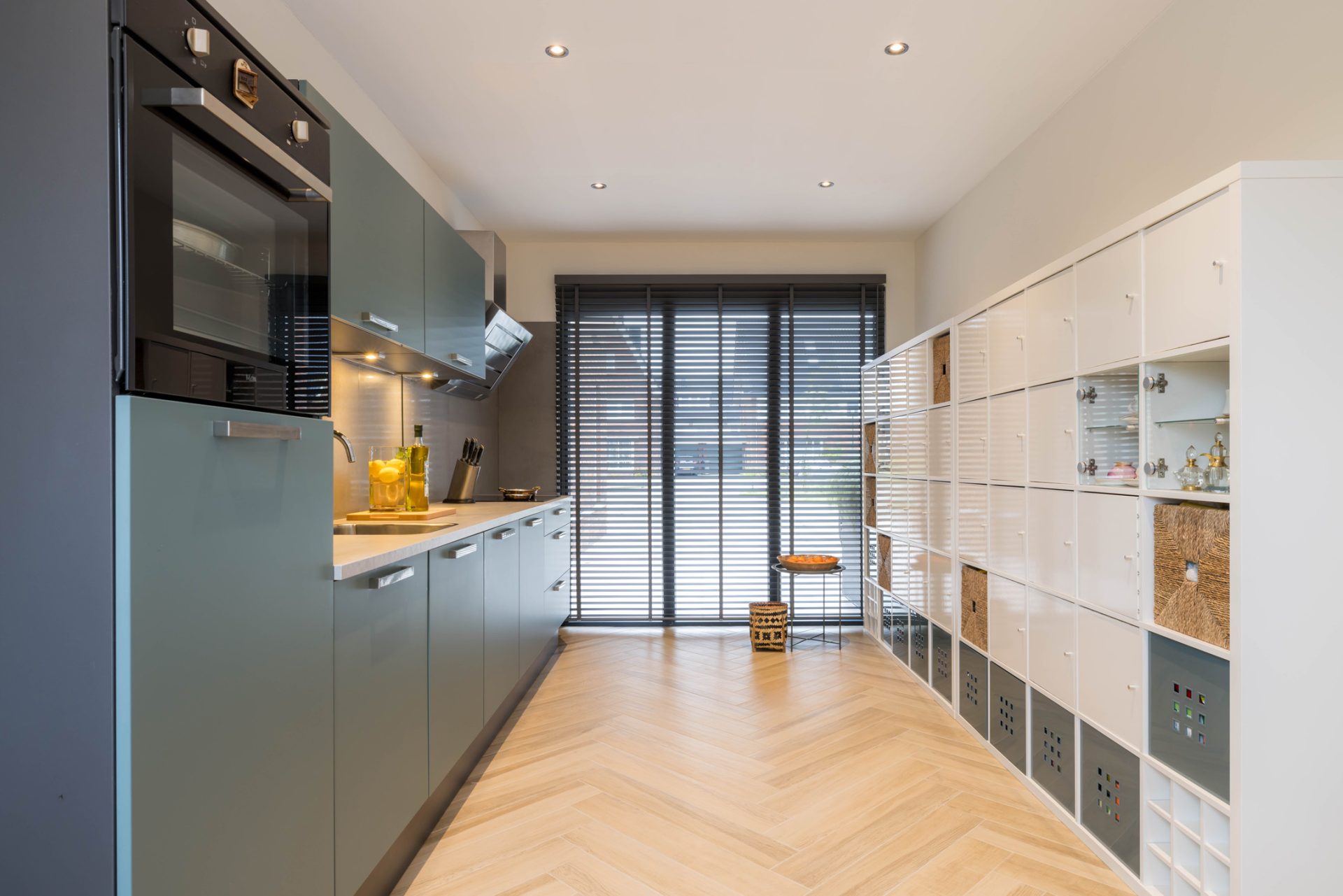 In de hoek van de keuken is een deur naar de bijkeuken/berging, wat oorspronkelijk de garage was. Deze multifunctionele ruimte met tweede keukenblok heeft een pui met glas aan de voorzijde, een deur naar de tuin en een uitstekende afwerking. Niet alleen als bijkeuken/berging, maar ook als kantoor-/praktijk biedt deze ruimte goede mogelijkheden.