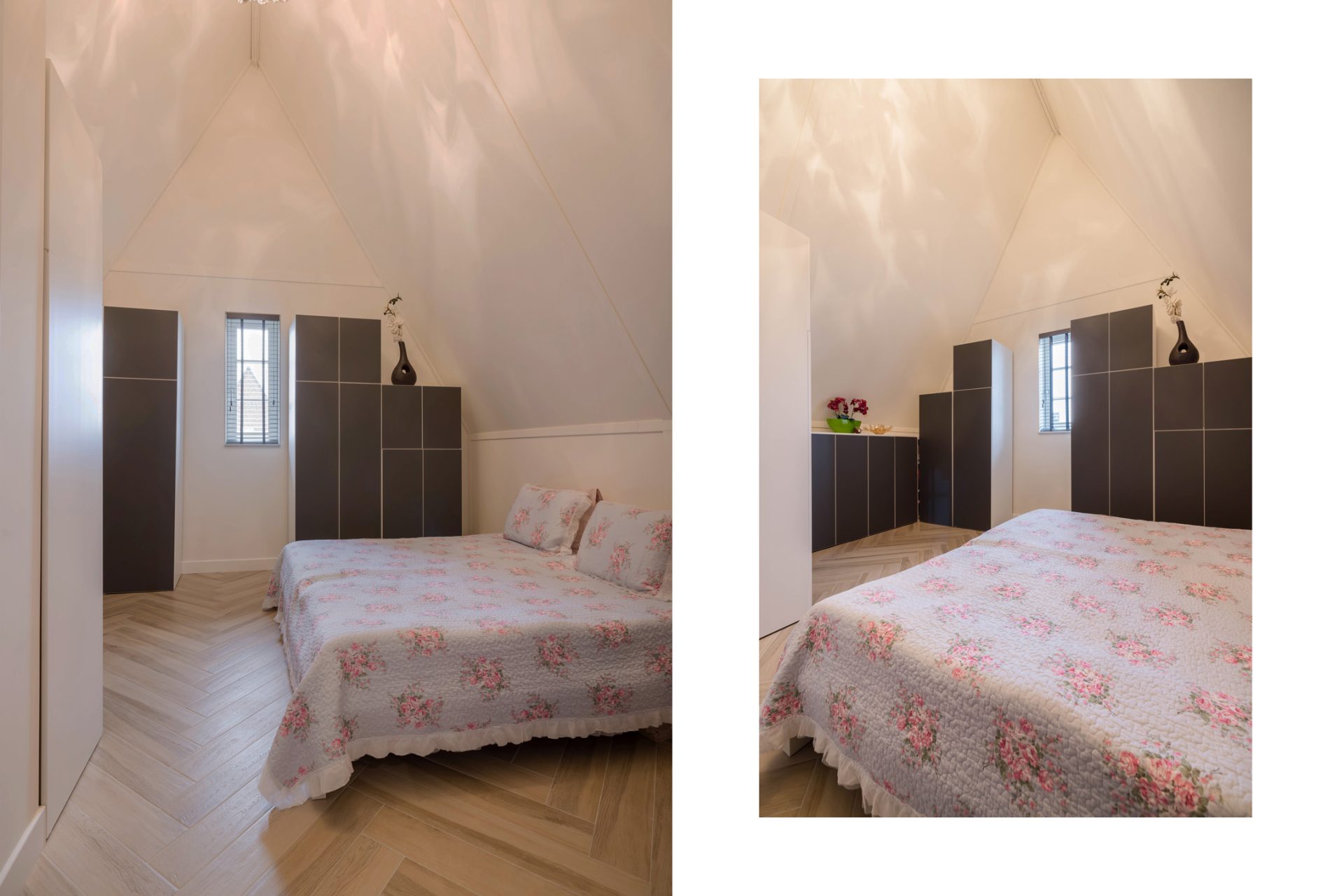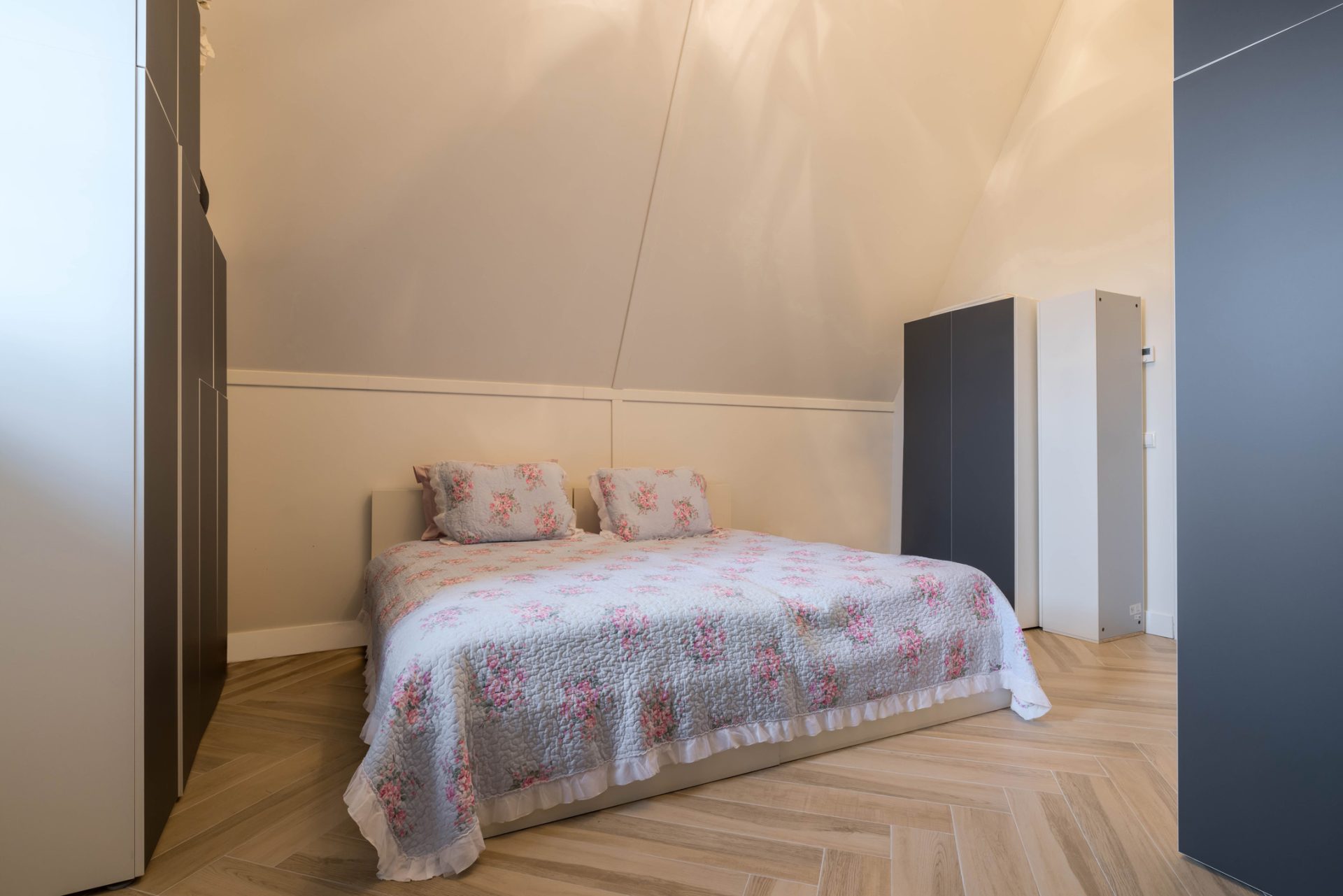 Vanaf de overloop zijn nog twee slaapkamers, een tweede badkamer en een berging/wasruimte te bereiken. De twee slaapkamers hebben een visgraatvloer en zijn heel sfeervol. De grootste kamer heeft een hoge nok. De badkamer met een ruime douche en wastafel is perfect voor de kinderen of logees. In de nok is een bergzolder, gesitueerd boven de overloop, badkamer en berging.