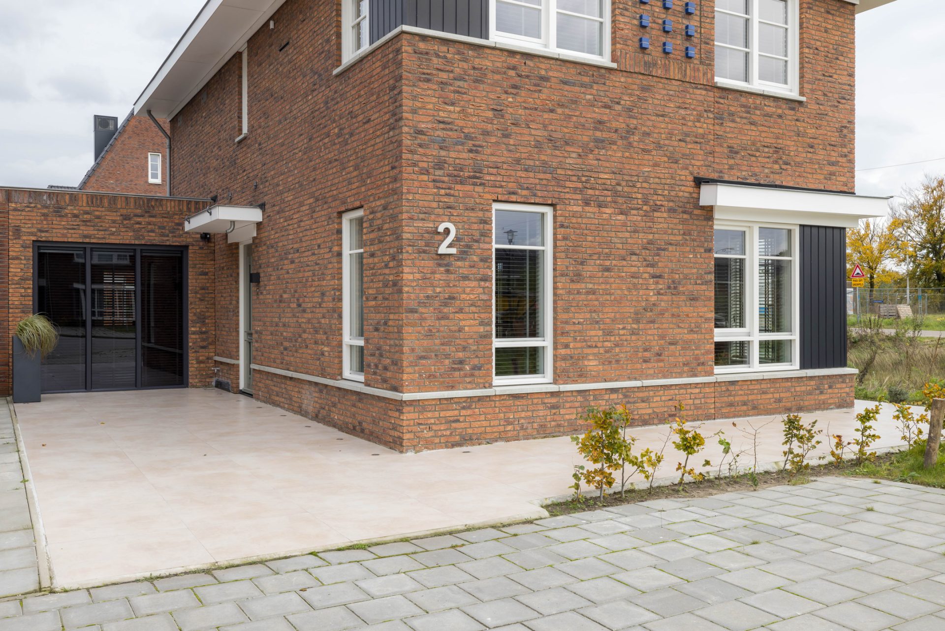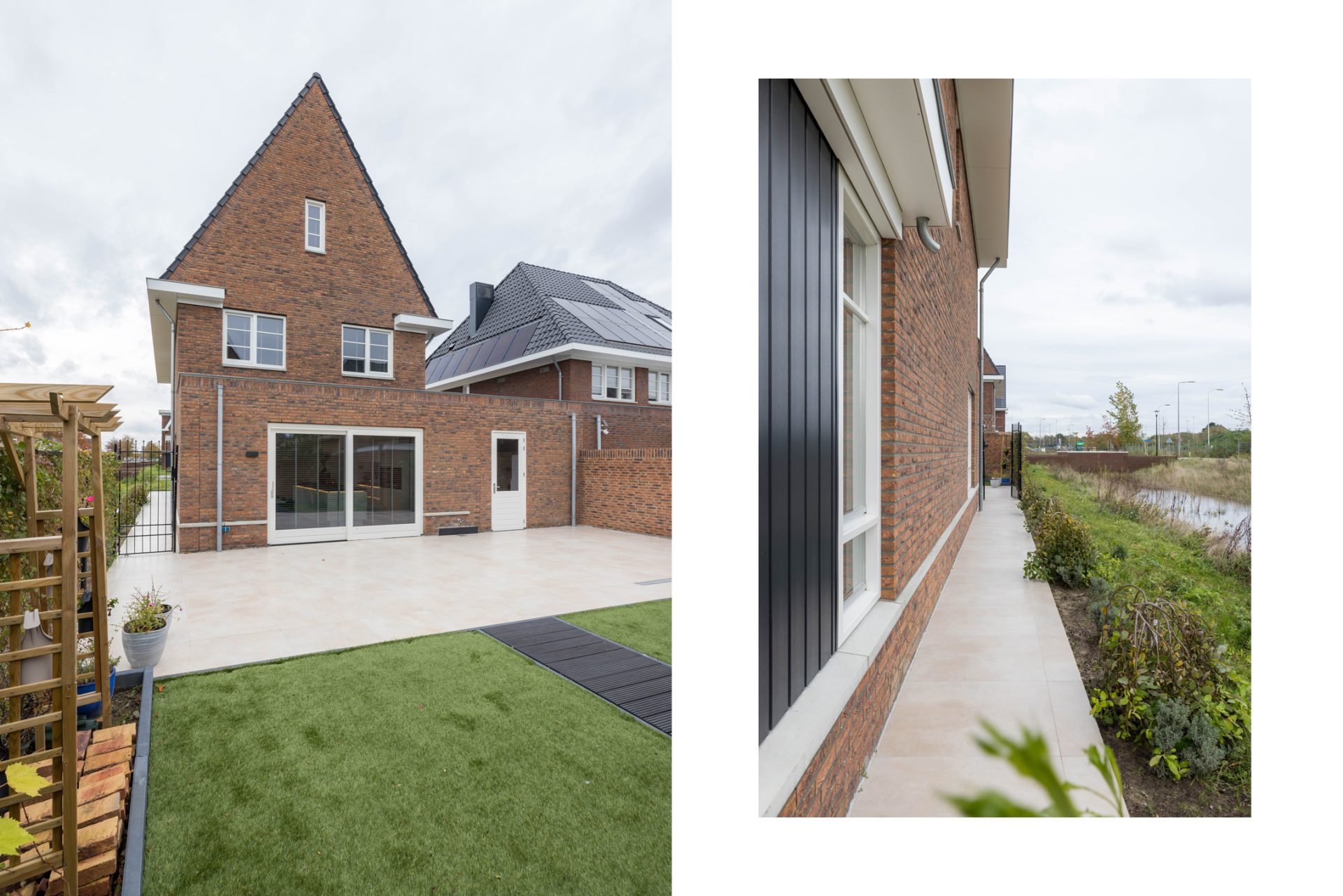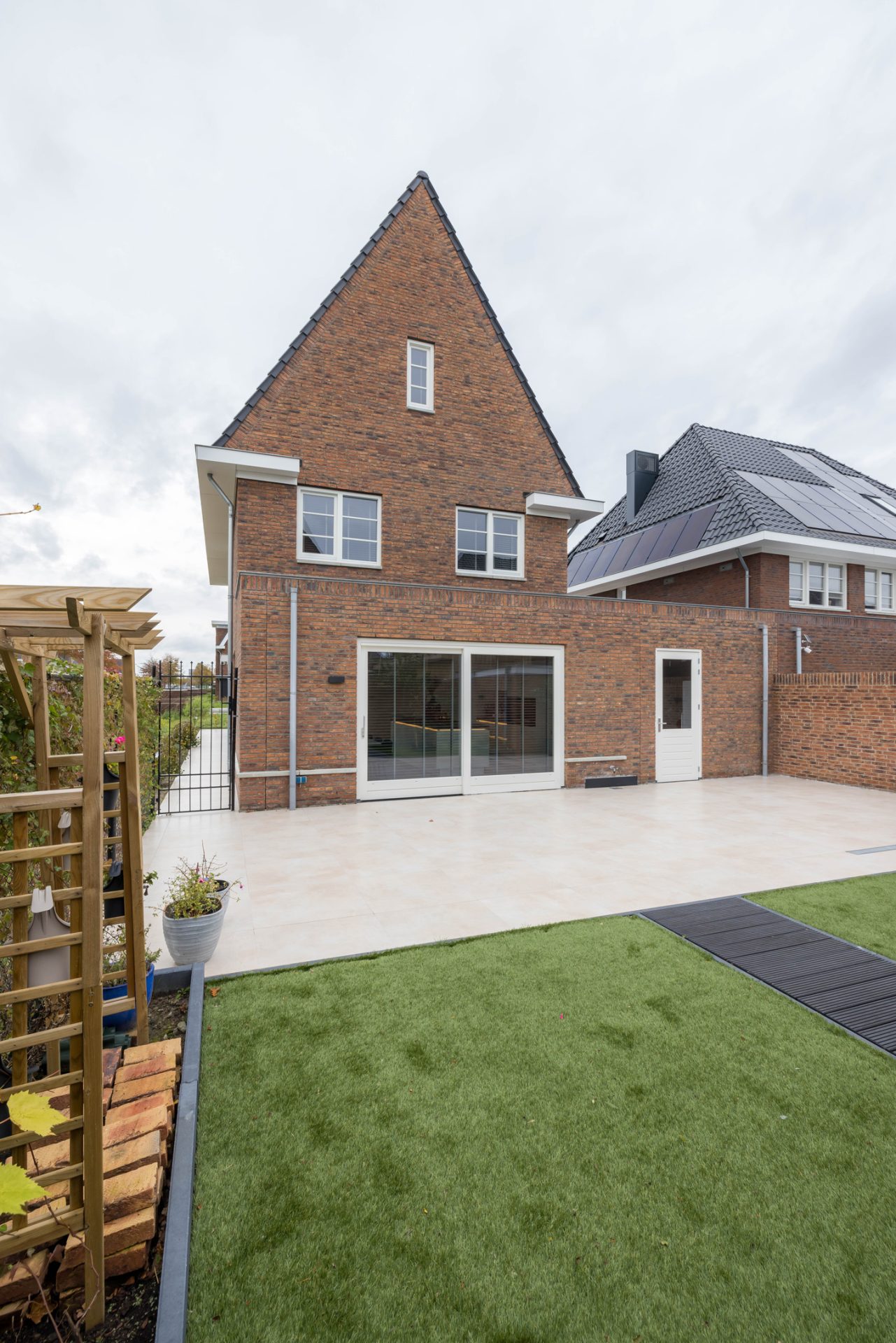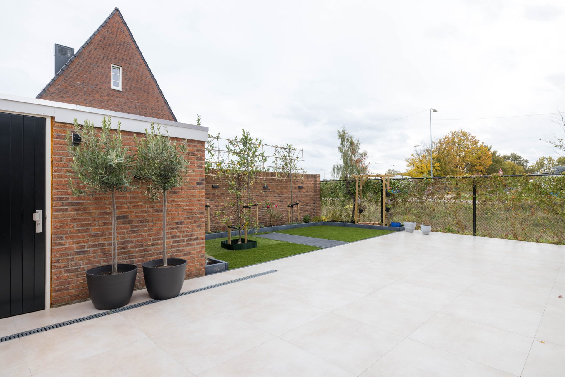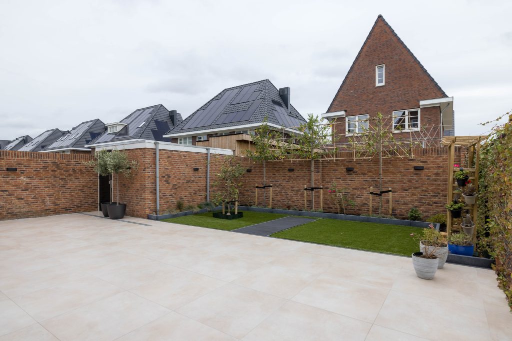 Rondom de villa en op de oprit liggen prachtige, keramische tegels en de achtertuin is heel onderhoudsvriendelijk aangelegd. Leibomen zorgen voor privacy en als de klimop verder groeit, heb je in deze tuin optimale privacy. In de hoek van de tuin staat een stenen berging met elektra en een deur naar de steeg.