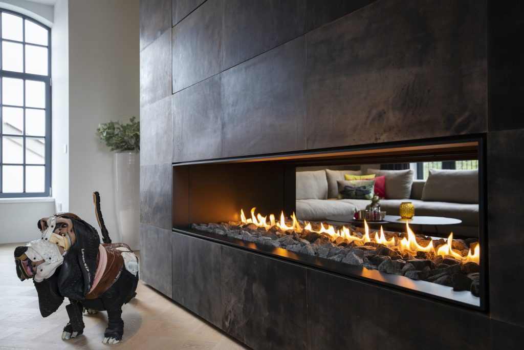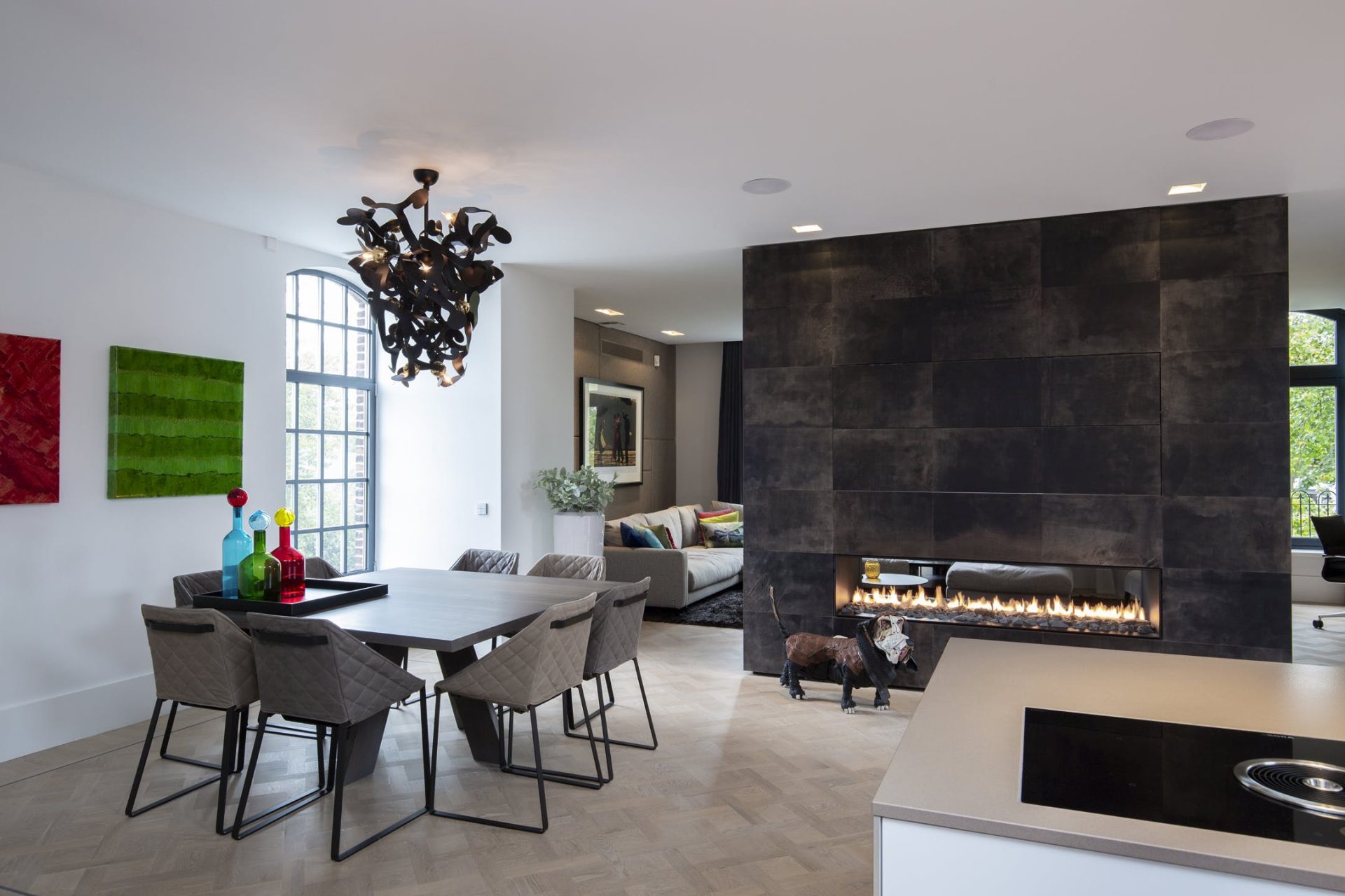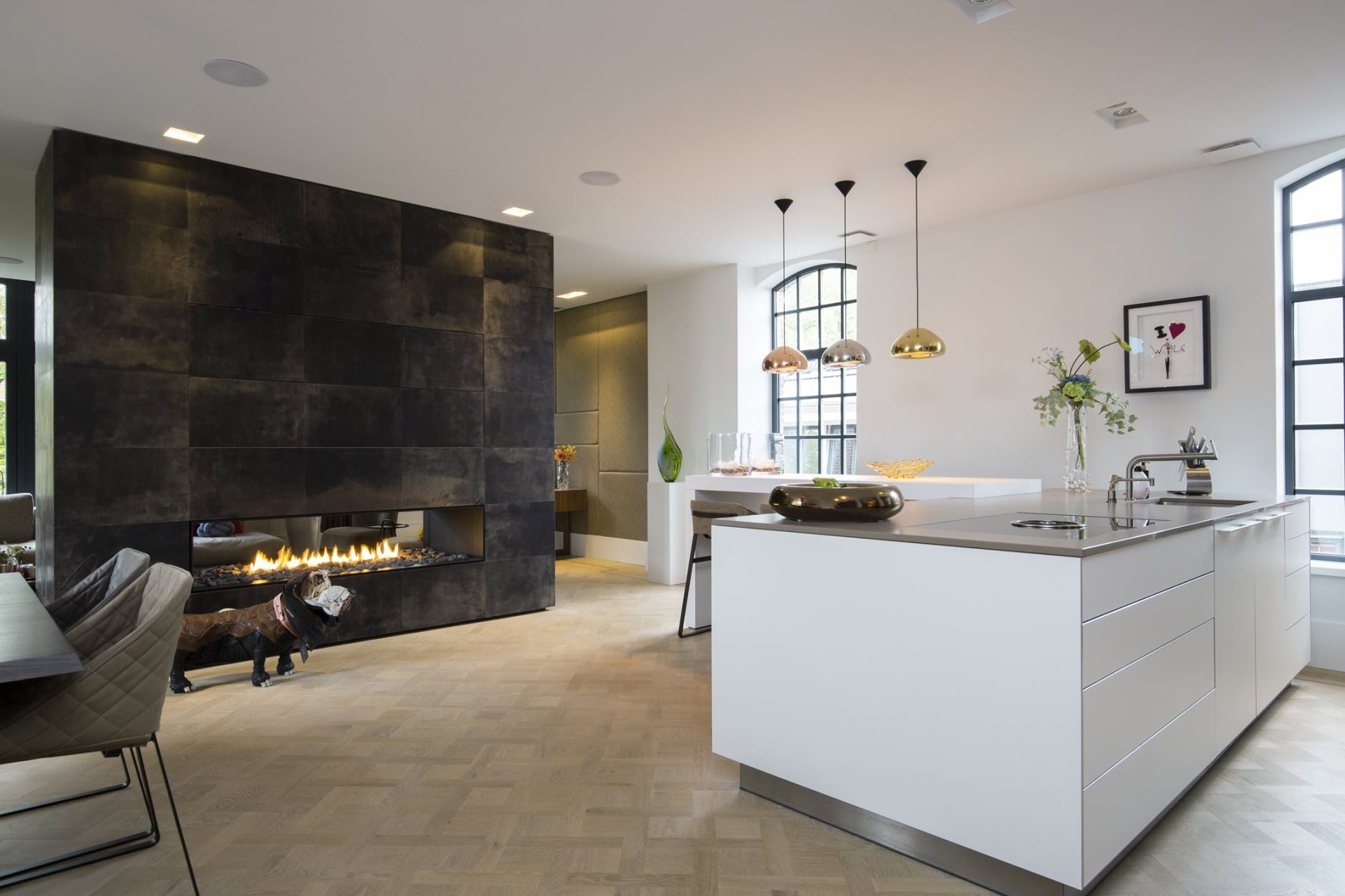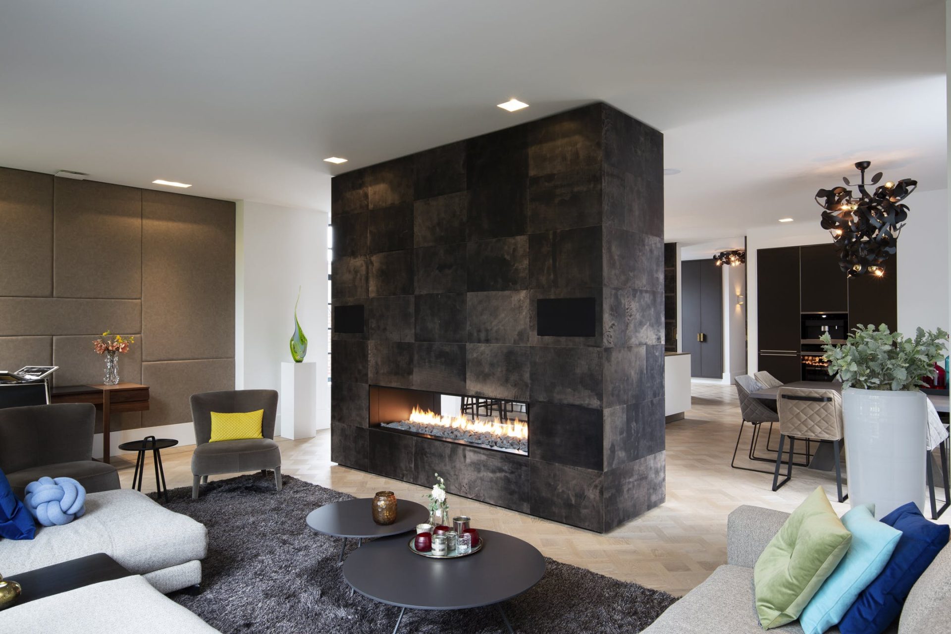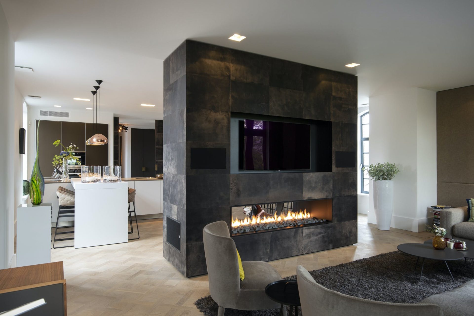 • middels een roomdivider bekleed met buffelleer wordt het eet-/en kookgedeelte gescheiden van het zitgedeelte, de roomdivider met doorkijk gashaard is aan weerszijden voorzien van een geïntegreerde Oled tv