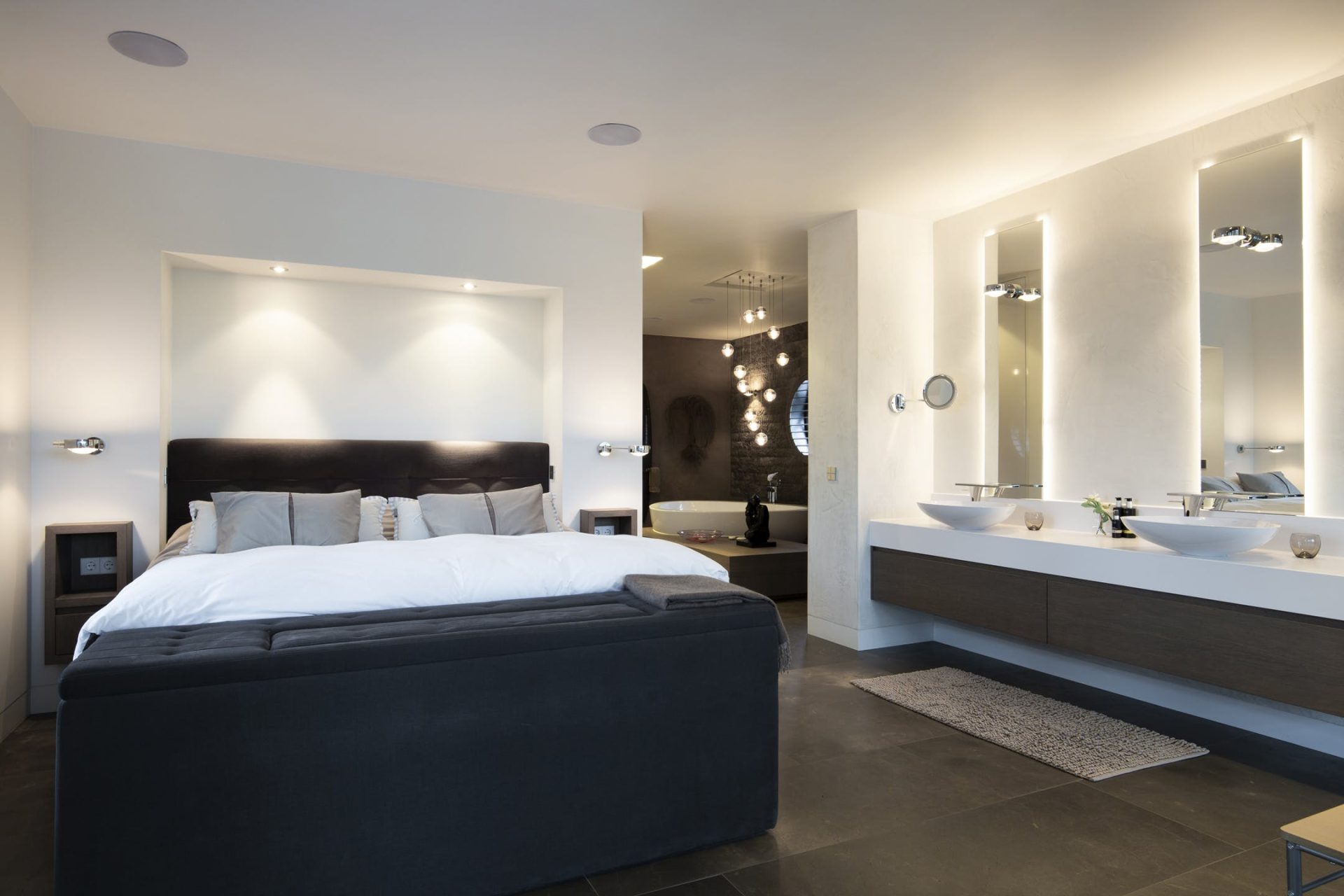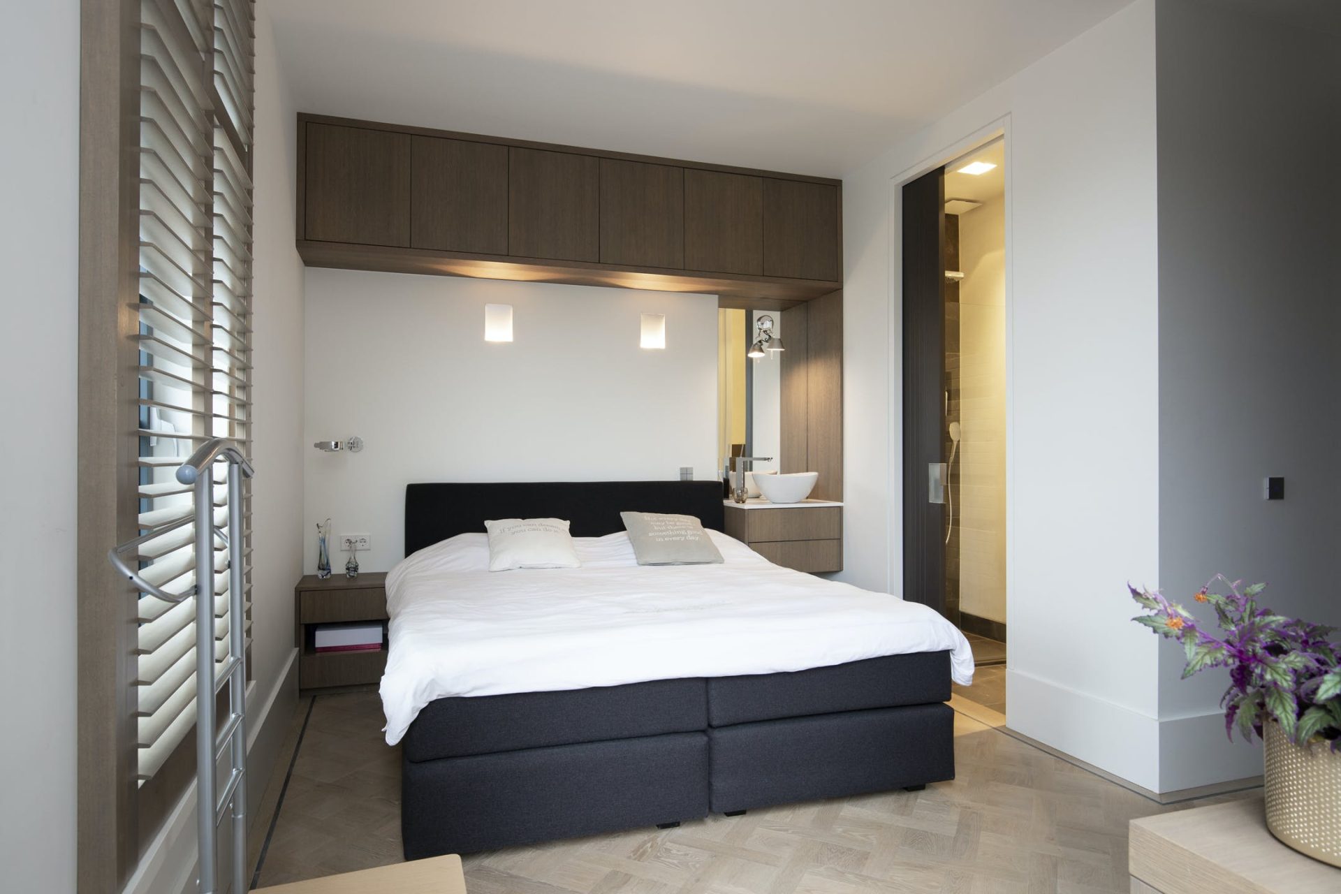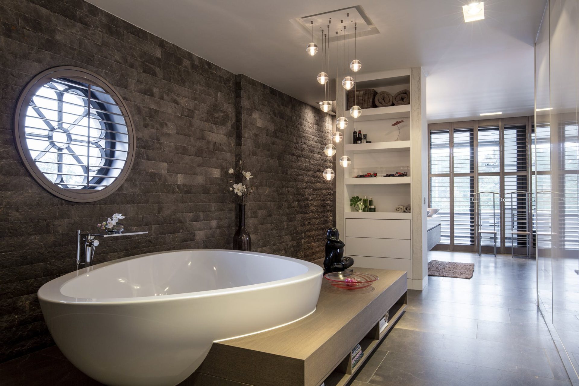 • riante master suite met inbouwkasten, poef met geïntegreerde tv, inloopregendouche, bad, wastafelmeubel en aangrenzende loggia