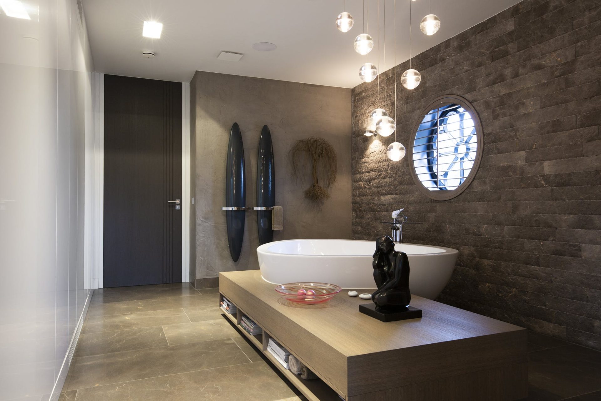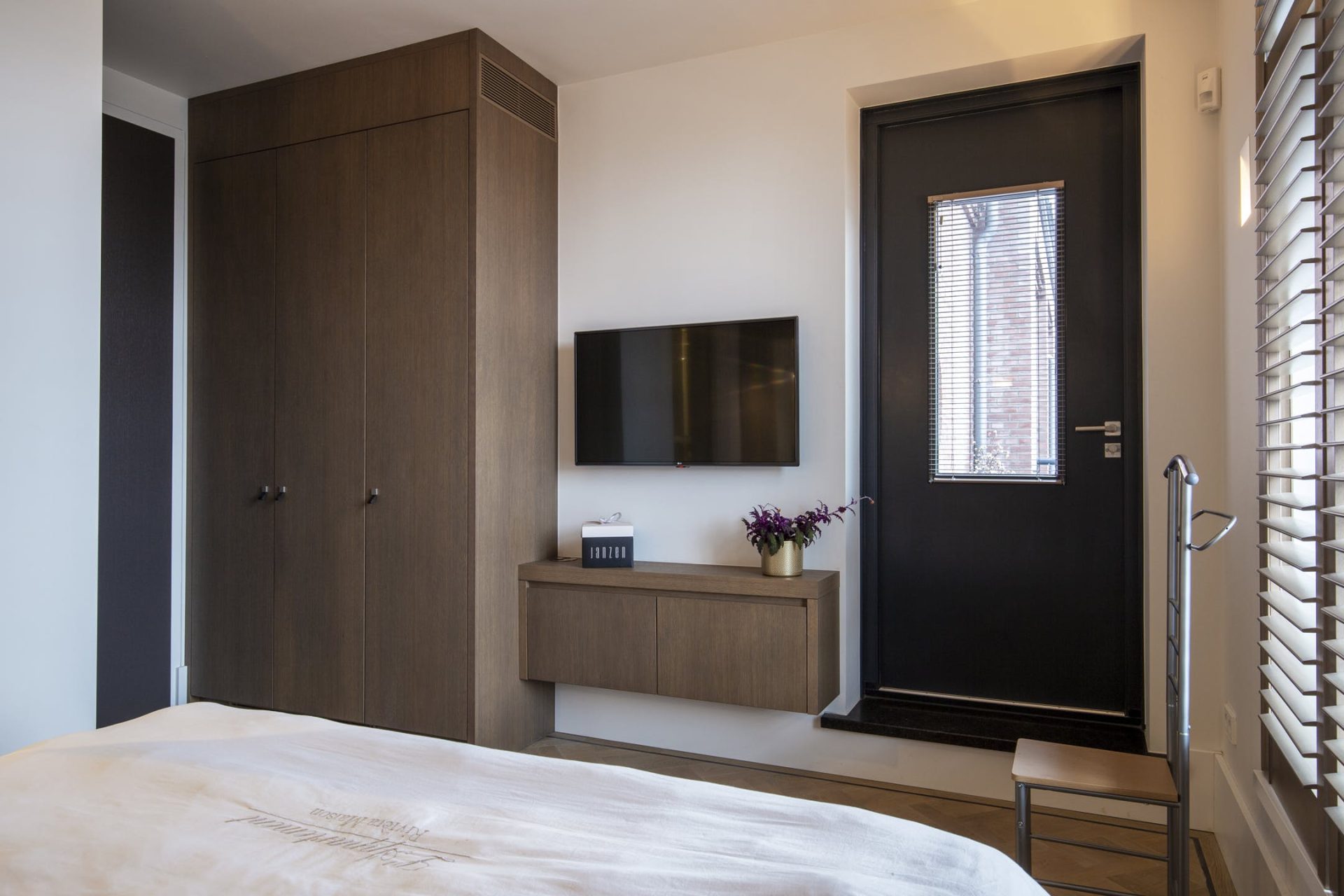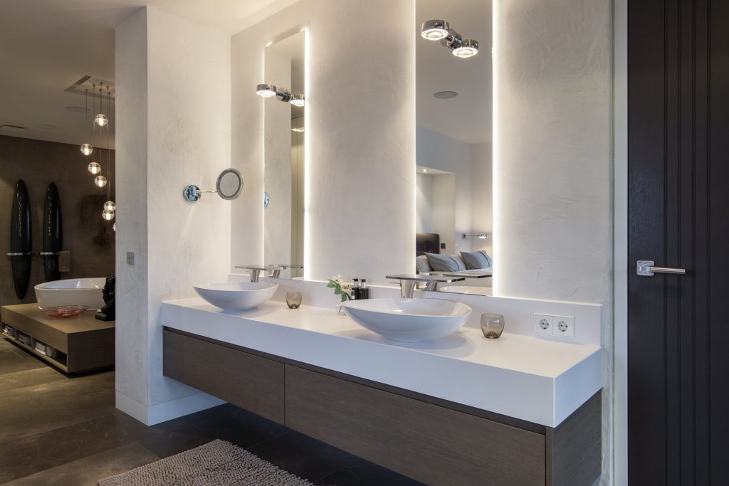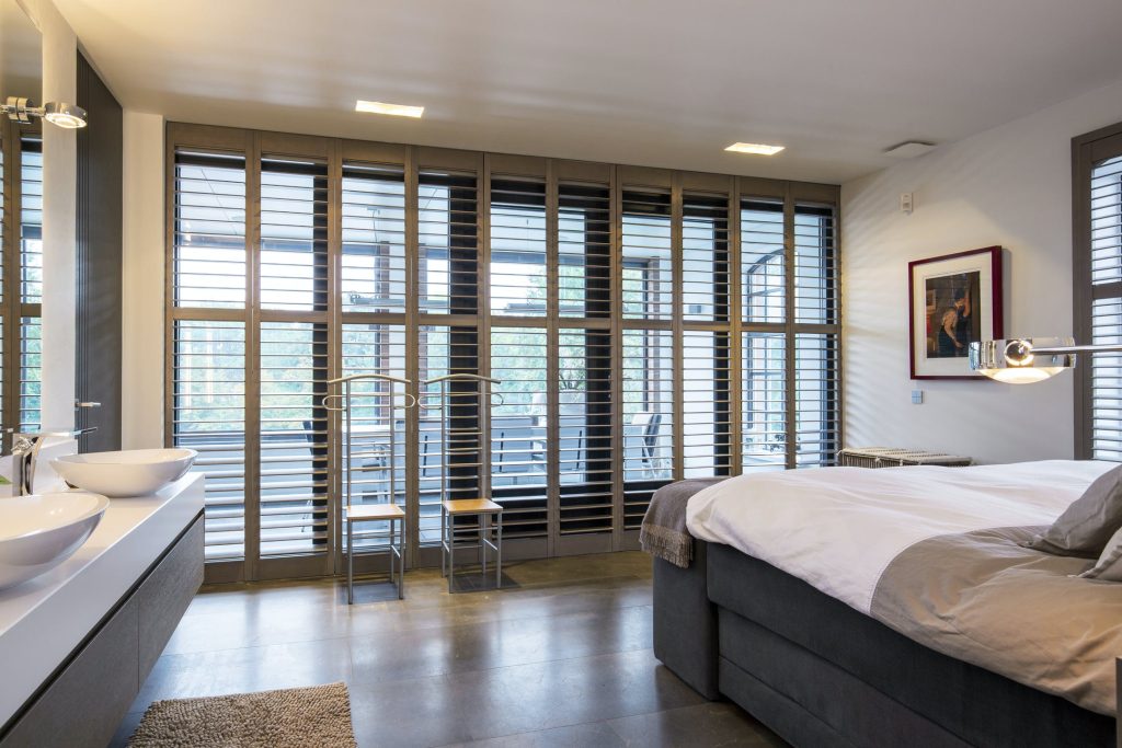 • riante master suite met inbouwkasten, poef met geïntegreerde tv, inloopregendouche, bad, wastafelmeubel en aangrenzende loggia