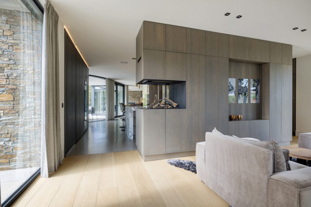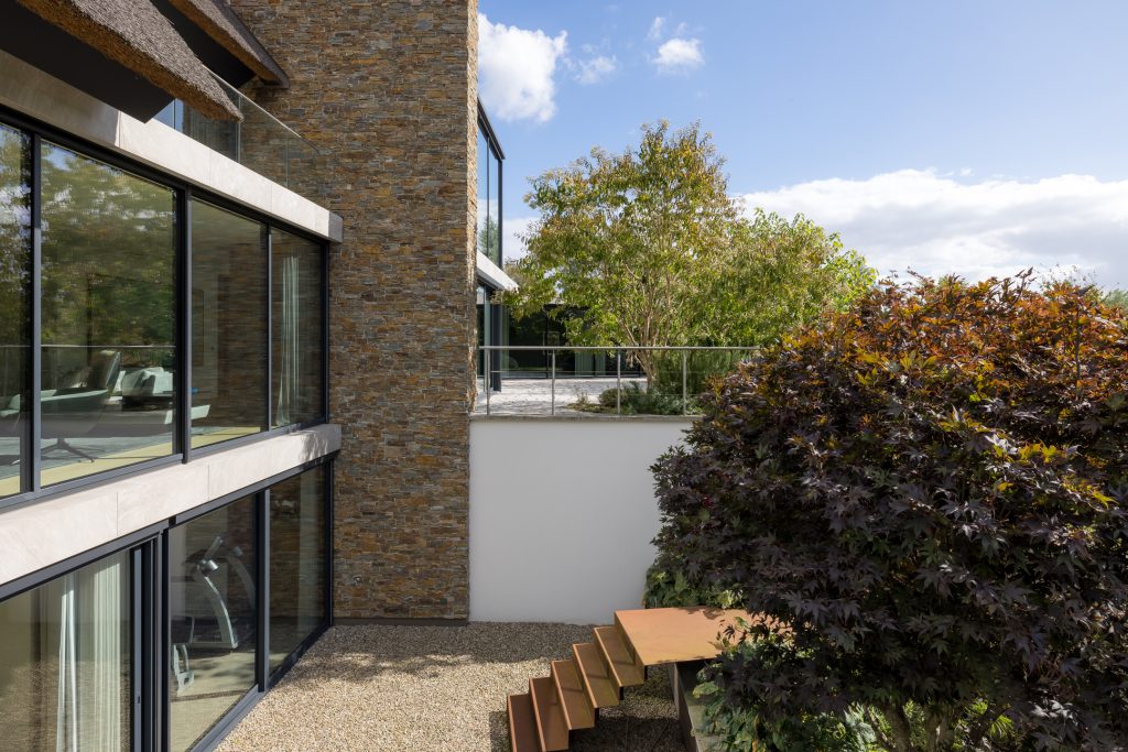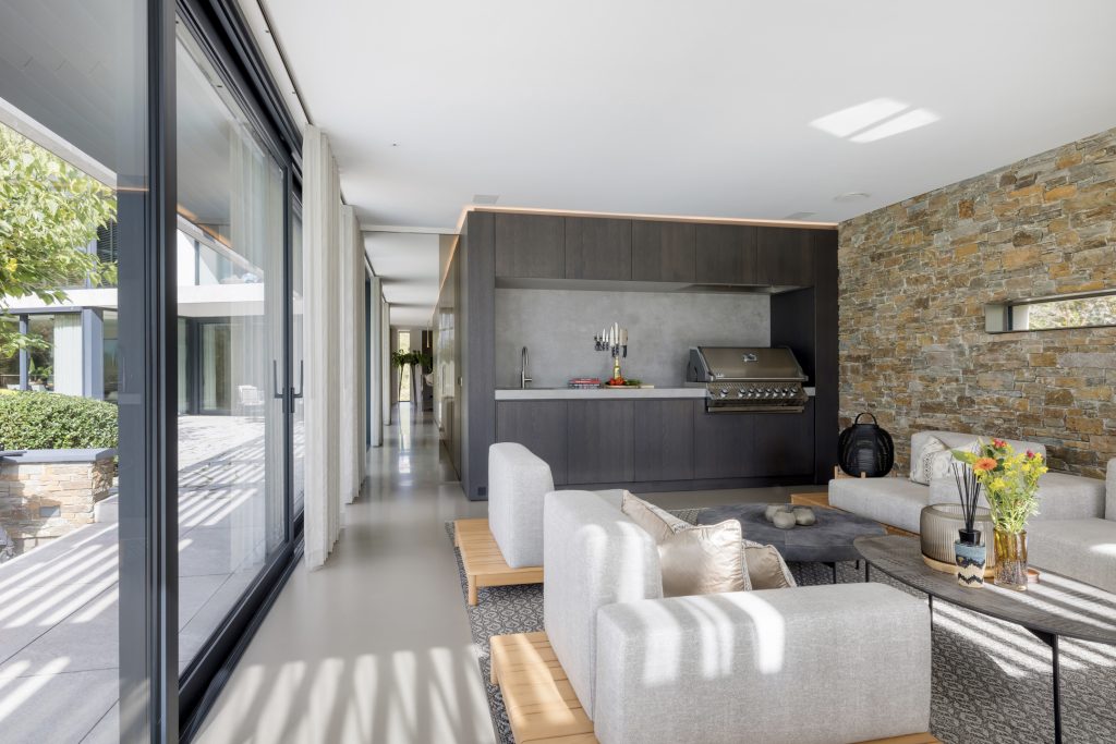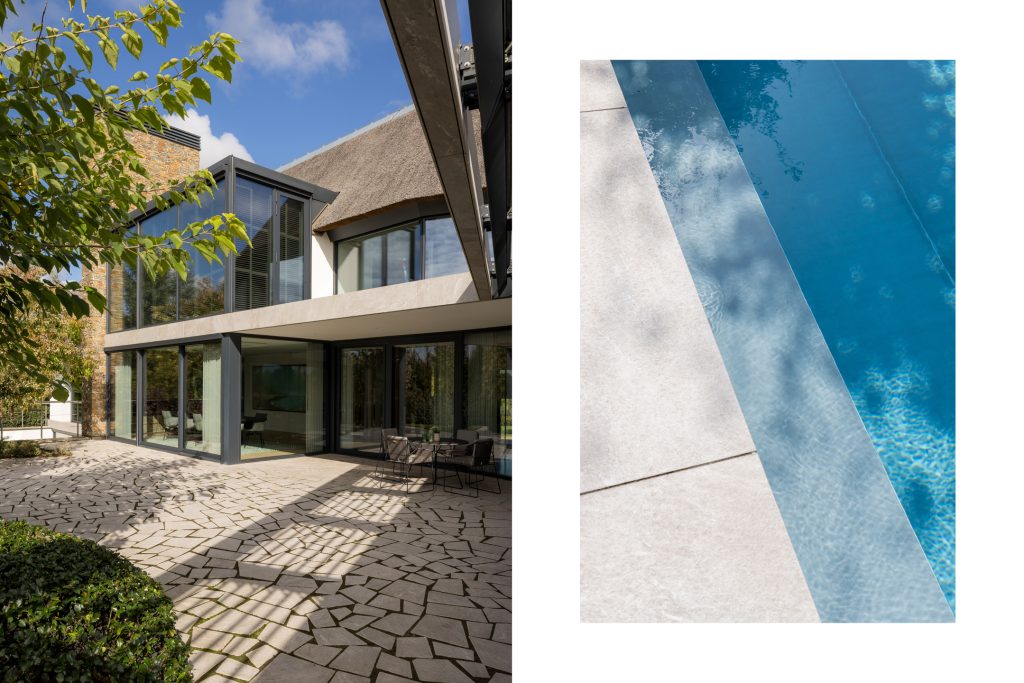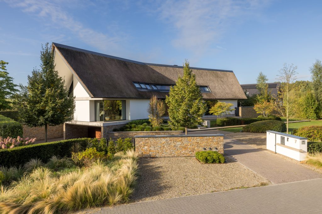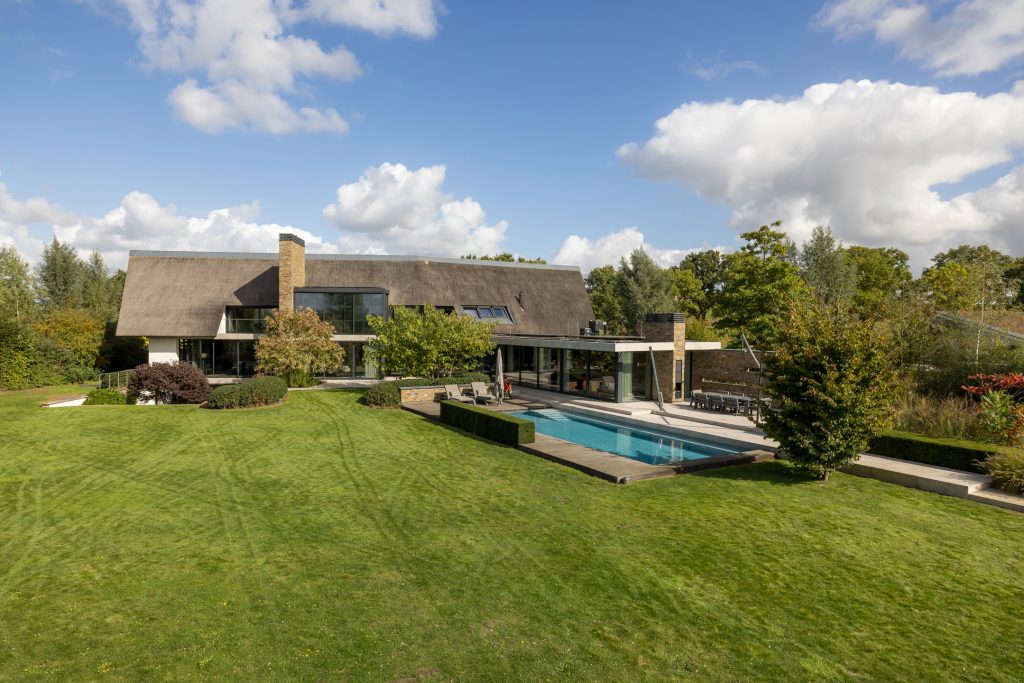 Materialen als warm hout, wit stucwerk, breuksteen en een modern rietdak zorgen voor een vriendelijke en tijdloze uitstraling. Grote raampartijen halen het licht en het landschap naar binnen. Zelfs het souterrain – bereikbaar via een cortenstalen trap als rode loper door het landschap – ademt deze visie, met een riante gym, wijnkamer en zicht op de tuin.