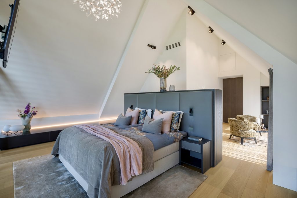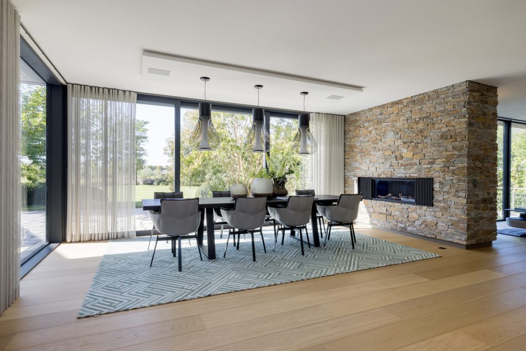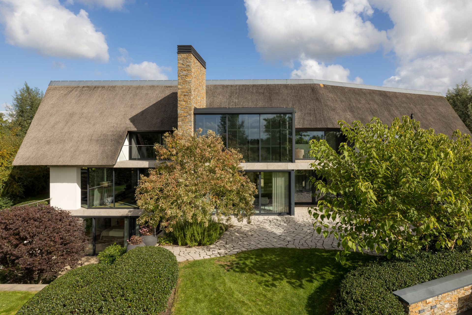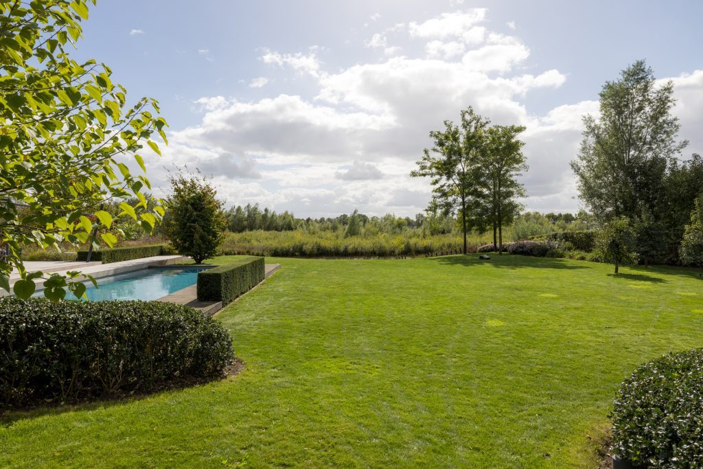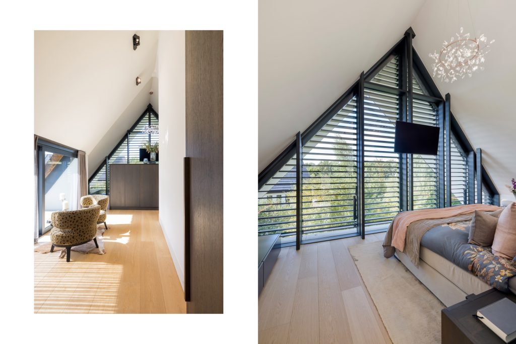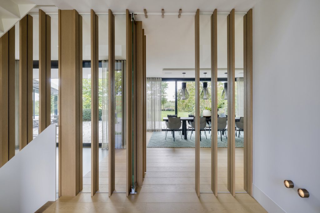 Materialen als warm hout, wit stucwerk, breuksteen en een modern rietdak zorgen voor een vriendelijke en tijdloze uitstraling. Grote raampartijen halen het licht en het landschap naar binnen. Zelfs het souterrain – bereikbaar via een cortenstalen trap als rode loper door het landschap – ademt deze visie, met een riante gym, wijnkamer en zicht op de tuin.
