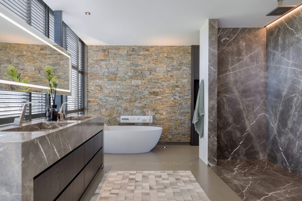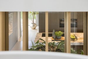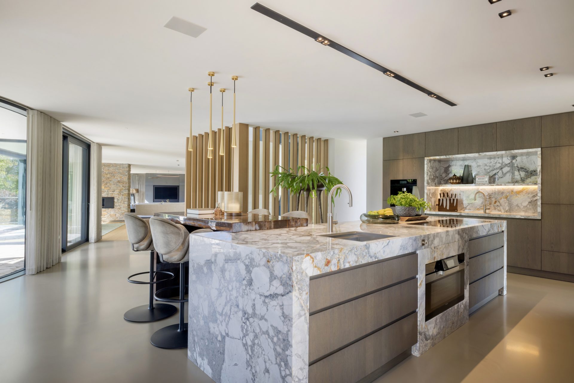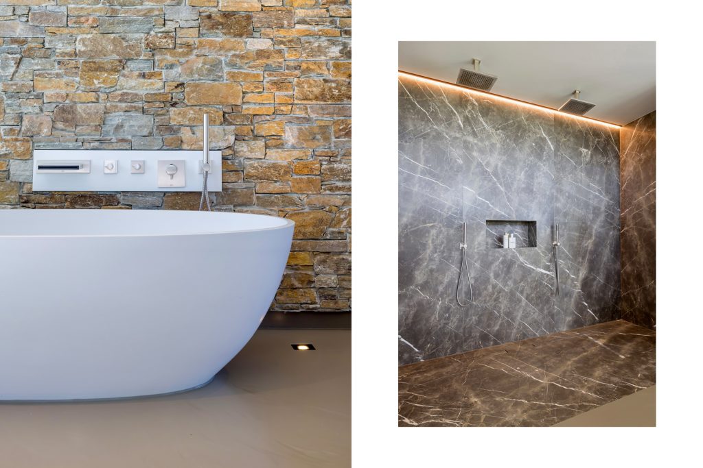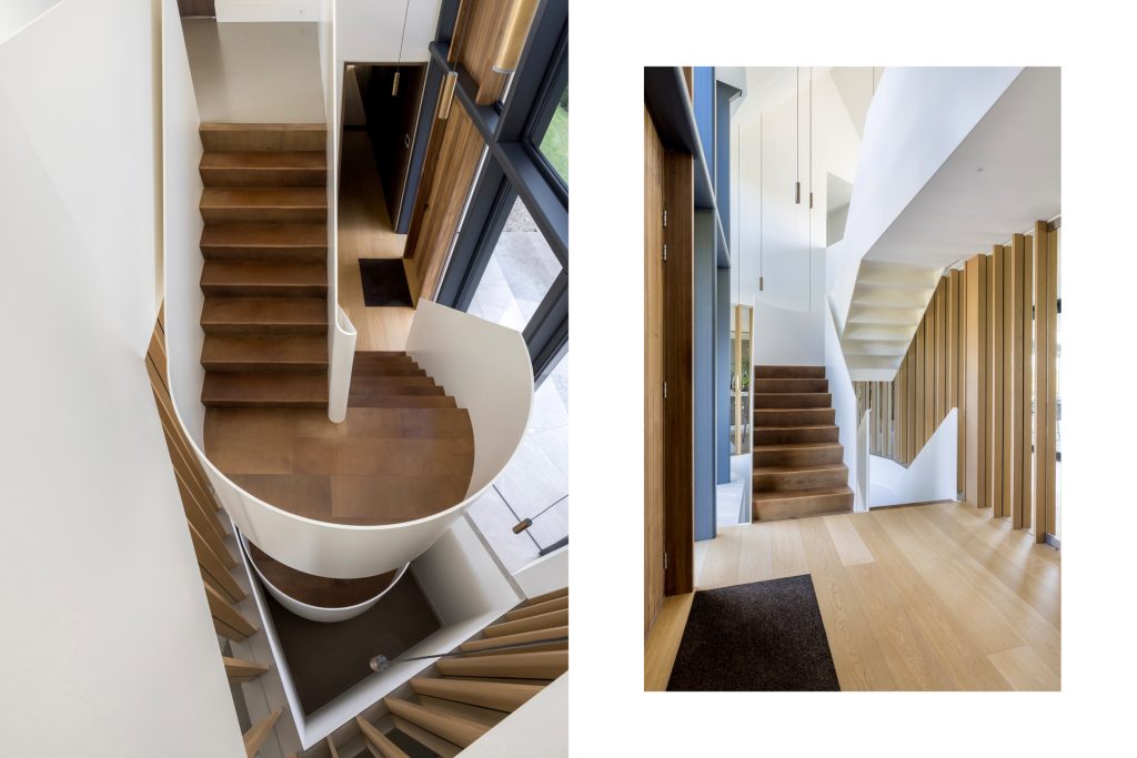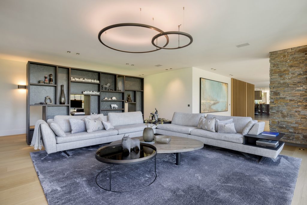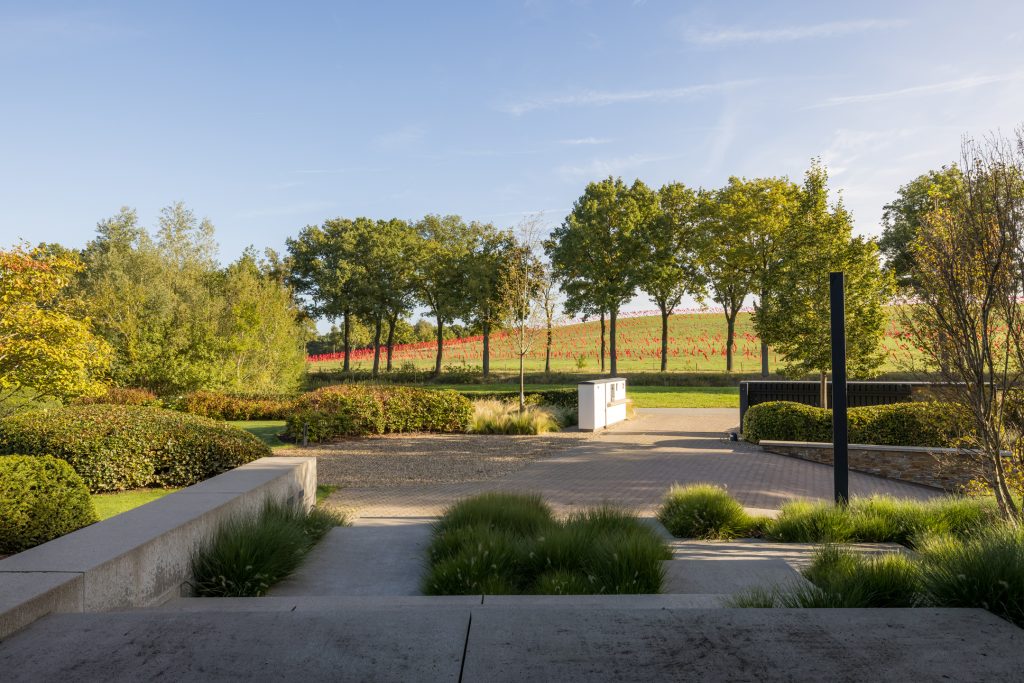 Materialen als warm hout, wit stucwerk, breuksteen en een modern rietdak zorgen voor een vriendelijke en tijdloze uitstraling. Grote raampartijen halen het licht en het landschap naar binnen. Zelfs het souterrain – bereikbaar via een cortenstalen trap als rode loper door het landschap – ademt deze visie, met een riante gym, wijnkamer en zicht op de tuin.