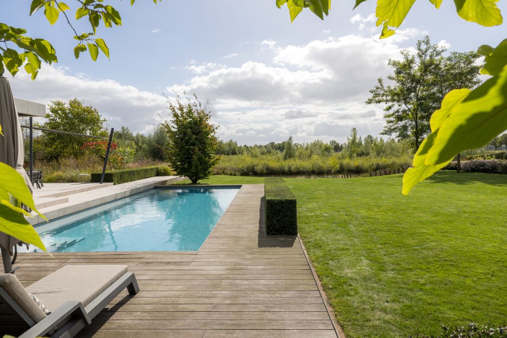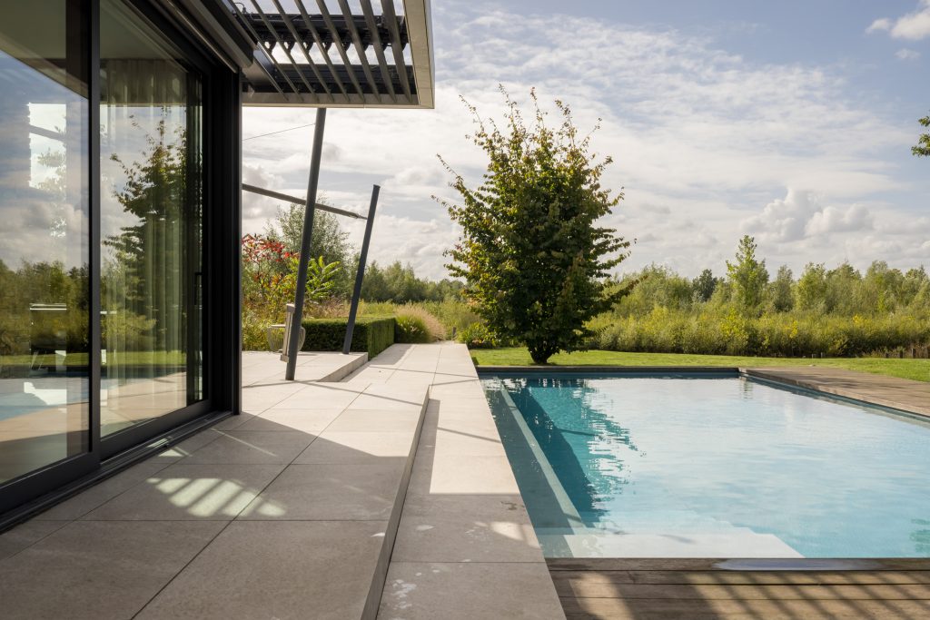 Het ingetogen karakter aan de voorzijde garandeert maximale privacy, terwijl de achterzijde volledig opent naar de schitterend aangelegde tuin met zwembad, buitenkeuken en meerdere zichtlijnen die steeds een ander perspectief bieden.