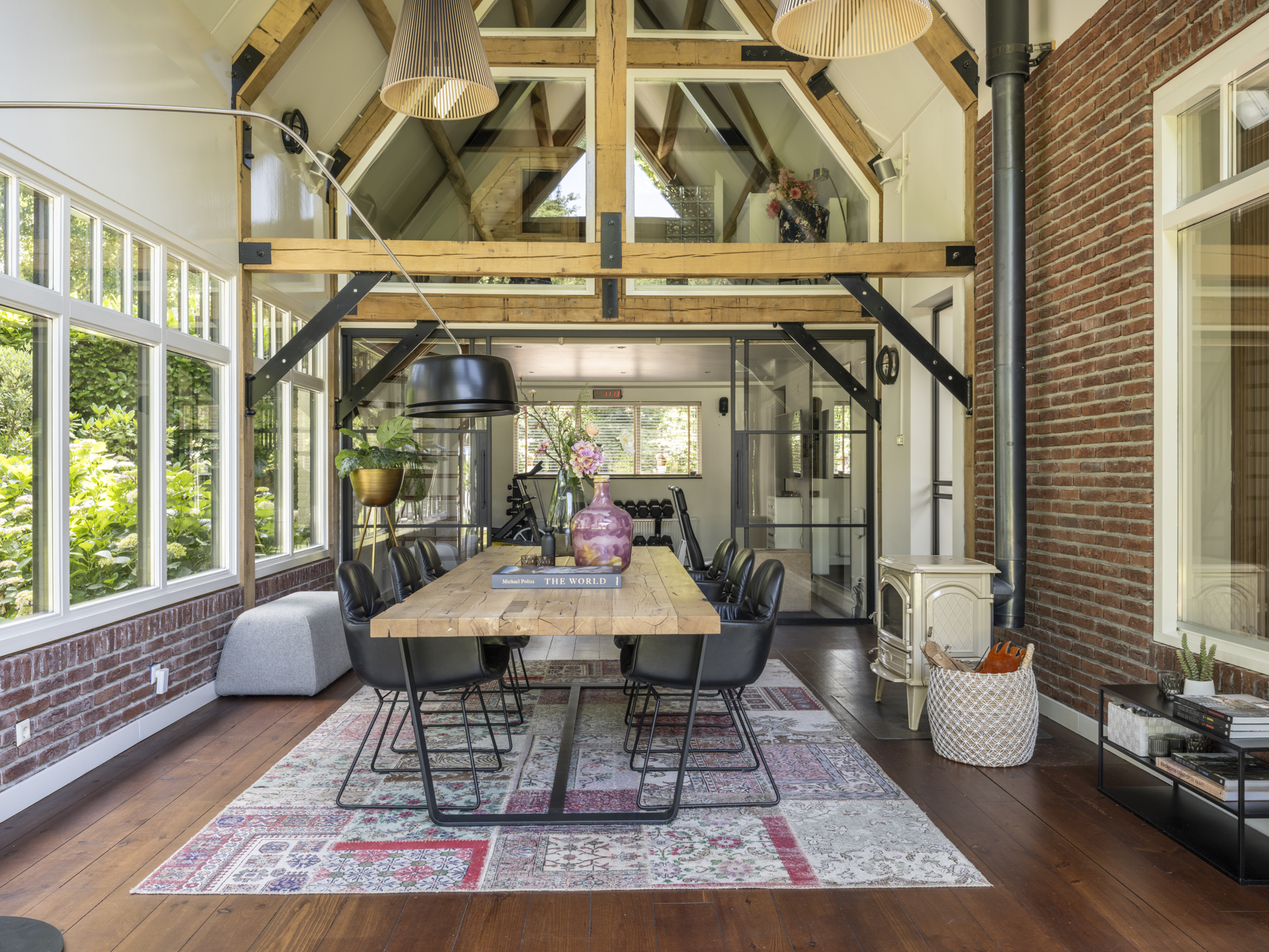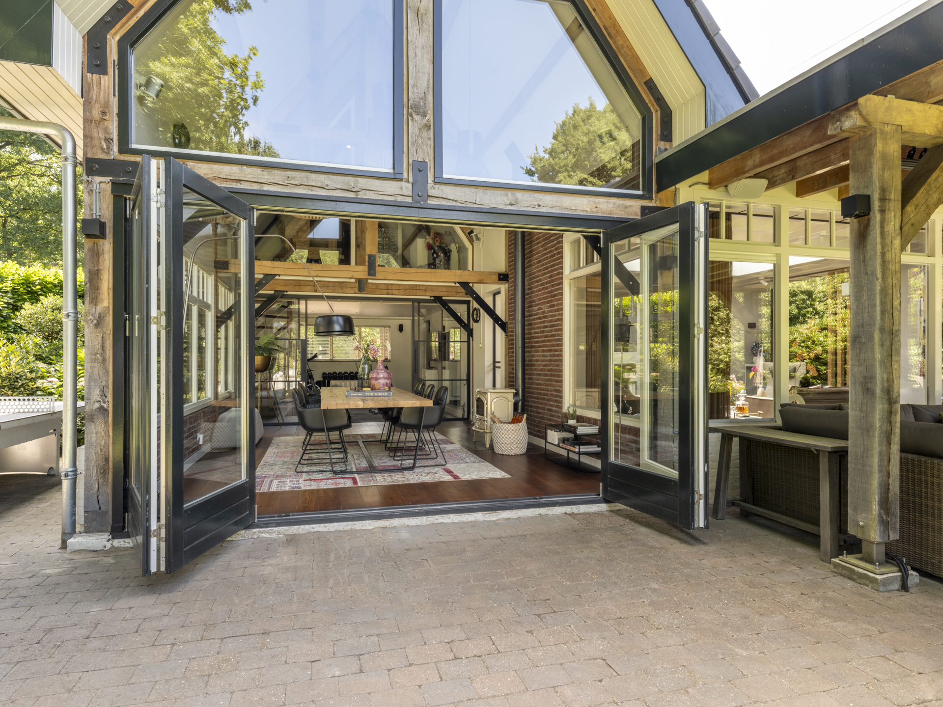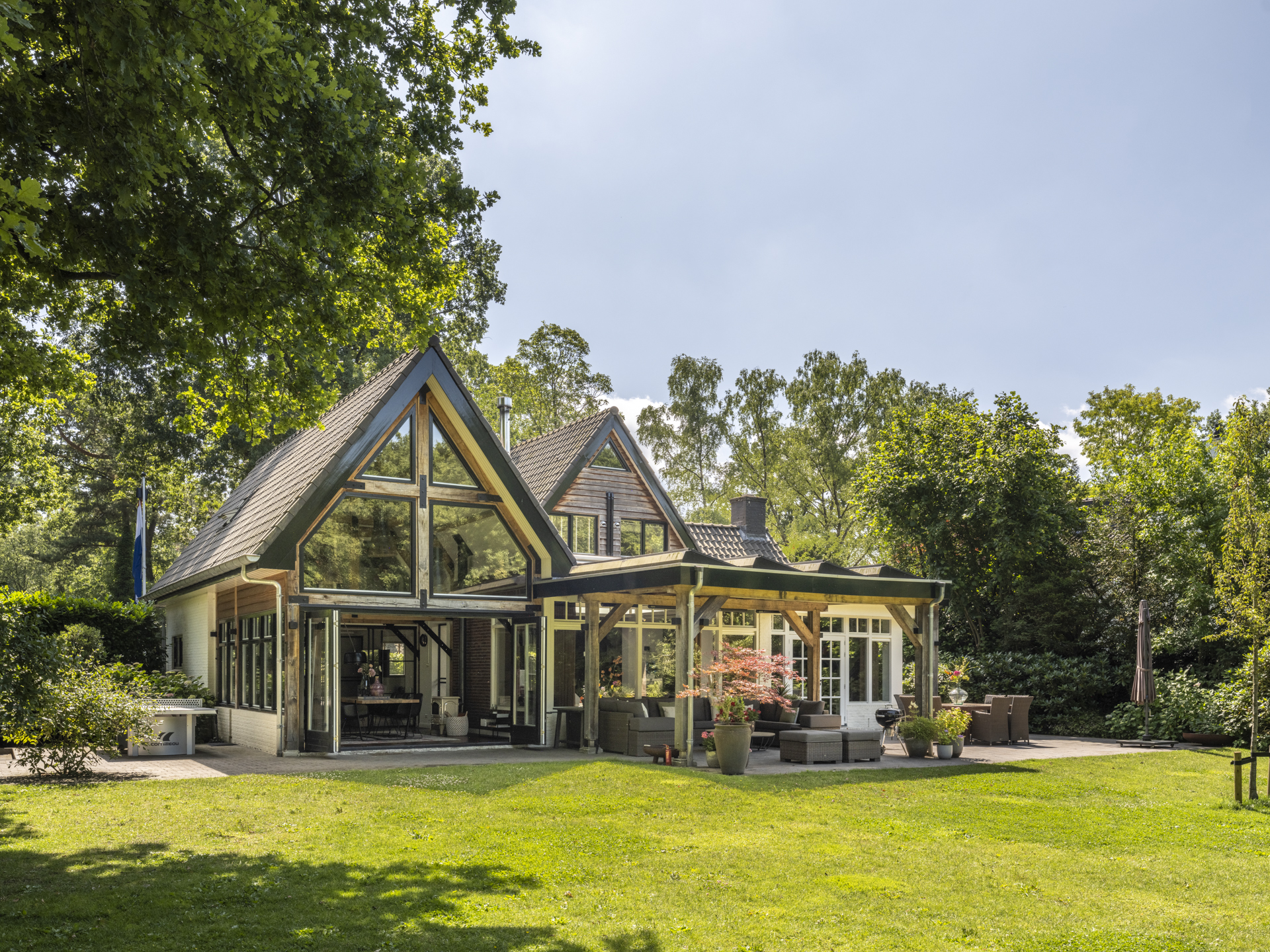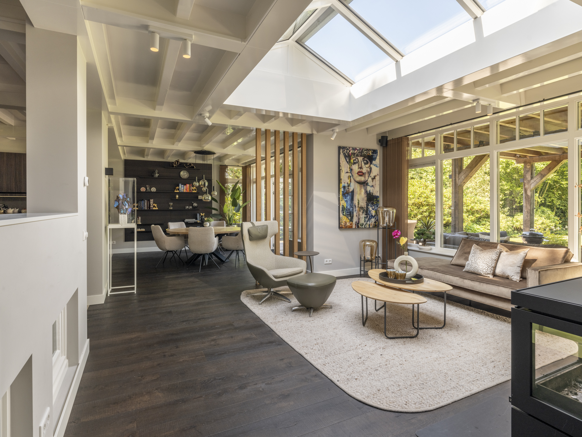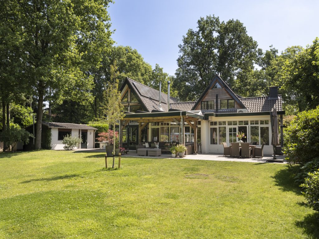 Bij binnenkomst valt direct de ruimte en lichtinval op. De hal geeft toegang tot een kantoorruimte, TV-kamer, kelderkast, toilet en meterkast. De royale woonkamer aan de achterzijde heeft openslaande deuren naar de tuin, een open haard en veel raampartijen die zicht geven op het achterliggende groen. De moderne leefkeuken fungeert als hart van het huis en vormt een heerlijke ruimte om de dag door te brengen. De luxe keuken is voorzien van een royaal kookeiland, hoogwaardige inbouwapparatuur en veel kastruimte. Aansluitend een gezellige opkamer. Naast de living is er een gezellige tuinkamer met houtkachel. De bijzondere raampartijen tot in de nok geven een prachtige lichtinval en dat gecombineerd met de houten balken in het zicht, maken het tot een bijzonder geheel. De gymruimte met bovengelegen wellness-ruimte maakt het plaatje compleet voor wie luxe en ontspanning zoekt in eigen huis.