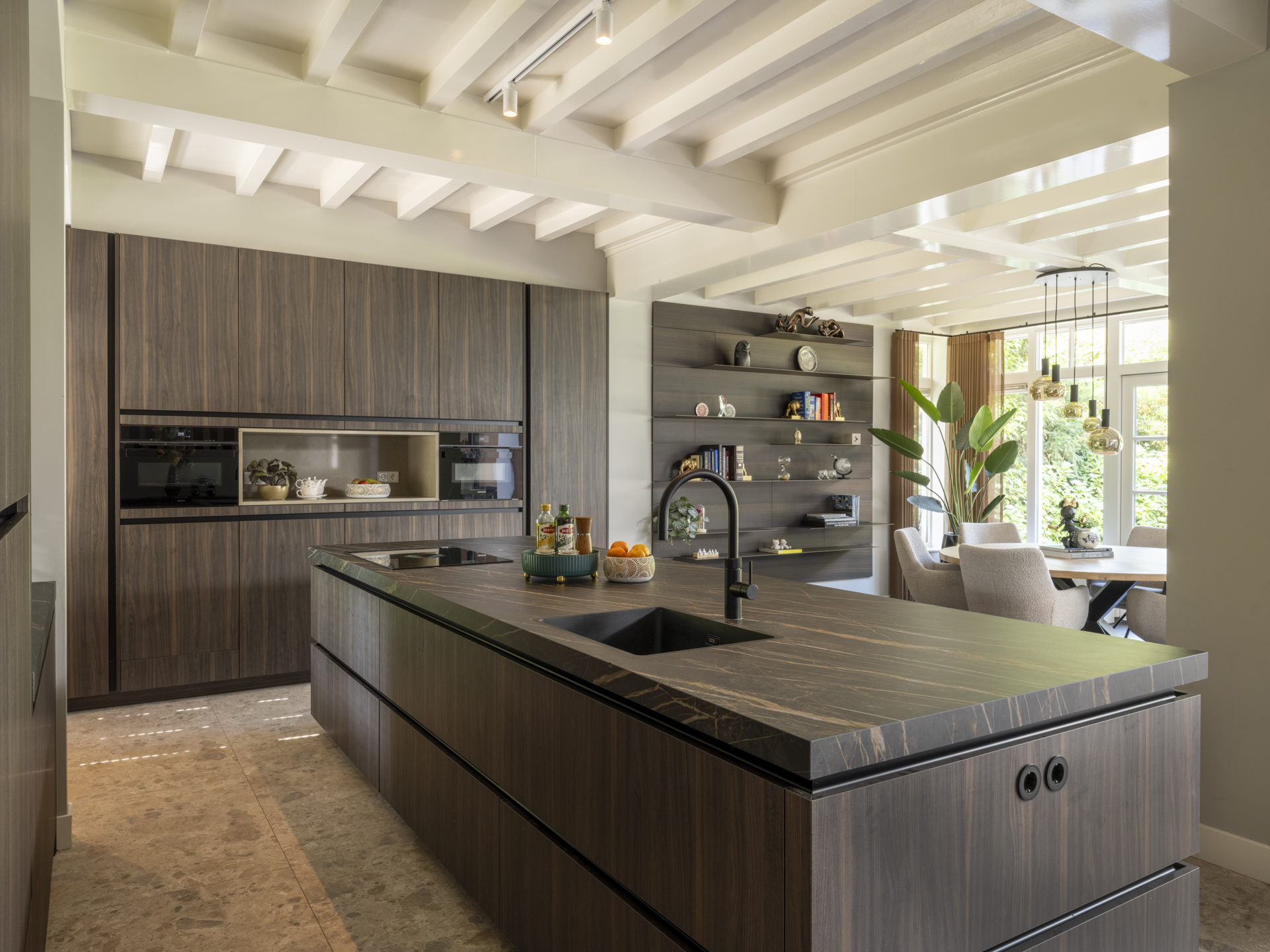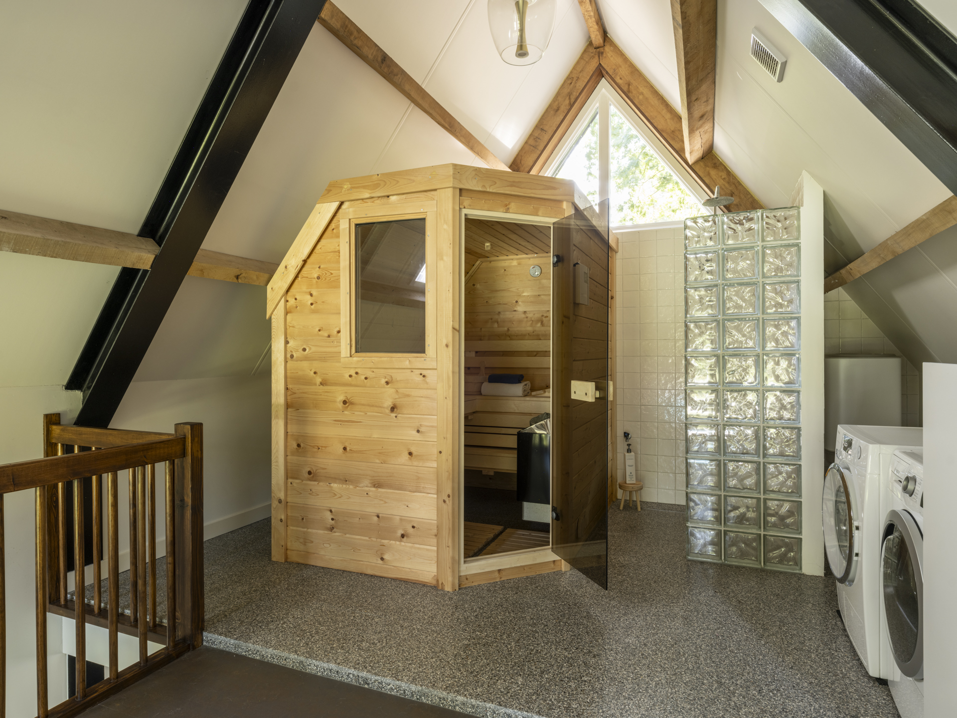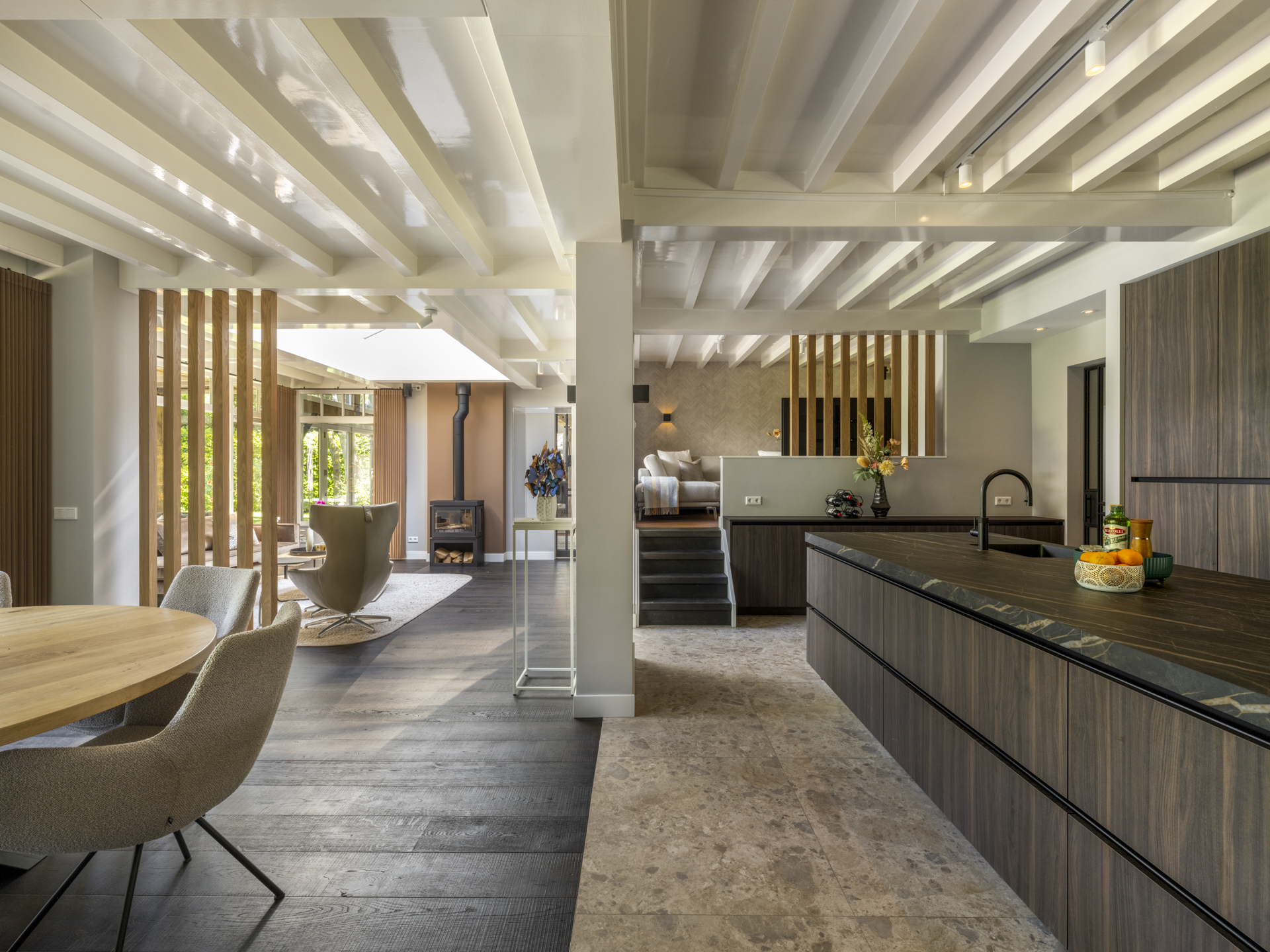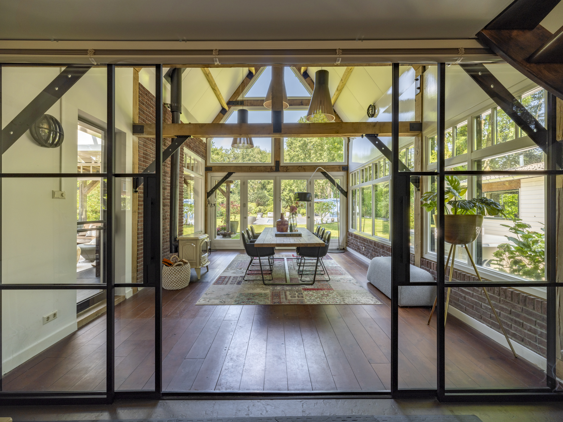Bij binnenkomst valt direct de ruimte en lichtinval op. De hal geeft toegang tot een kantoorruimte, TV-kamer, kelderkast, toilet en meterkast. De royale woonkamer aan de achterzijde heeft openslaande deuren naar de tuin, een open haard en veel raampartijen die zicht geven op het achterliggende groen. De moderne leefkeuken fungeert als hart van het huis en vormt een heerlijke ruimte om de dag door te brengen. De luxe keuken is voorzien van een royaal kookeiland, hoogwaardige inbouwapparatuur en veel kastruimte. Aansluitend een gezellige opkamer. Naast de living is er een gezellige tuinkamer met houtkachel. De bijzondere raampartijen tot in de nok geven een prachtige lichtinval en dat gecombineerd met de houten balken in het zicht, maken het tot een bijzonder geheel. De gymruimte met bovengelegen wellness-ruimte maakt het plaatje compleet voor wie luxe en ontspanning zoekt in eigen huis.