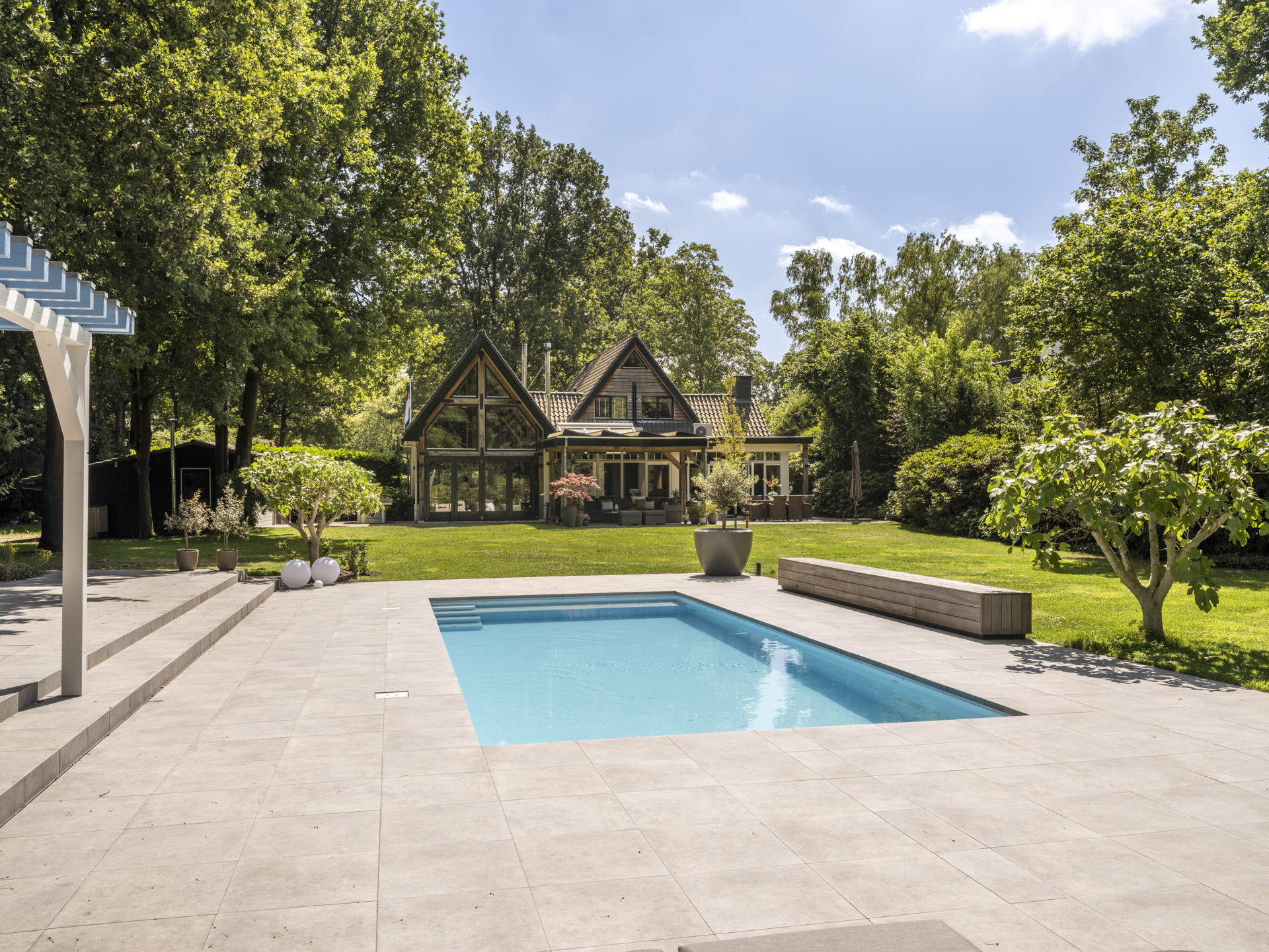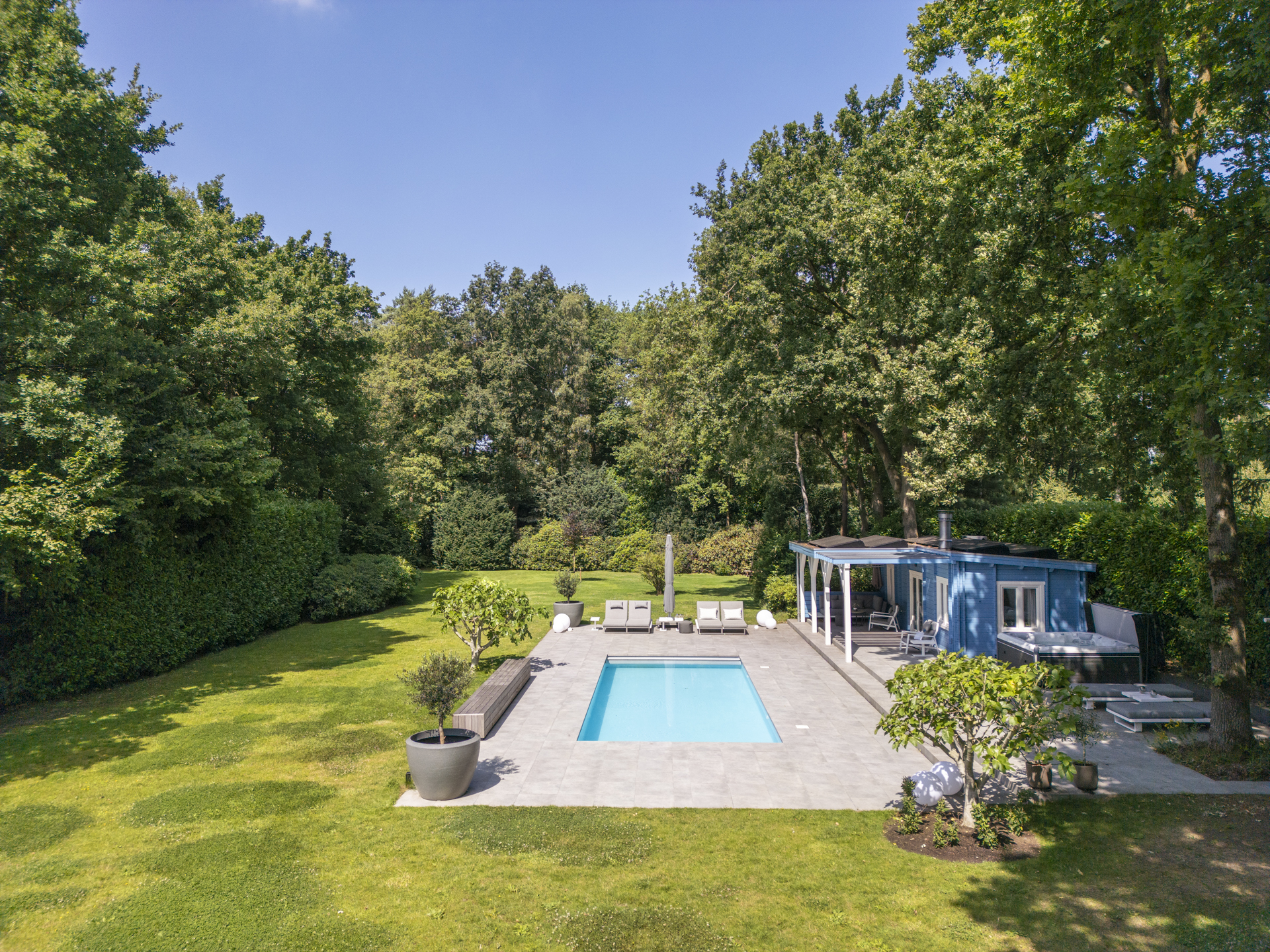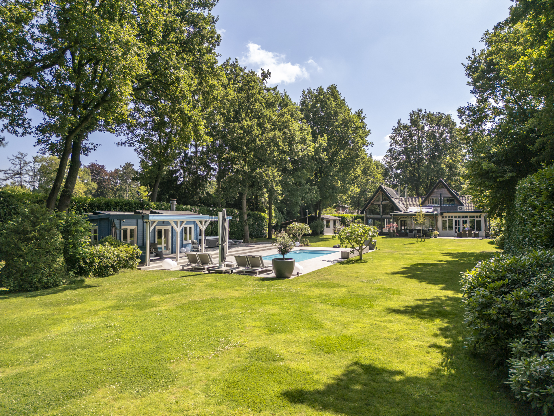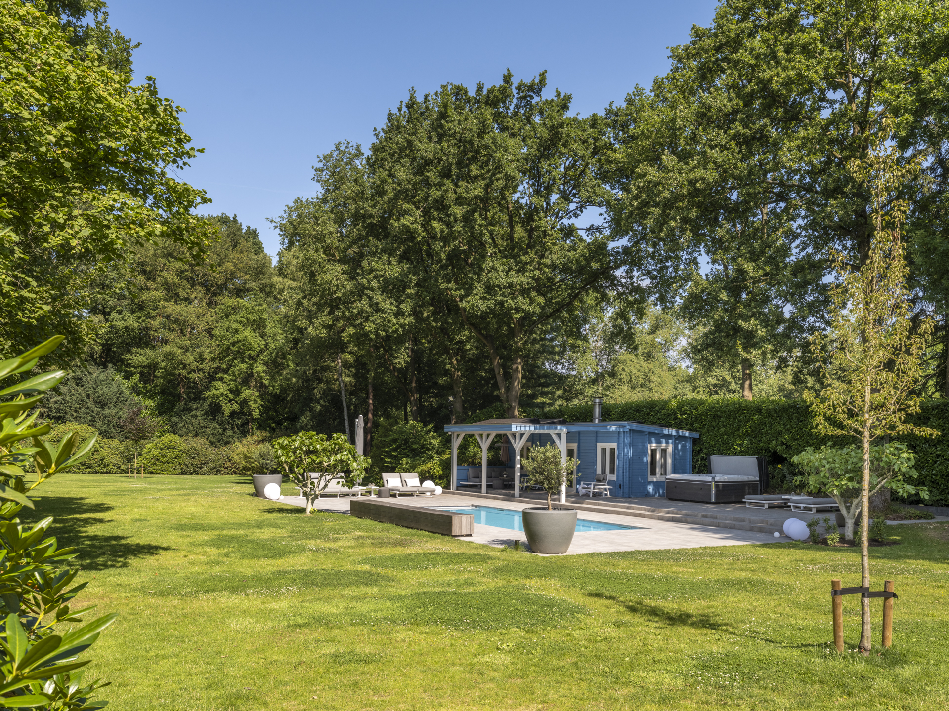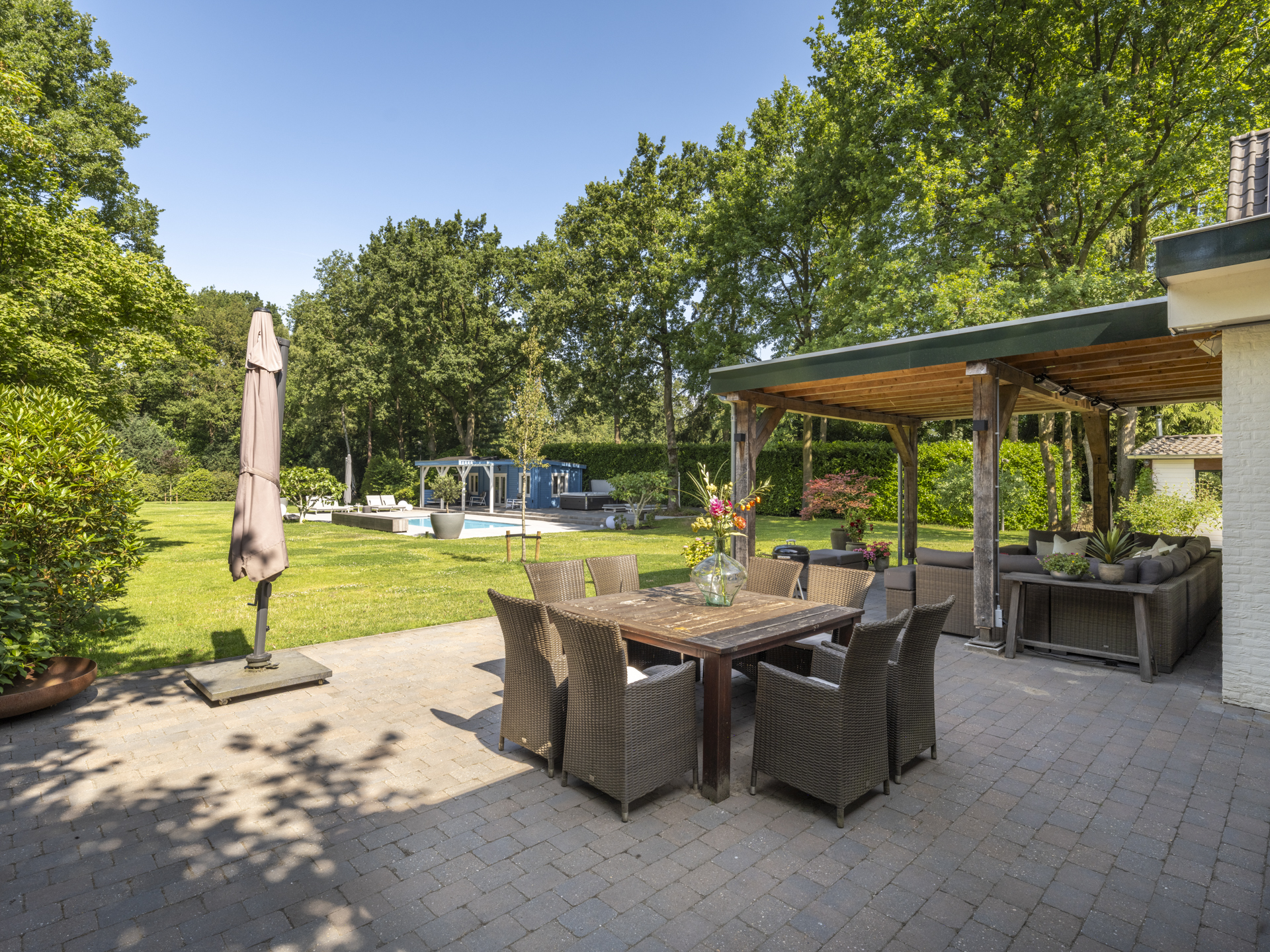 De achtertuin is werkelijk indrukwekkend: uitgestrekt, groen, volledig omsloten en met optimale privacy. Hier vindt u meerdere zon- en schaduwterrassen, een royaal gazon, volwassen beplanting, een verwarmd zwembad met zonneterras en een jacuzzi. Aan de zijkant bevindt zich een grote berging met carport en oprit welke ruimte biedt aan meerdere auto’s.