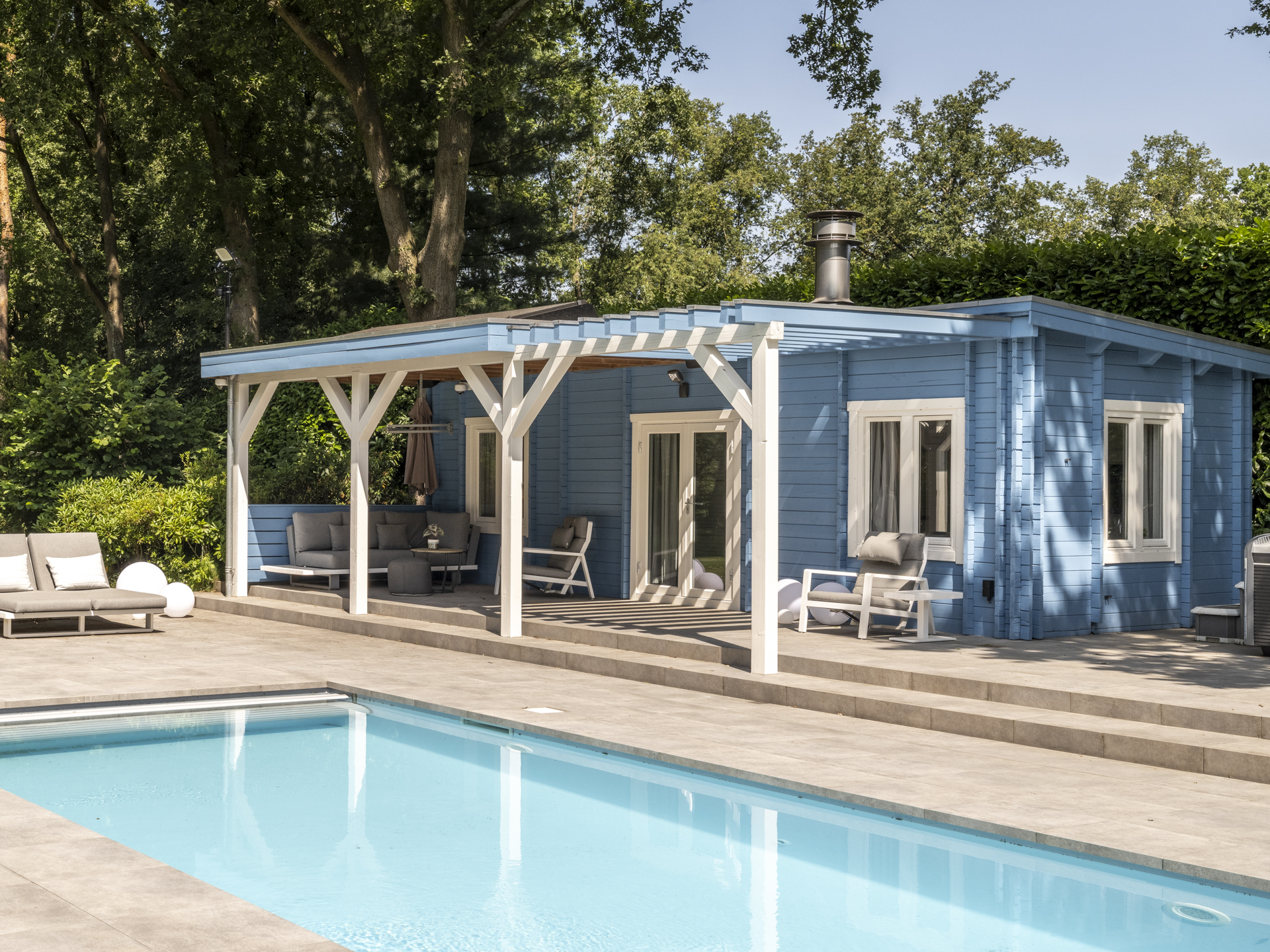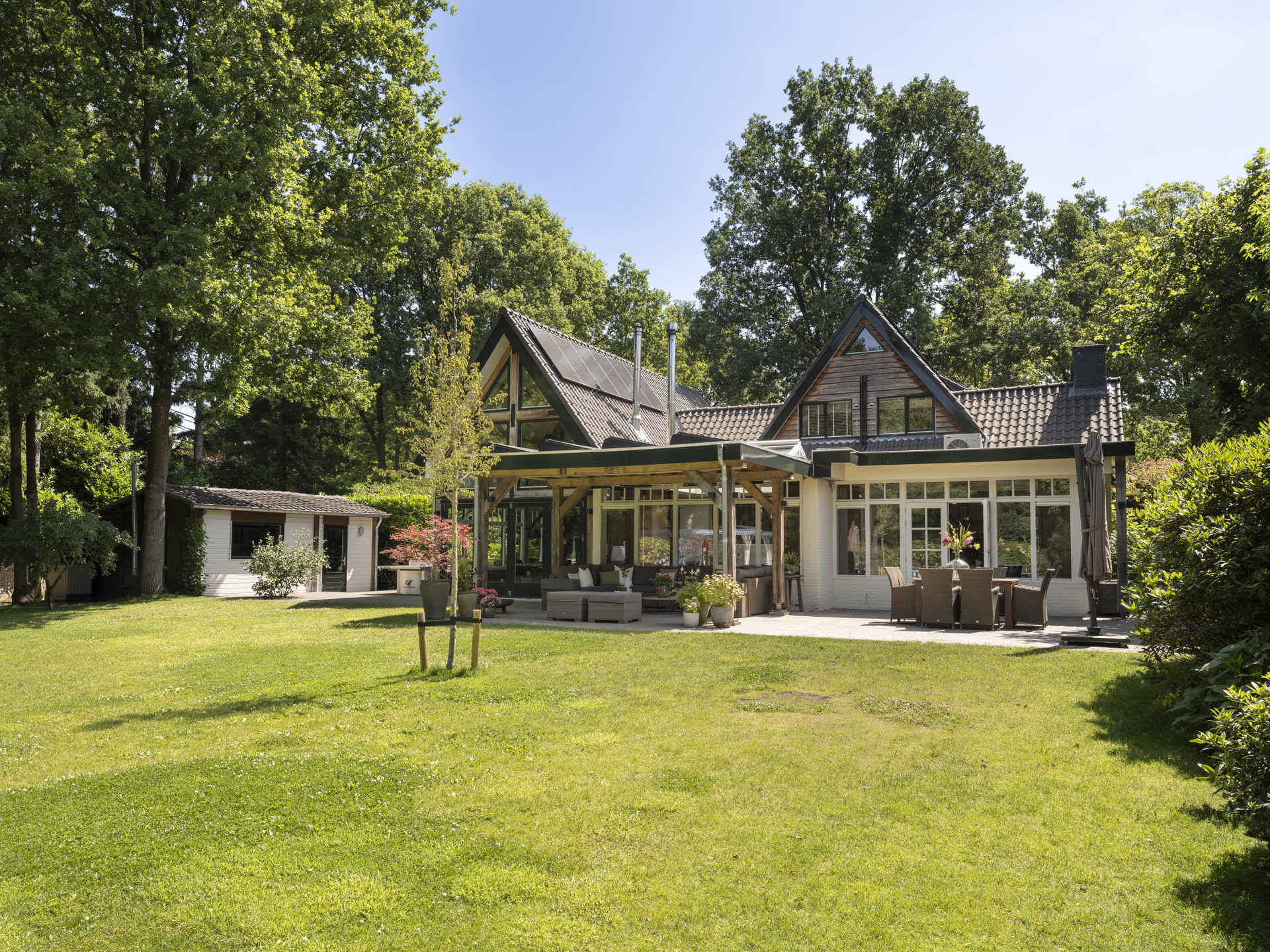 In de tuin bevindt zich een volwaardig bijgebouw met woonkamer, keuken, badkamer en slaapkamer. Perfect voor gasten, mantelzorg of als kantoor aan huis. Daarnaast beschikt het bijgebouw over een overkapping, ideaal voor lange zomeravonden.