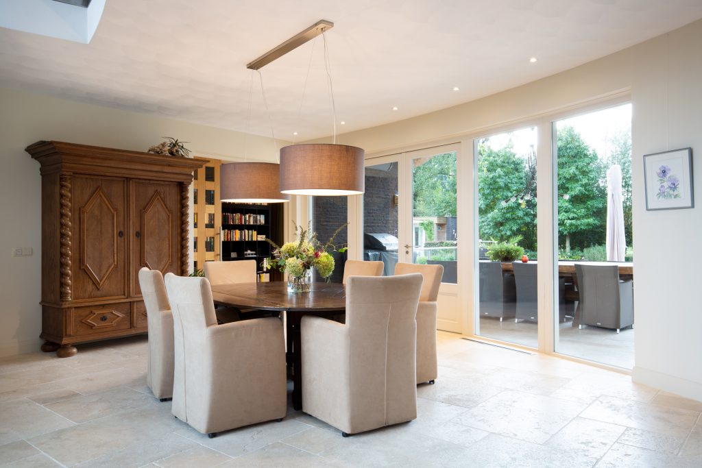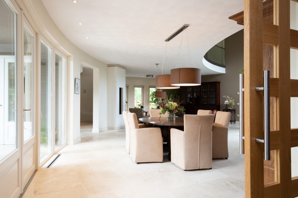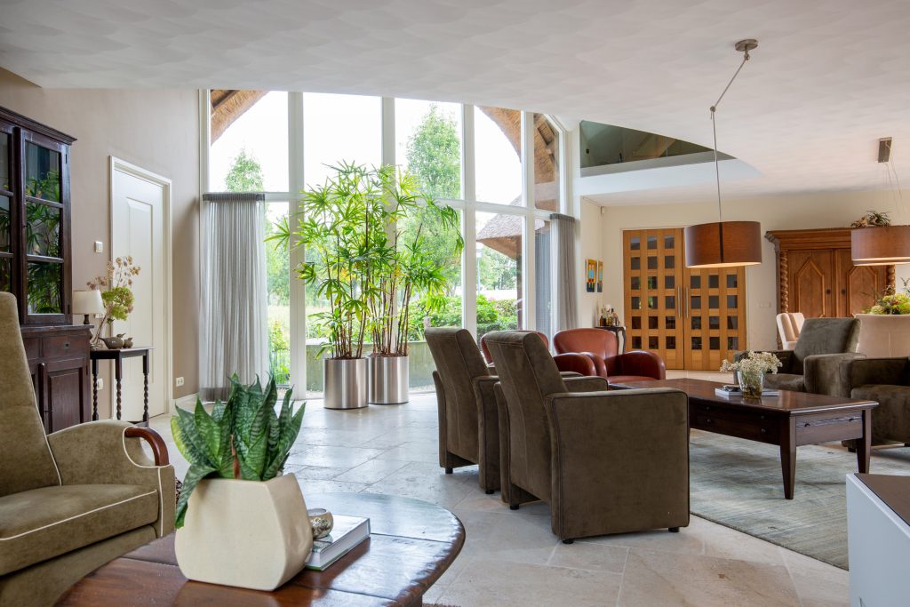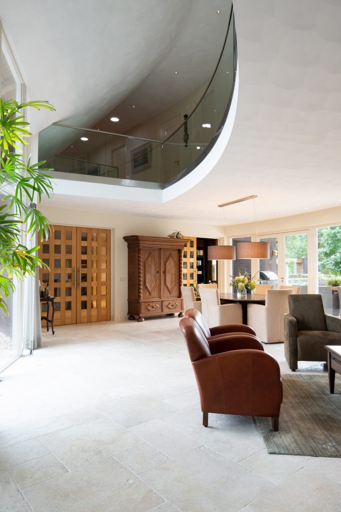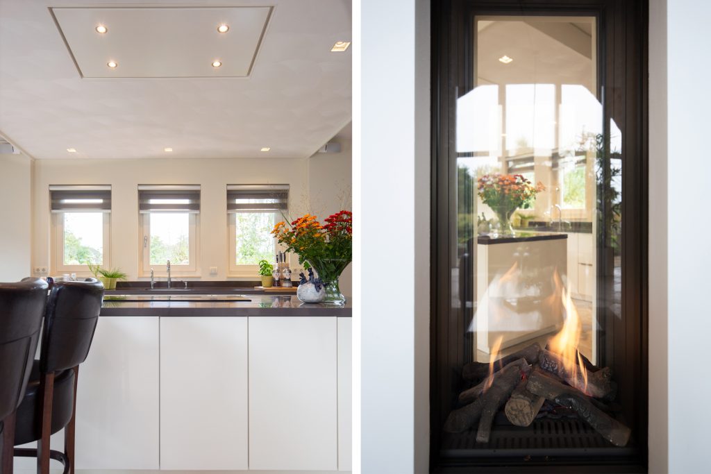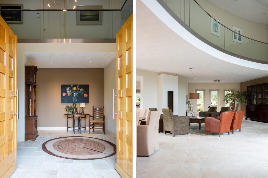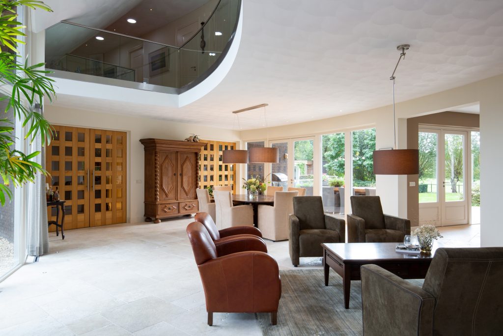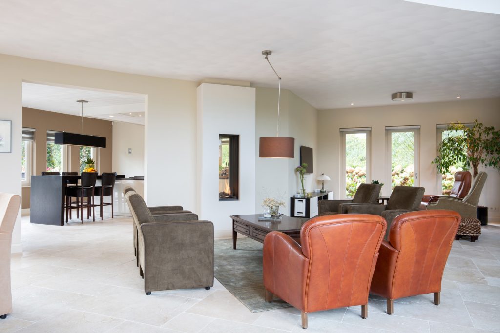Riant en licht woongedeelte. U kunt deze behaaglijke ruimte bereiken via de entree of via de rechtervleugel. In het woonvertrek ligt een marmeren tegelvloer met vloerverwarming. Er is opmerkelijk veel en fraai lichtinval via de vele raampartijen en de openslaande tuindeuren U geniet van de doorkijk (gas) haard in zowel het zitgedeelte als de keuken.