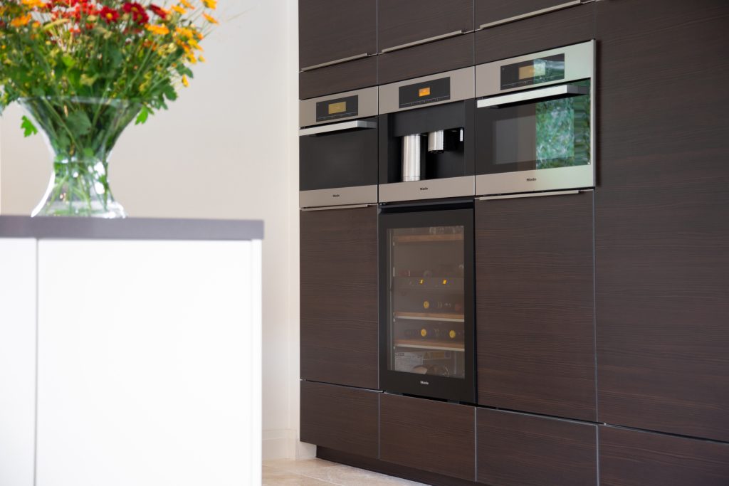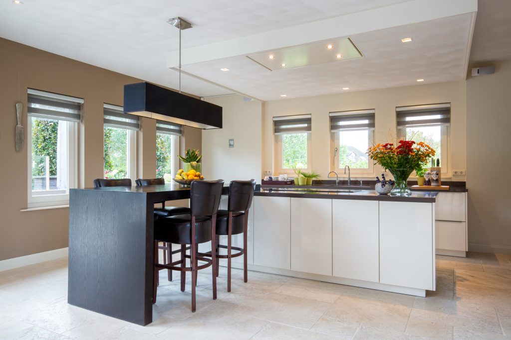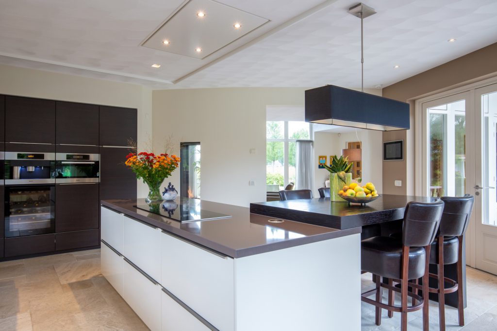 Aan de achterzijde van de woning is de leef-/woonkeuken gesitueerd. Er is volop kastruimte (lades, apothekerskast en kasten) en er is een zithoek voor 4-personen. Er wordt op inductie gekookt en het afzuigsysteem is in het plafond verwerkt. De keuken beschikt over diverse inbouwapparatuur, hierbij moet u denken aan: Quooker, koelkast + vriezer, oven-/ magnetron combinatie, stoomoven, koffieautomaat, vaatwasser en wijnkoeler.