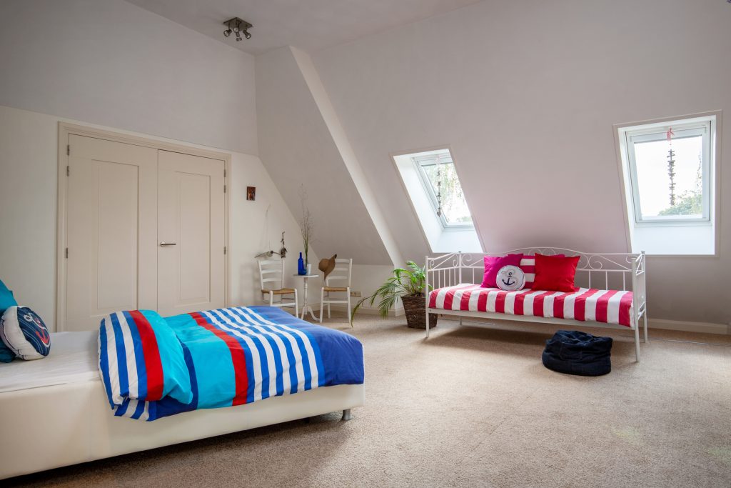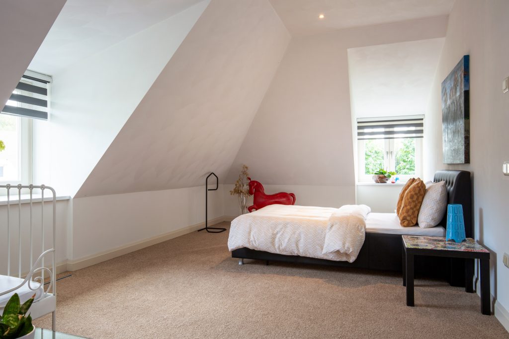 Riante slaapkamer (ca. 6m x 4m) voorzien van vloerbedekking, 2 dakkapellen en een grote inloopkast. De ramen zorgen voor veel lichtinval.