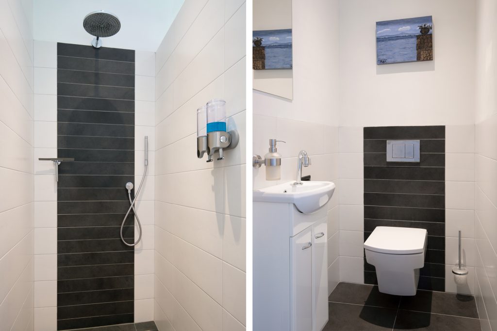 In deze ruimte is een toilet, inloopdouche, wastafel en sauna (infrarood) aanwezig. U kunt via dubbele openslaande deuren het kelder-terras en de tuin bereiken.