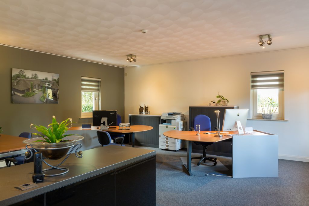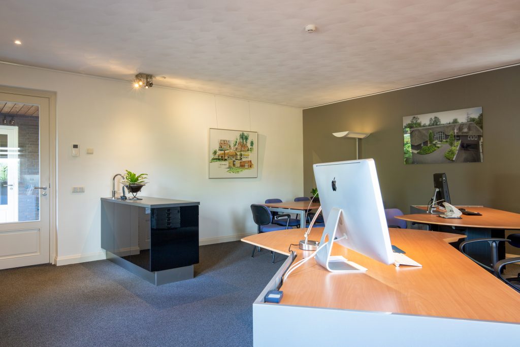 De gehele rechtervleugel van de woning wordt momenteel gebruikt als kantoorruimte. Er is veel lichtinval door de diverse raampartijen rondom. In deze ruimte is al rekening gehouden met het realiseren van een trap, welke u toegang geeft tot de atelierruimte op de 1e verdieping van het woongedeelte, dit ten behoeve van een mogelijke ombouw tot zorgwoning of separaat appartement.