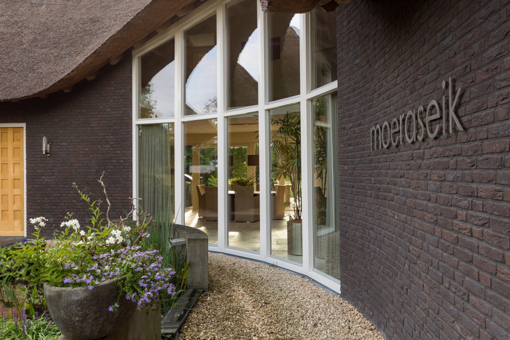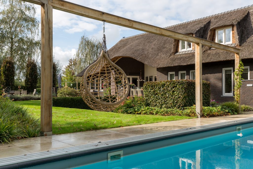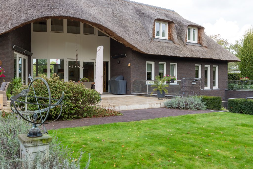 Het riante overdekte terras aan de achterzijde van de woning heeft grote terrastegels waar vloerverwarming onder ligt. Er zijn terras-verwarmers en een tv-aansluiting aanwezig. Ook heeft u een fantastisch zicht op de rietenkap-constructie, afgewerkt met eiken balken.