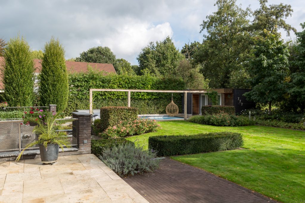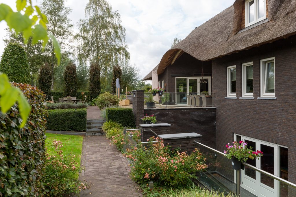 De parkachtige tuin rondom is magnifiek onder architectuur aangelegd. De achtertuin is op het zuiden gelegen en geheel omheind met natuurlijke hagen en een hekwerk. De tuin geniet van een vrij uitzicht en is voorzien van diverse terrassen waardoor u zich op verschillende plekjes kunt genieten van uw tuin en de zon.