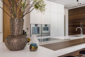 Een corridor met grote schuifpuien verbindt de woonkeuken met de inpandige bijkeuken en de woon-/eetkamer. Het resultaat is een oogstrelende leefruimte van internationale klasse en optimaal uitzicht naar de tuin. Vanuit de woonkamer en eetkamer kijkt u naar de brede doorkijkhaard en aan de voorzijde is de sfeervolle eetkamer. De keuken met op maat gemaakt eiland en Gaggenau inbouwapparatuur biedt zelfs aan de meest verwende kookliefhebber alle denkbare luxe.