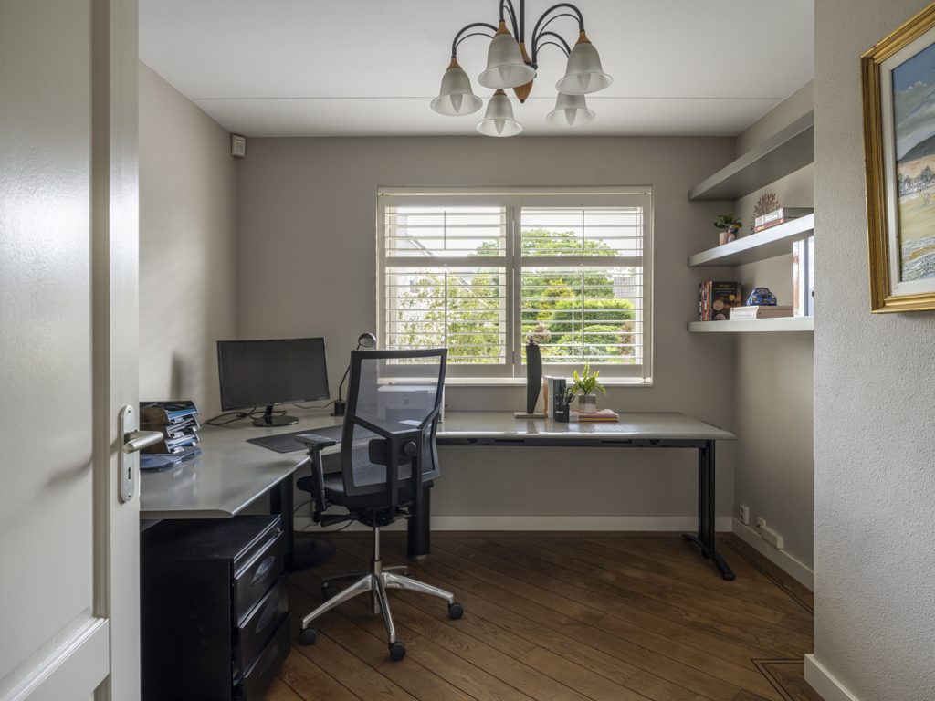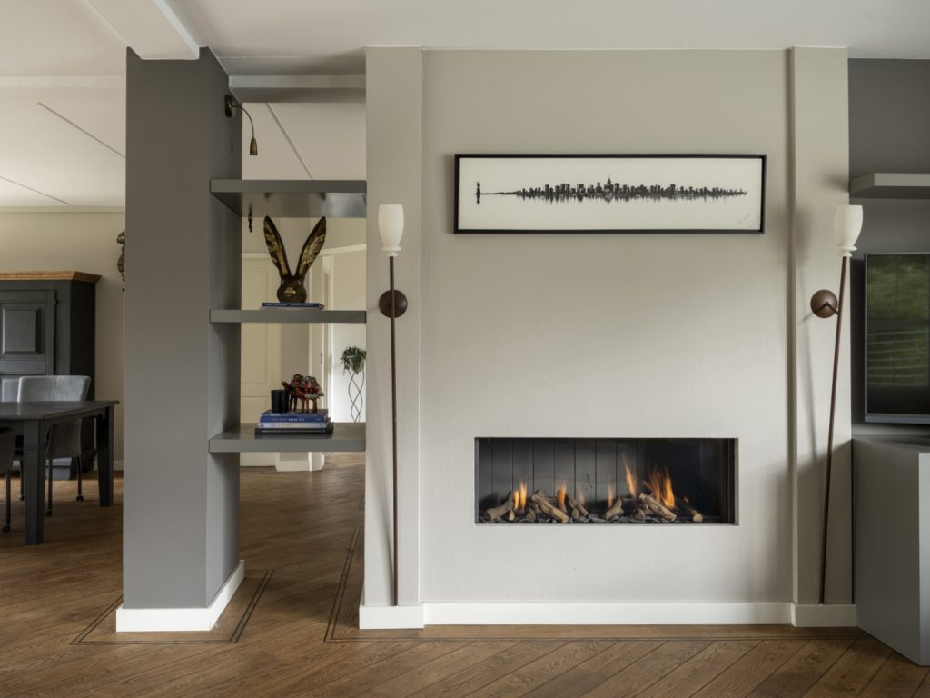 Aan de zonkant van de villa is de stijlvolle woonkamer met fraai uitzicht naar de tuin en een moderne gashaard bij het zitgedeelte. De woonkamer biedt verder ruimte aan een kleine vleugel en een eettafel, waar een diner met vrienden of familie tot een fantastische avond leidt. Achter de haard bevindt zich een werkkamer, die ook als tv-kamer of gameroom gebruikt kan worden.